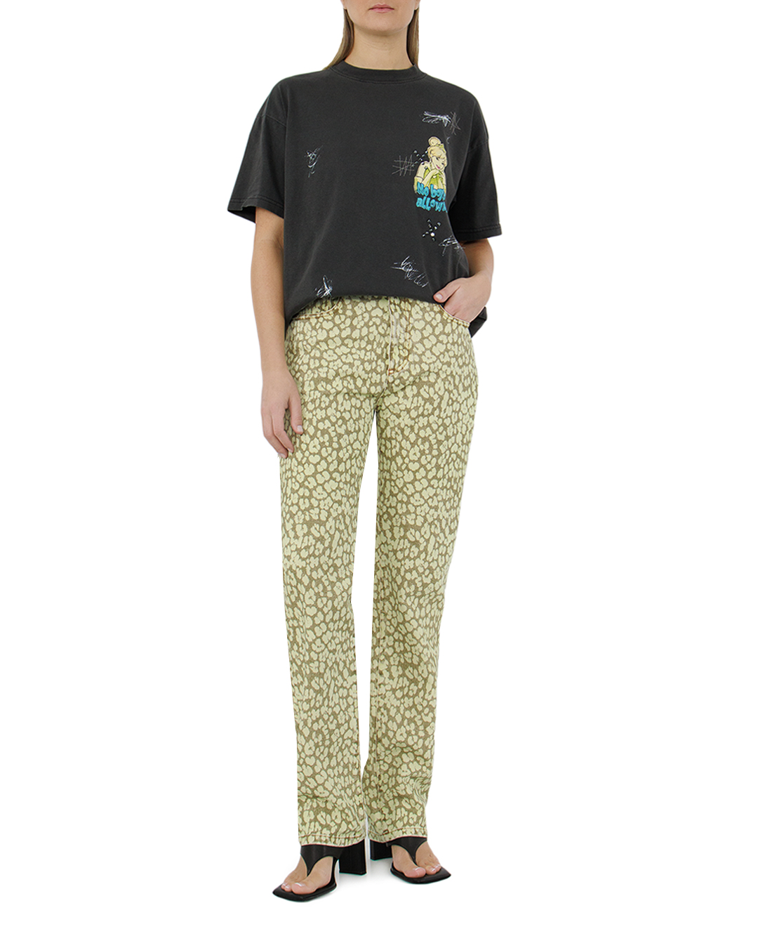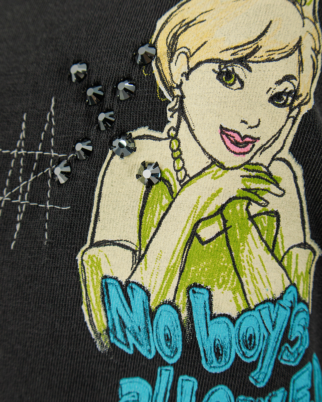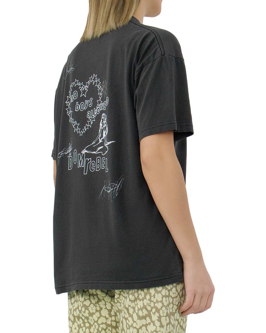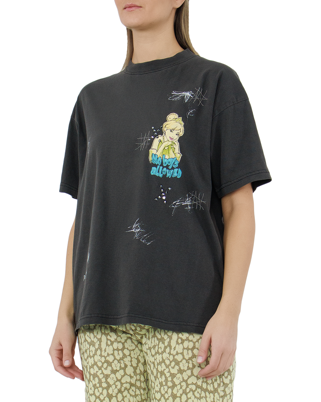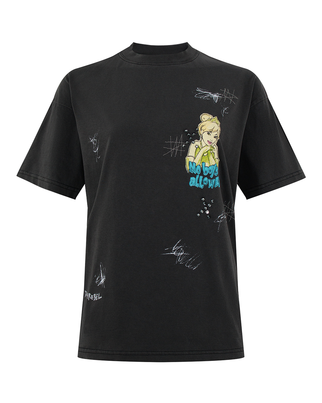 Эта футболка от Dom Rebel представляет собой пример элегантной и креативной уличной моды. Изготовленная из высококачественного хлопка, она отличается свободным кроем, предлагая комфорт и стиль. Чёрный цвет придаёт модели универсальность, делая её отличным выбором для базовых арт-фэшн комплектов. Декор включает мультяшный персонаж с игривой надписью «No boys allowed», выполненной в ярких оттенках с использованием техник аппликации и вышивки, что придаёт объём и текстурность. Инновационное использование страз добавляет блеска и обеспечивает интересный контраст между гладкостью ткани и деталями декора. Элементы, напоминающие небрежные зарисовки, добавляют дерзости и подчёркивают артистичность изделия. Чёрный фон усиливает воздействие красочных деталей, придавая футболке драматичность и современную дерзость, идеально подходящую для создания выразительных и модных образов.