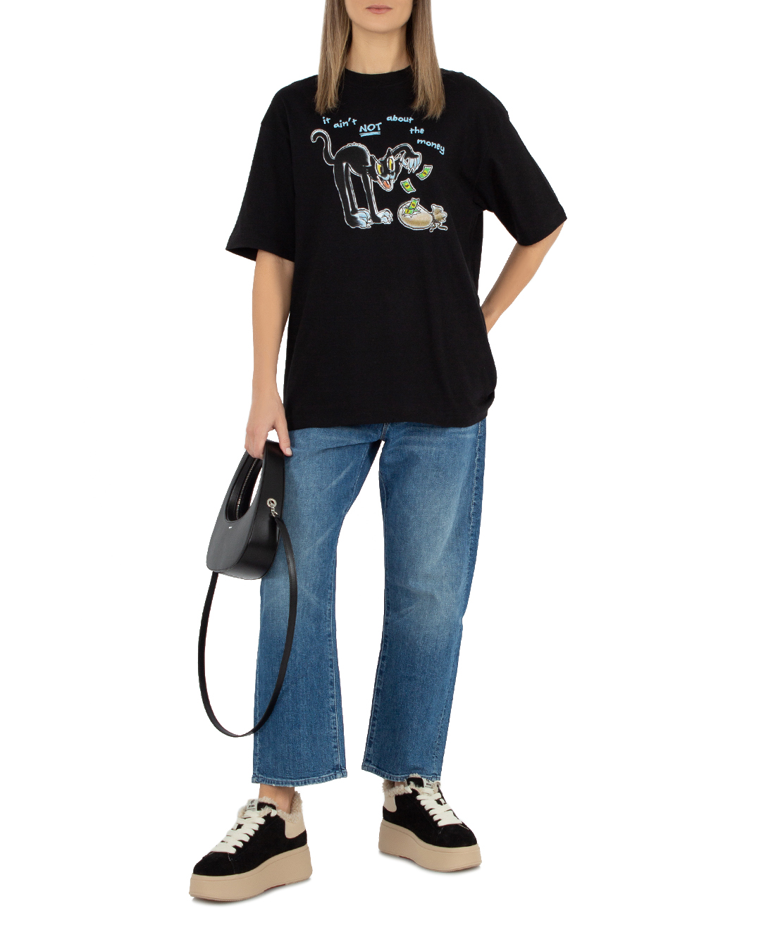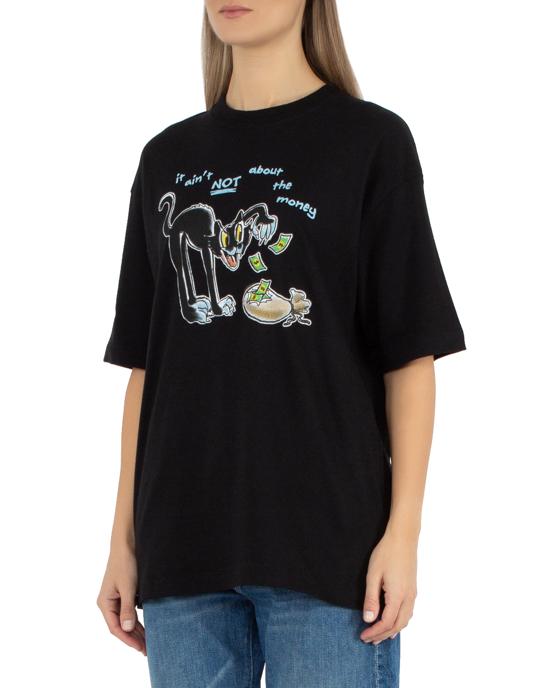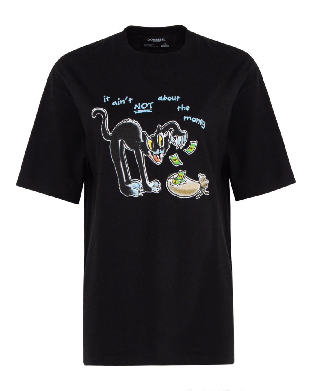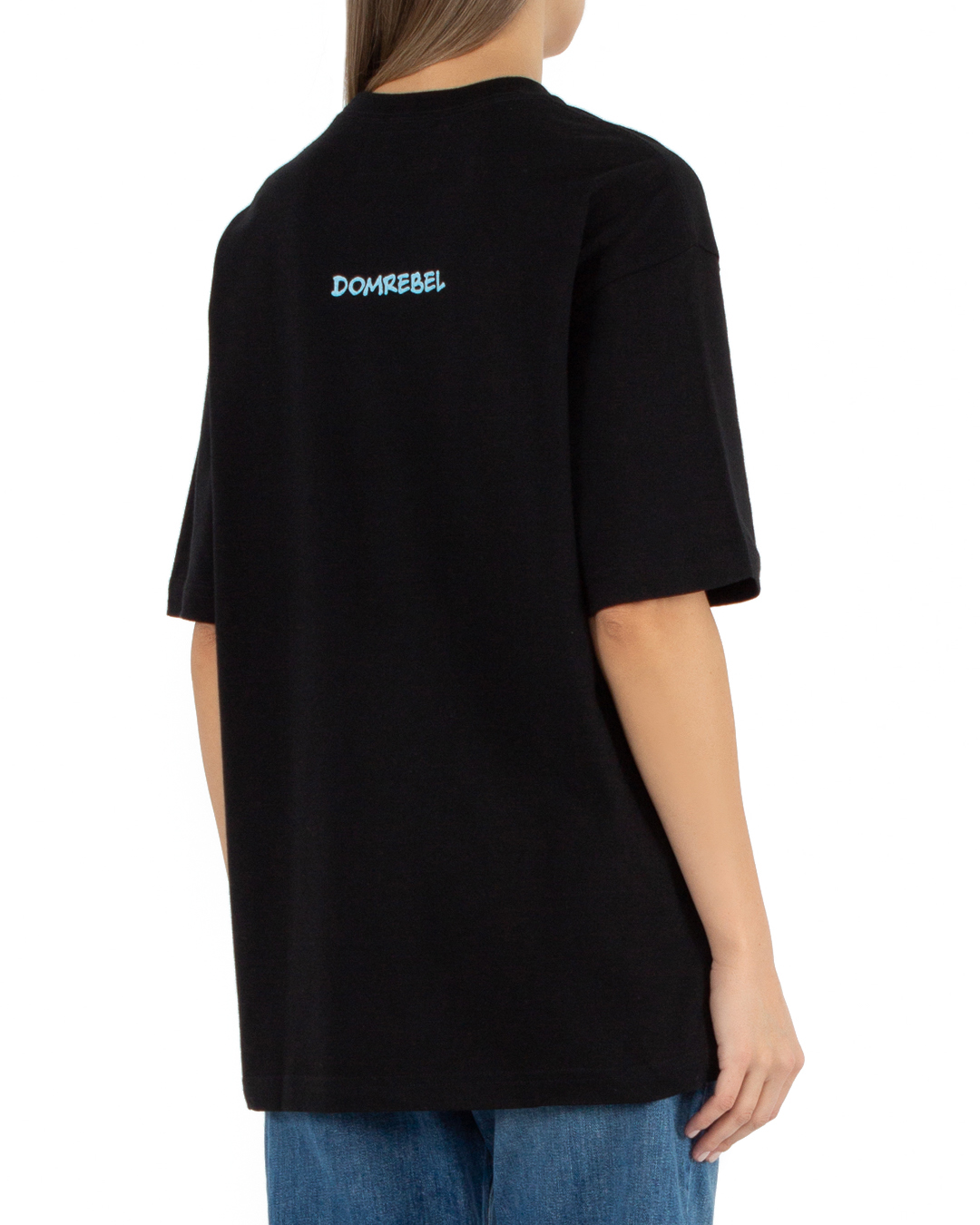 Футболка Dom Rebel сшита из трикотажного хлопка с принтом и логотипом бренда. Модель прямого свободного силуэта с круглой линией выреза и короткими широкими рукавами.