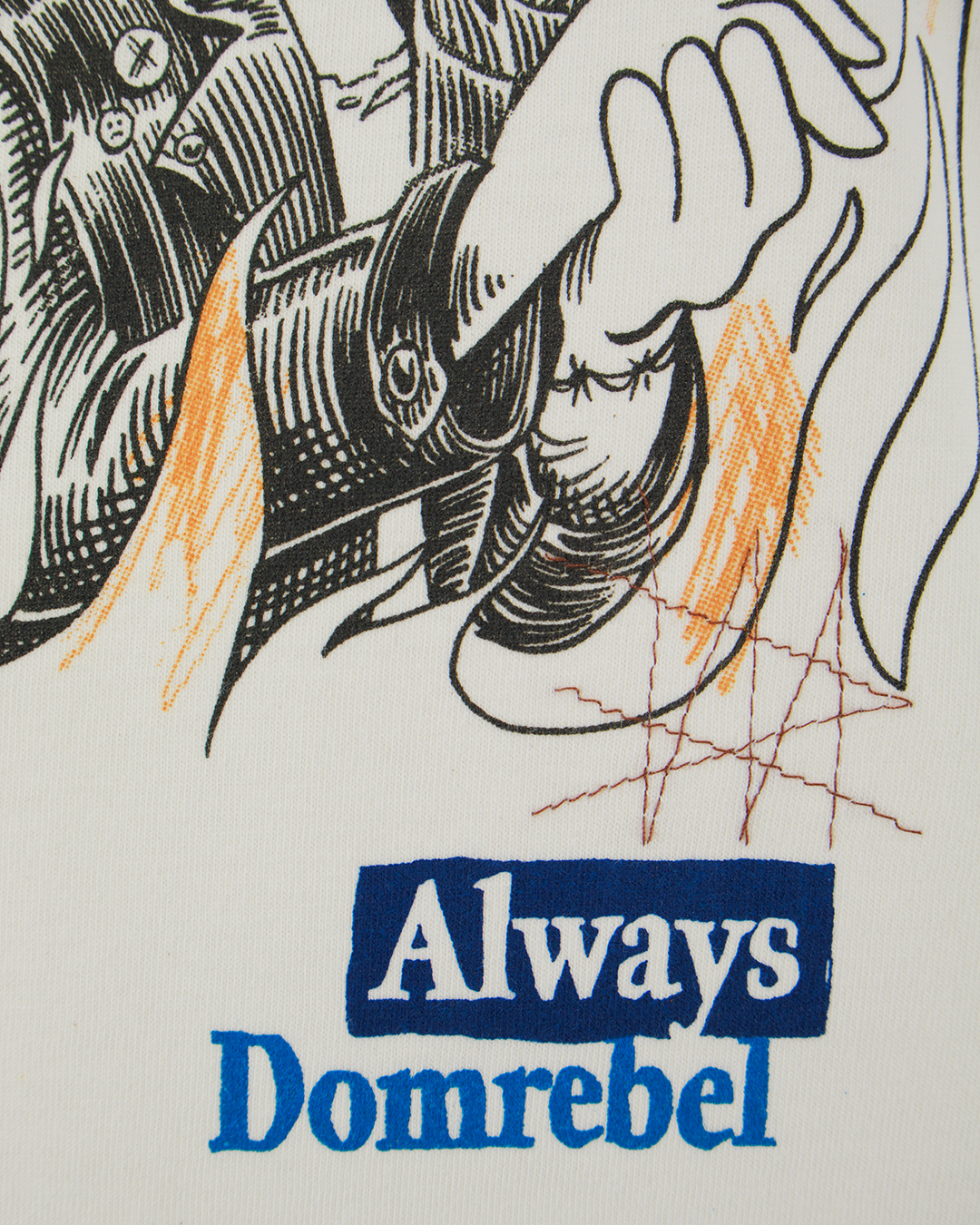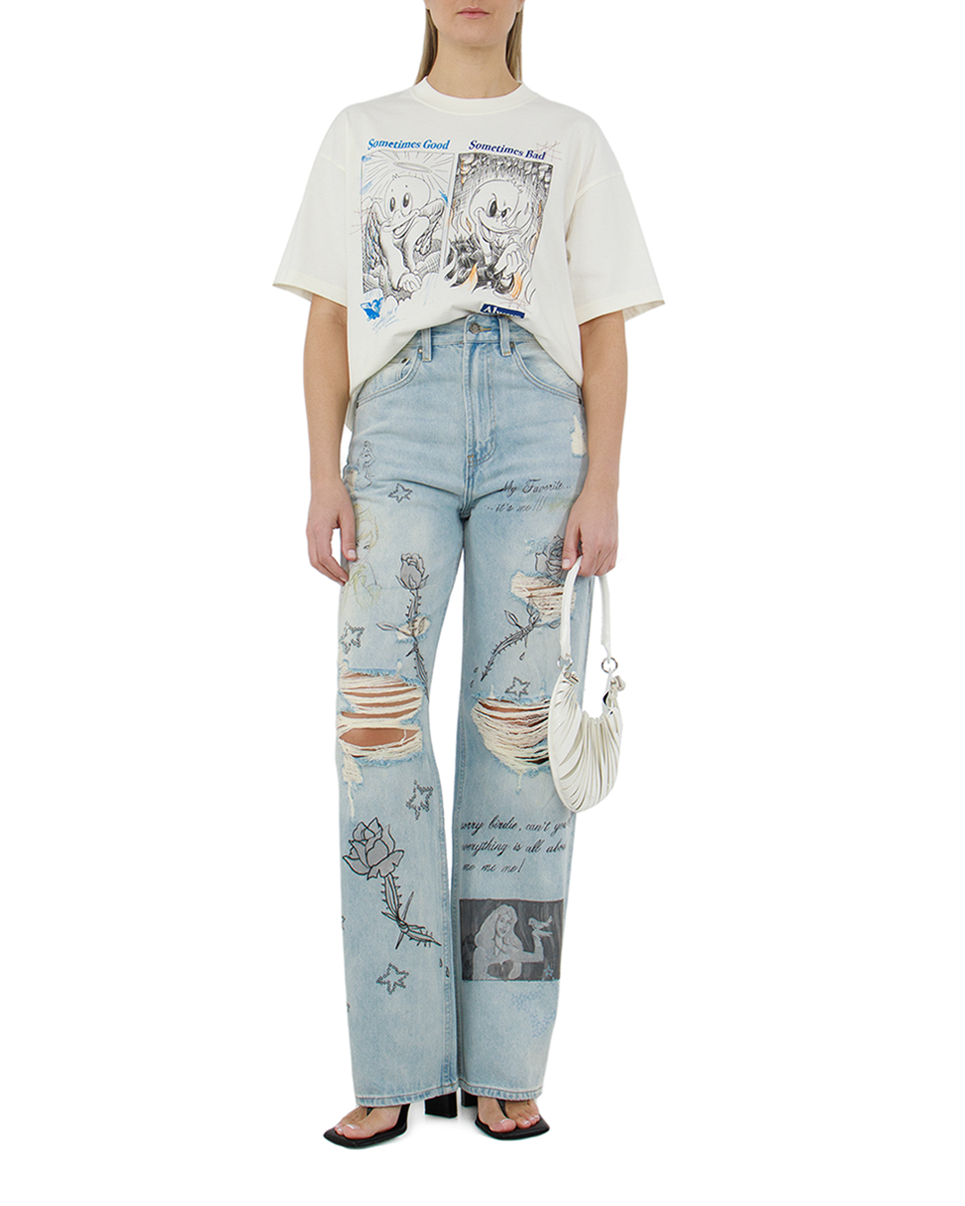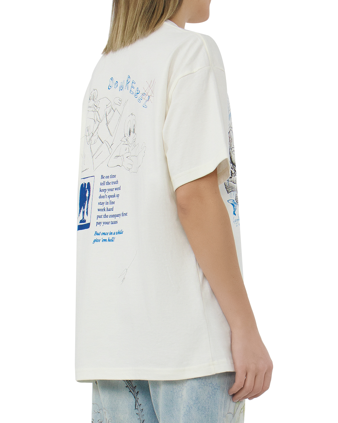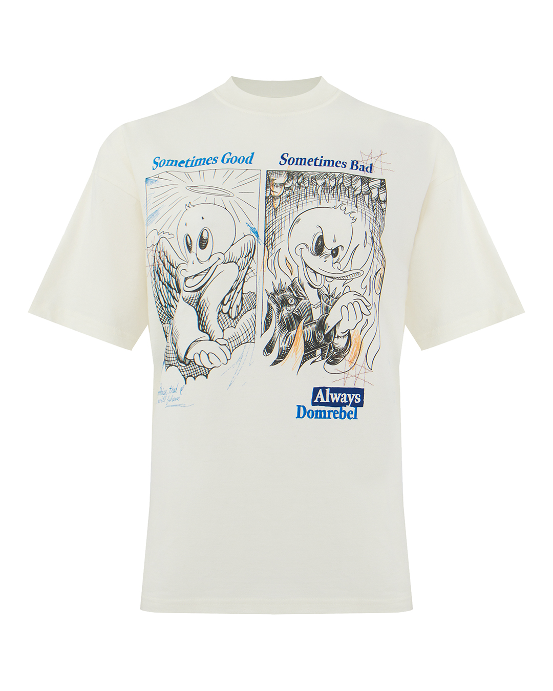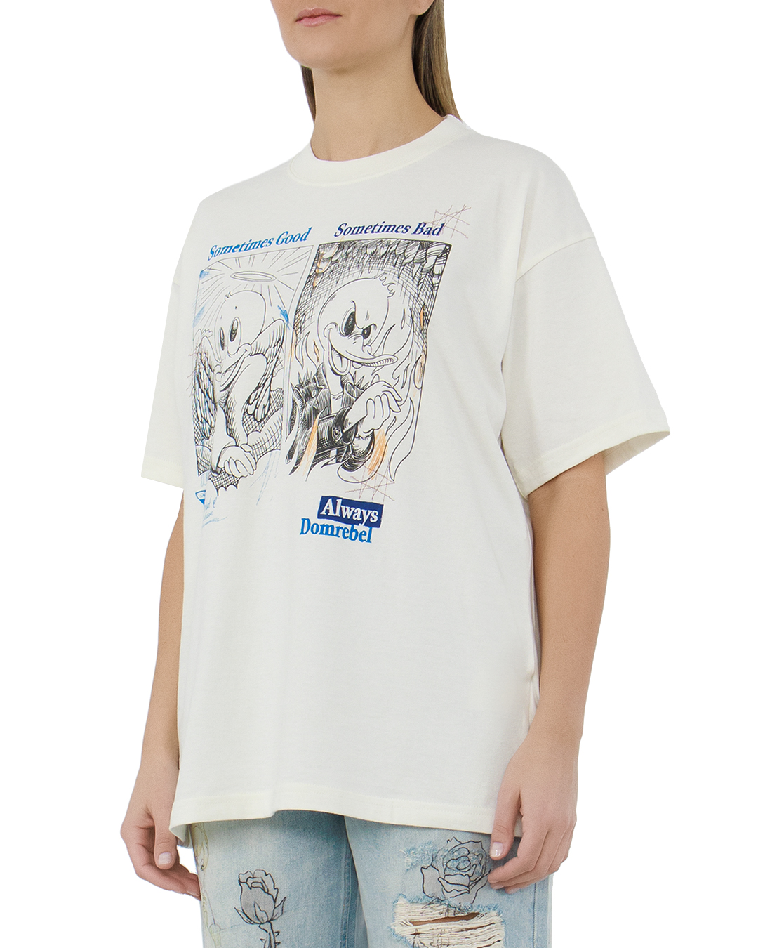 Футболку с немного спущенной линией плеч сшили вручную из хлопкового джерси. Спереди и сзади модель украсили надписями, логотипами и принтами Sometimes, напоминающими комиксы.