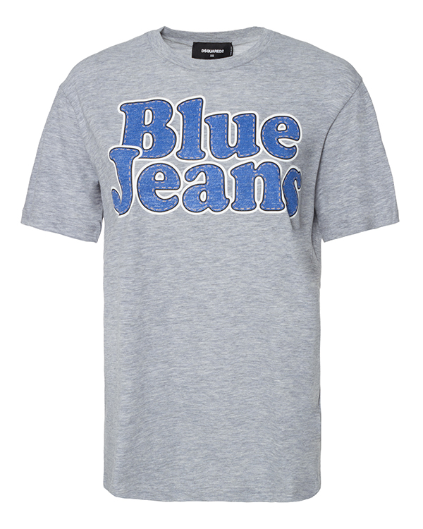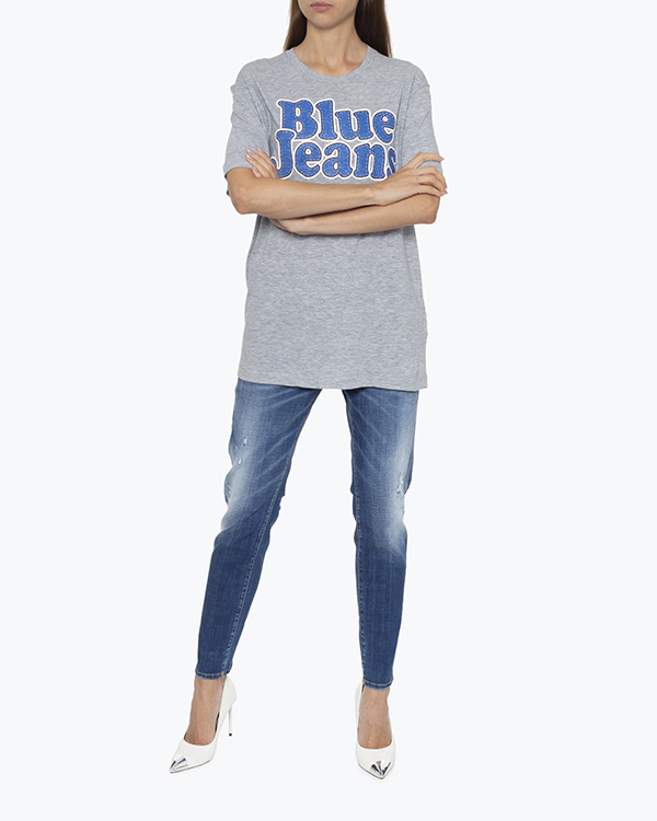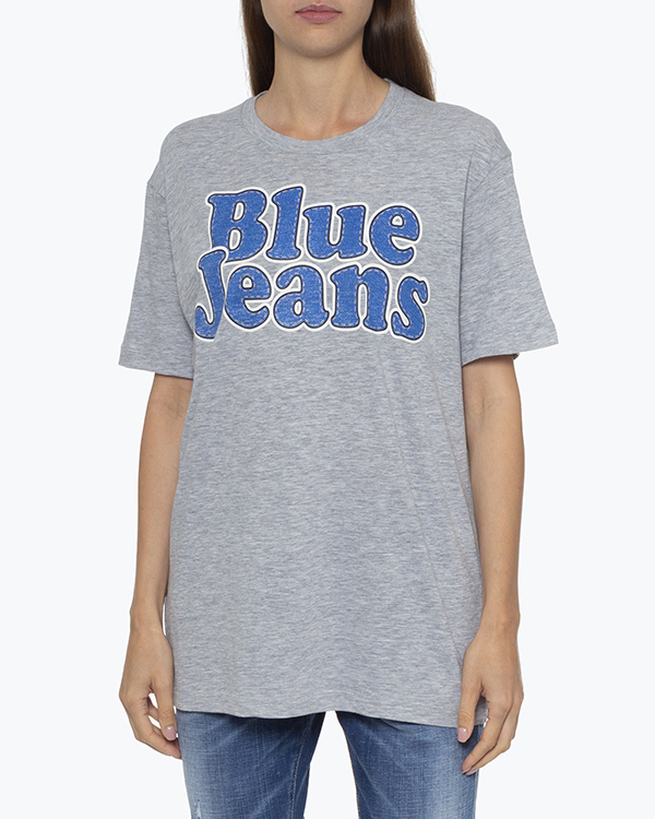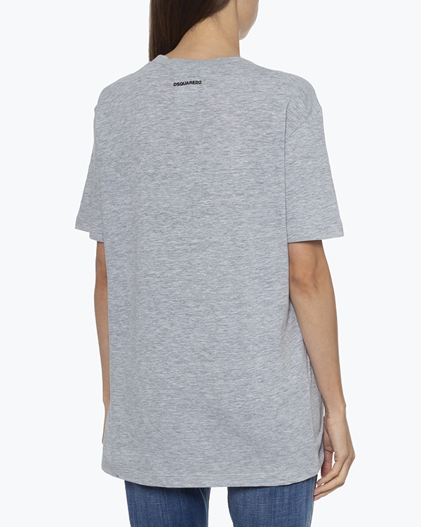 Футболка из трикотажного меланжевого хлопка серого оттенка с принтом. Удлиненное изделие со спущенной линией плеч.
