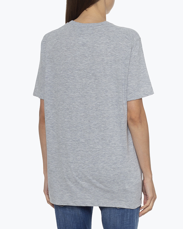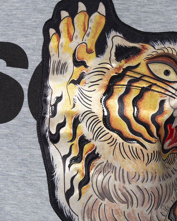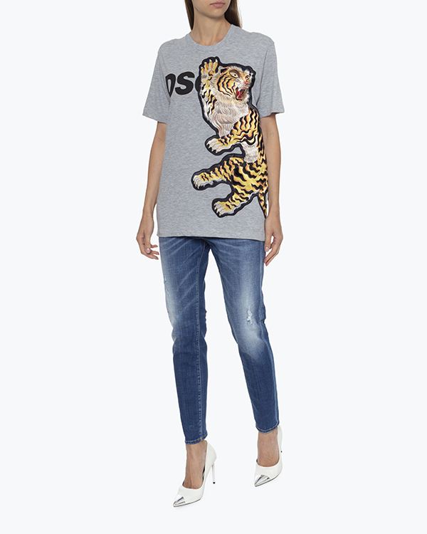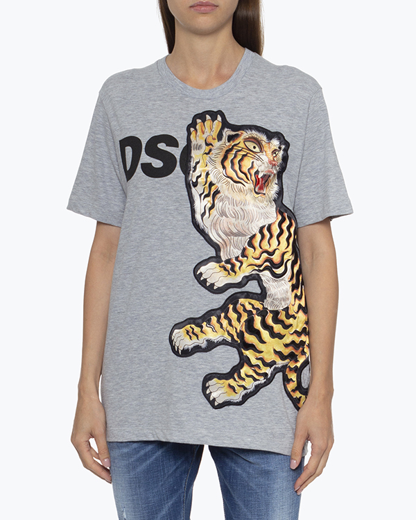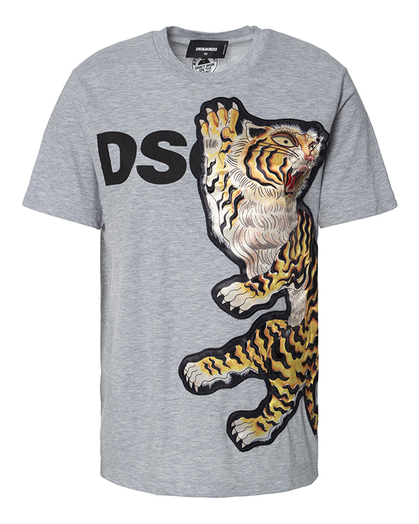 Футболка из трикотажного меланжевого хлопка серого оттенка с нашивкой в виде тигра. Эластичное изделие с логотипом бренда.