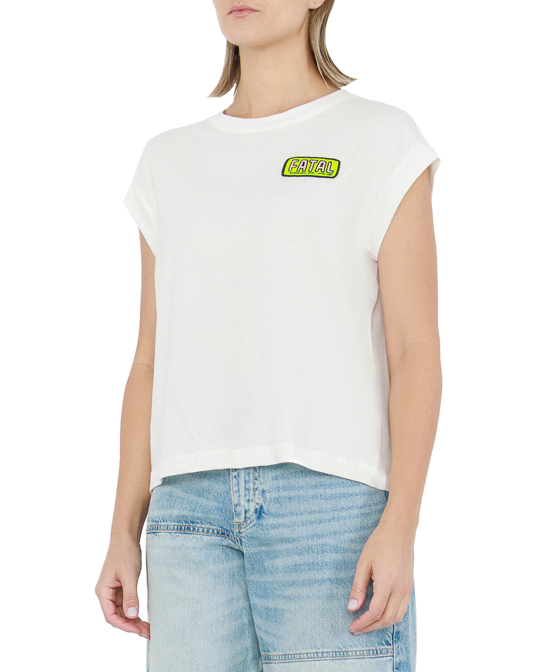 Эта футболка Essentiel сочетает в себе минимализм и акцентные детали, делая её стильным выбором для современного гардероба. Изготовленная в чистом белом цвете, она служит идеальным полотном для выразительного акцента: нашивки с надписью "FATAL" в неоновых оттенках зеленого и желтого на груди. Этот элемент добавляет игривости и динамичности в общий образ.  Фасон футболки с каплевидными рукавами и свободным кроем придает непринужденный вид, обеспечивая комфорт и стильную посадку. Округлый вырез горловины обработан тщательно, что отражает внимание к деталям и высокое качество пошива.  Эта футболка легко интегрируется в повседневные аутфиты, делая их более яркими и запоминающимися. Отличный выбор для сочетания с джинсами или шортами, она позволяет выделяться, сохраняя при этом элегантную простоту и современный стиль.