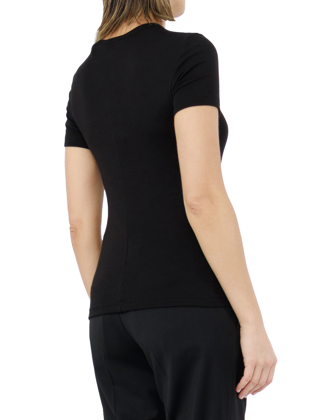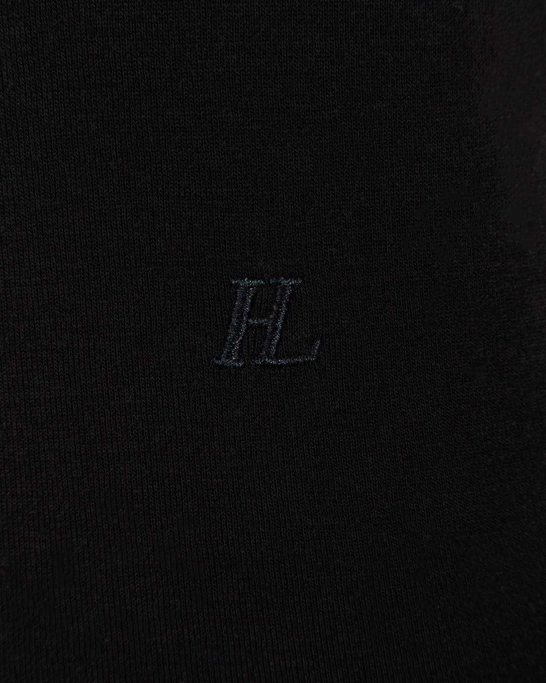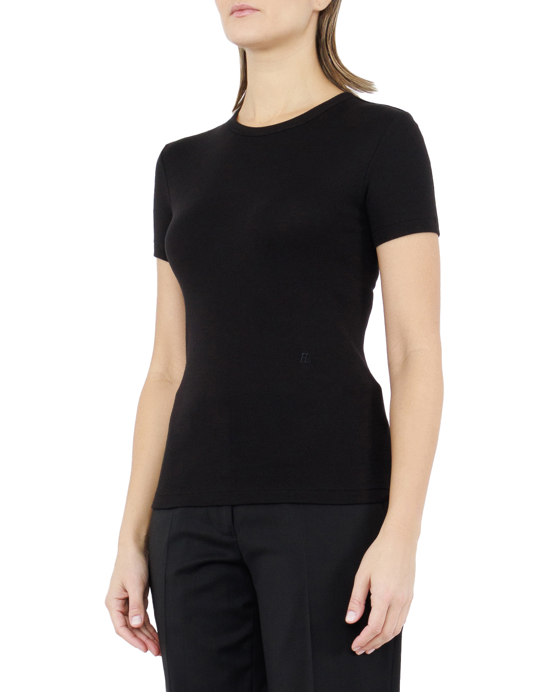 Облегающую базовую футболку с круглым вырезом выполнили из тонкого трикотажа, в котором поровну соединили модал и перуанский хлопок пима. Спереди модель украсили вышитой монограммой HL в тон.