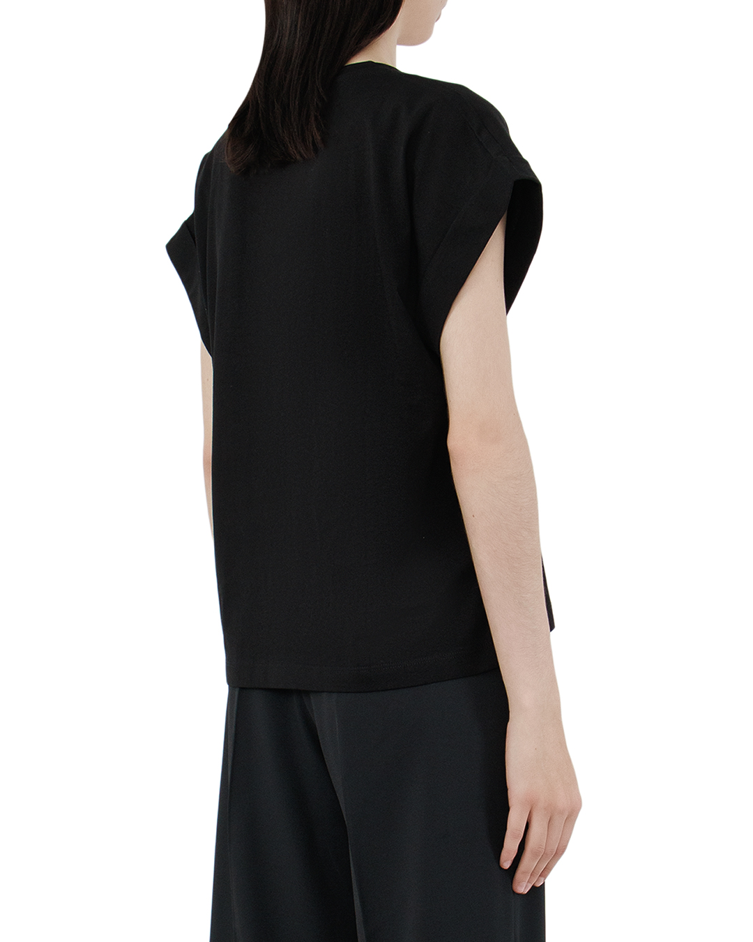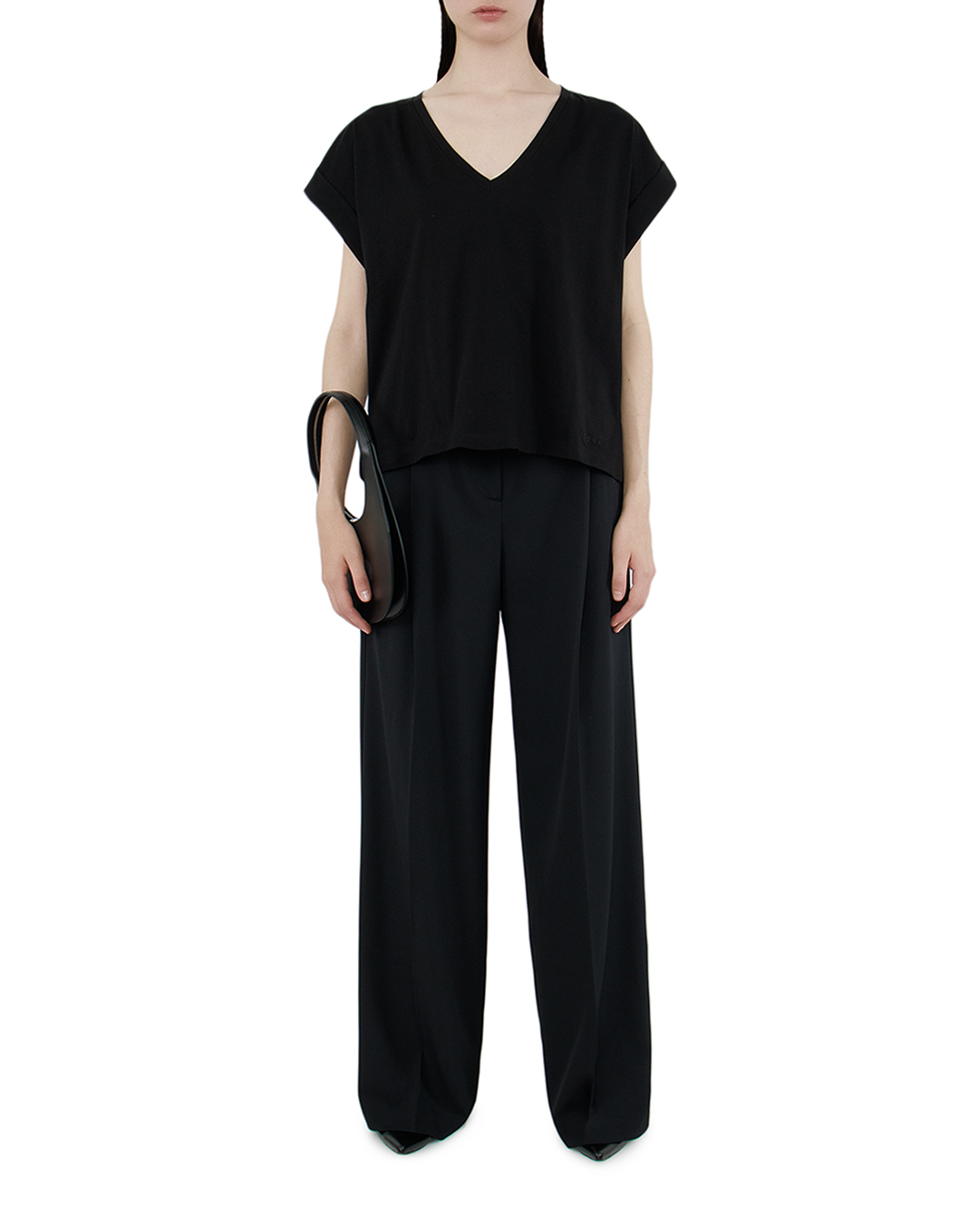 Эта футболка — идеальное воплощение современного минимализма и универсальной элегантности. Черный оттенок позволяет создать базовый, универсальный образ, который всегда остается актуальным. V-образный вырез добавляет изысканности и визуально вытягивает силуэт, создавая эффект утонченности. Это решение придает модели дополнительный акцент, делая её более выразительной. Свободный крой обеспечивает комфорт и легкость движений, а короткие рукава с аккуратными отворотами добавляют структуру и оригинальность. Такие детали придают образу динамичный и стильный вид. Высококачественная ткань отличается мягкостью и дышащими свойствами, что делает одежду идеальной для носки в любом сезоне. Аккуратно выполненные швы подчеркивают внимание к качеству и деталям. Эта футболка станет базовым элементом гардероба, легко сочетающимся с различными стилями — от кэжуал до более изысканных комбинаций, добавляя вашему образу нотки современной элегантности.