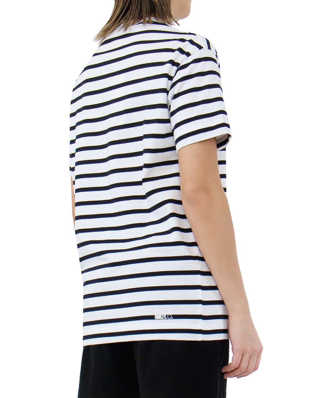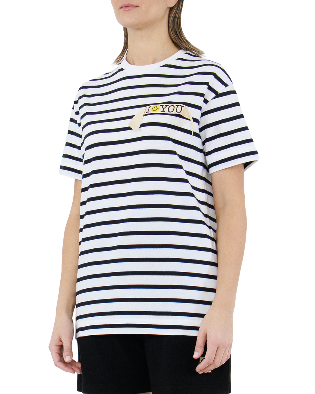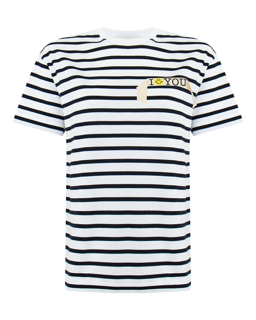 Футболка от JOSHUA'S представляет собой модный баланс между классикой и игривостью, благодаря элегантному чёрно-белому полосатому принту. Изготовленная из высококачественного хлопка, она обеспечивает комфорт и дышащие свойства, идеально подходя для повседневной носки.   На груди расположен стильный акцент — надпись "I ❤️ YOU" с добавлением жёлтого смайлика, выполненная на контрастной полоске, что придаёт образу нотку игривого романтизма. Классический круглый вырез и аккуратная отделка швов создают чистый и продуманный силуэт. Эта футболка отлично впишется в кэжуал или морской стиль, добавляя индивидуальности и свежести любому образу.