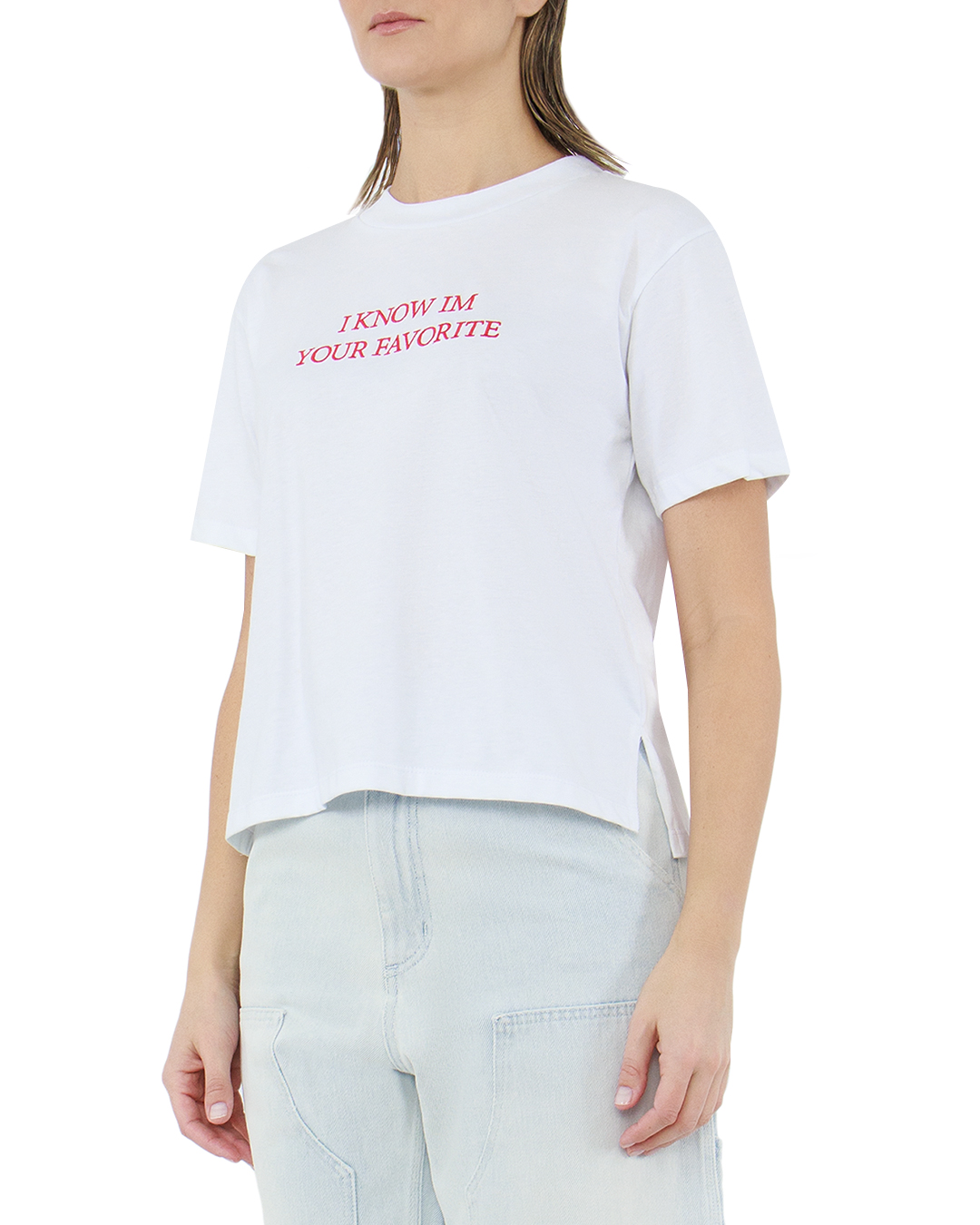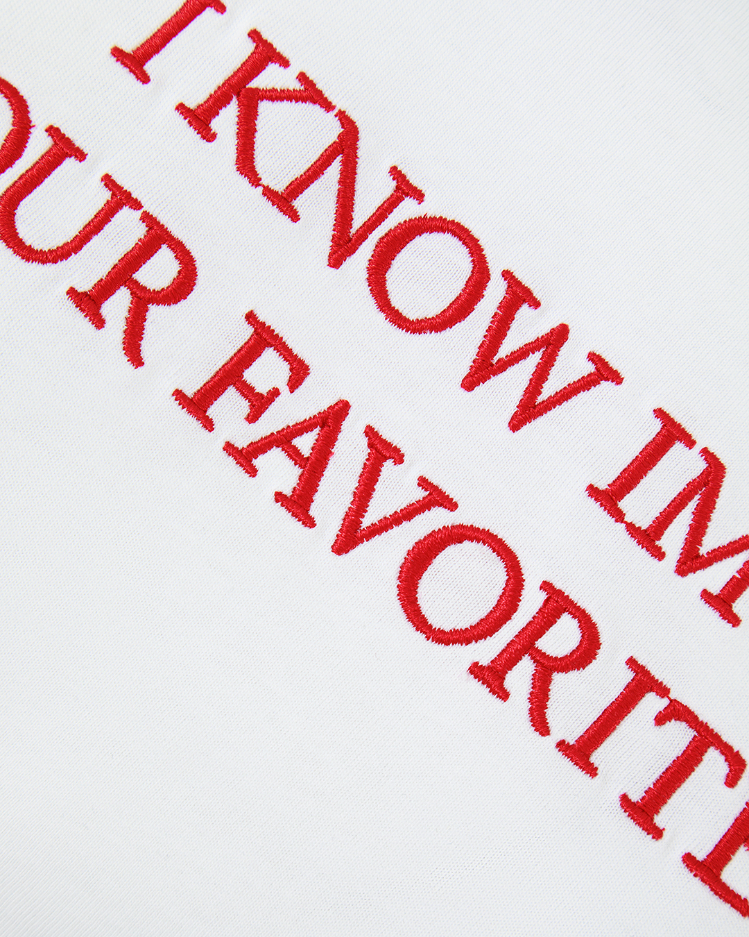 Эта футболка от JOSHUA'S излучает уверенность и харизму благодаря лаконичному дизайну и дерзкому акценту. Высококачественный хлопок обеспечивает мягкость и комфорт на протяжении всего дня, становясь основой для создания стильного и непринуждённого образа. Центральное место занимает выразительная надпись в ярко-красном оттенке — "I KNOW IM YOUR FAVORITE". Такая броская деталь говорит за себя, привнося игривость и нотку уверенного настроения. Контрастная вышивка чётко выделяется на белом фоне, создавая эффектный визуальный акцент. Футболка имеет традиционный круглый вырез и прямой крой, что делает её универсальной и подходящей для различных стилистических направлений. Аккуратные прострочки и усиленные края подчёркивают высочайшее качество изготовления, гарантируя долговечность и устойчивость к износу. Этот элемент гардероба легко интегрируется в любой стиль, от непринужденного кэжуала до более дерзких и экстравагантных нарядов, добавляя каплю дерзости и личной харизмы в ваш ежедневный образ.