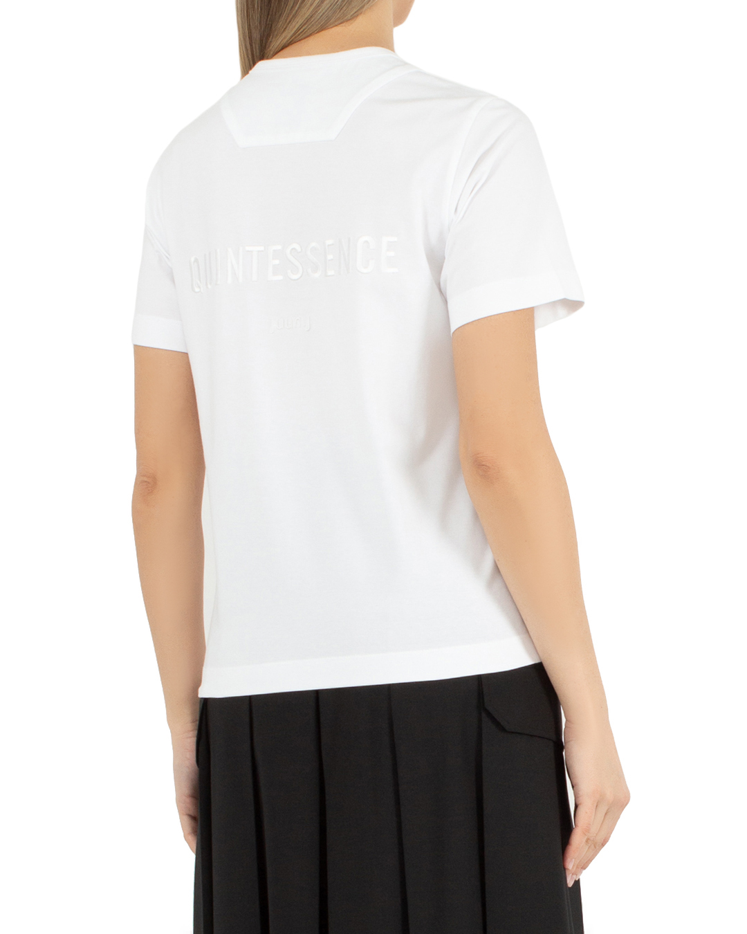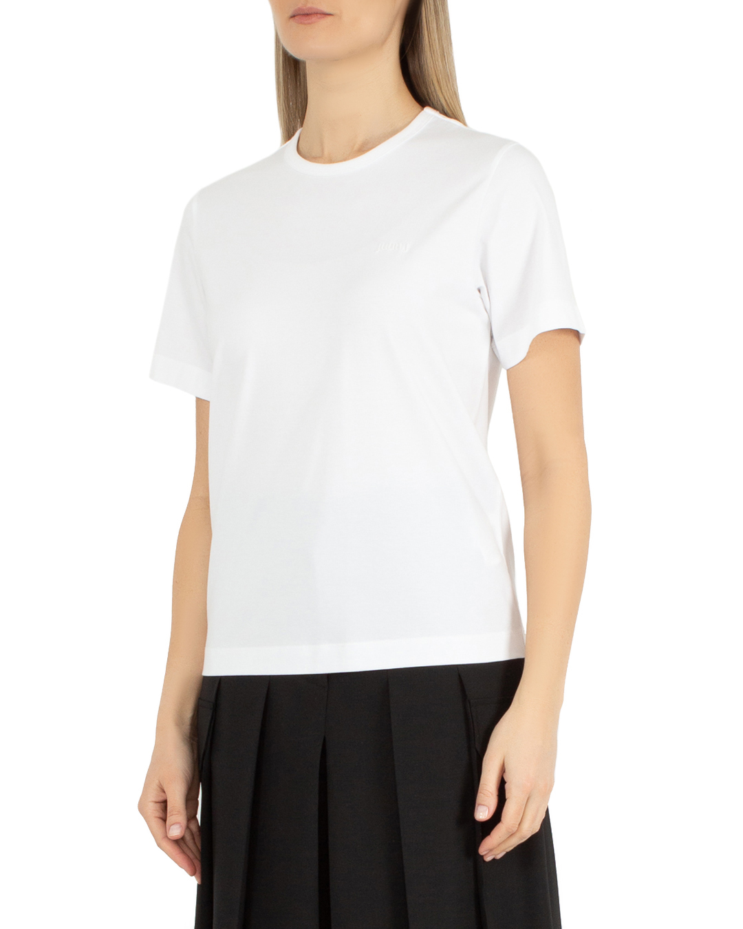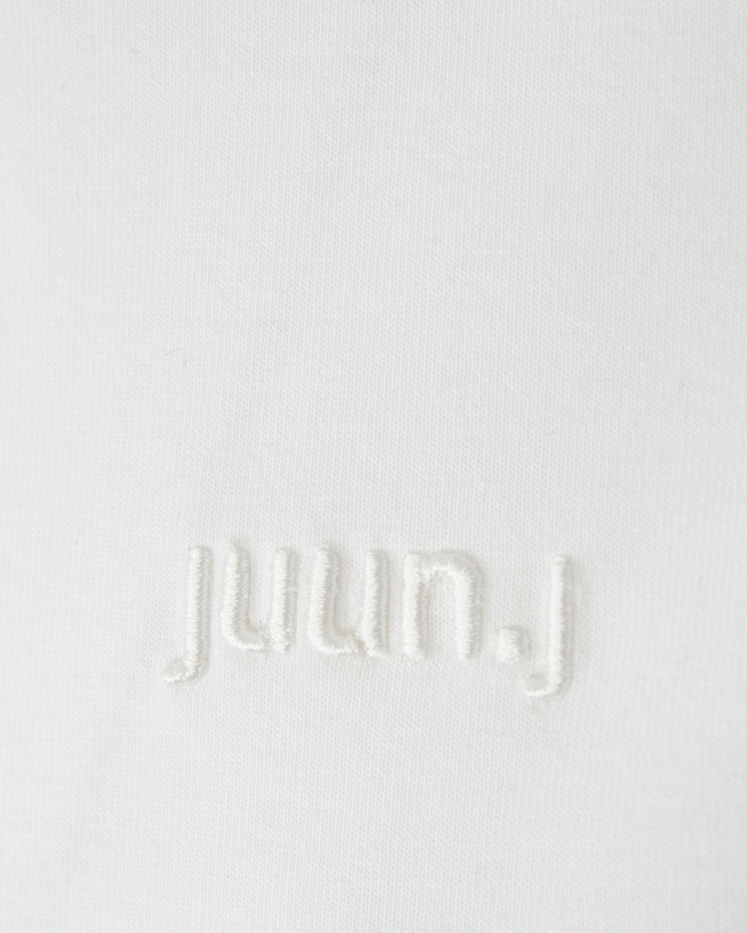 Футболка Juun.J из трикотажного хлопка белого цвета. Модель прямого силуэта с круглой линией выреза и текстовой вышивкой на спине.