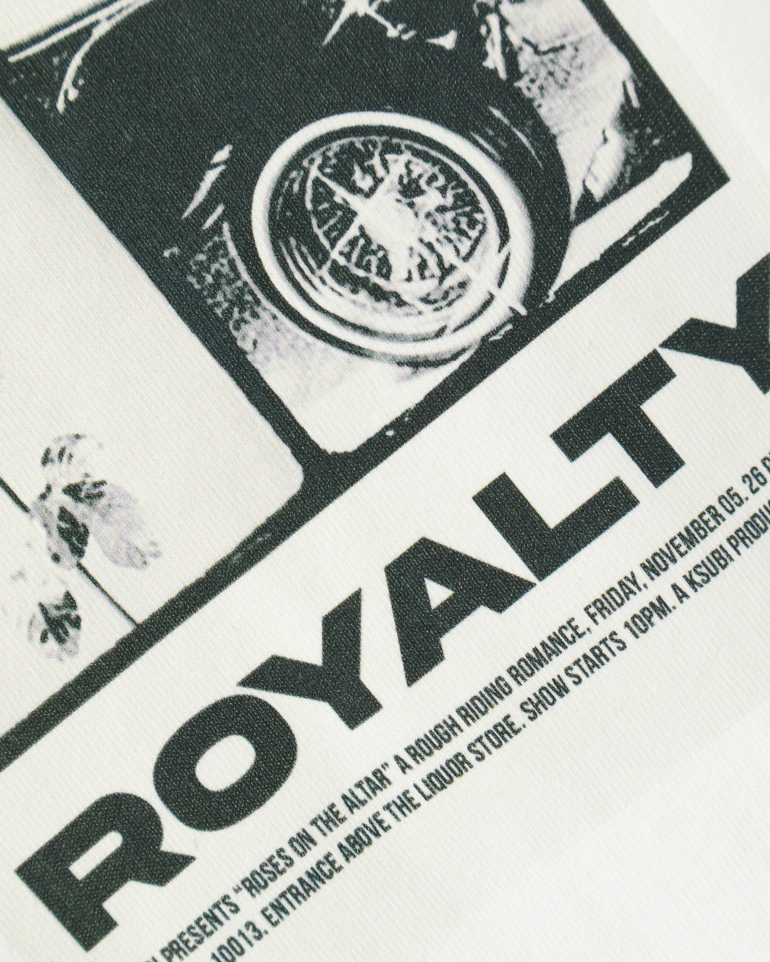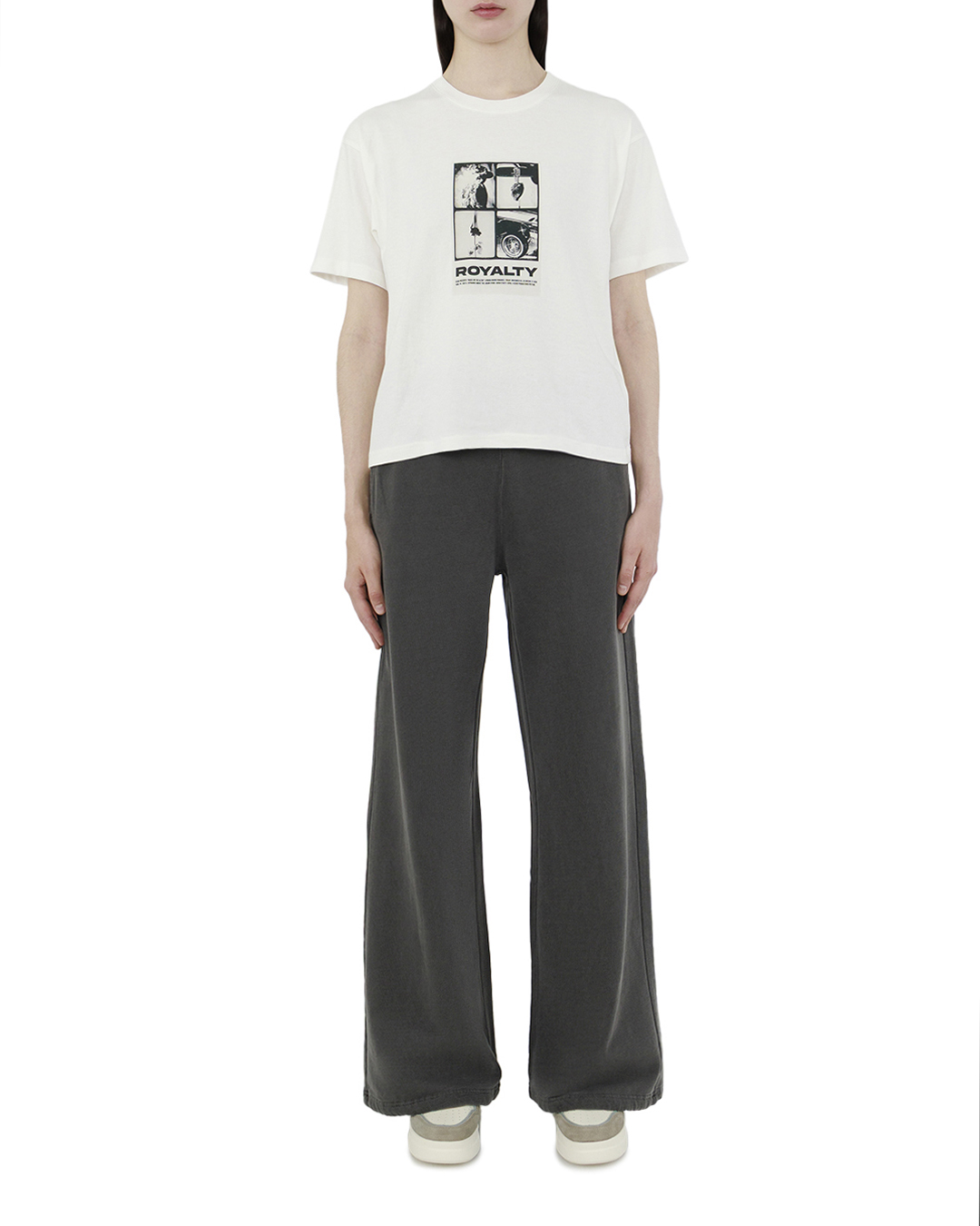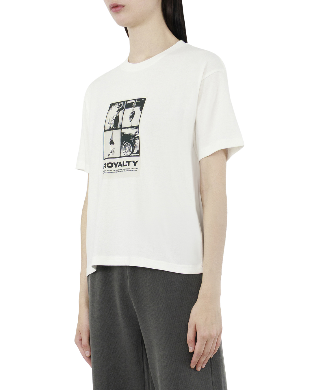 Эта футболка — идеальное сочетание лаконичности и современного стиля. Белоснежная основа служит прекрасным фоном для выразительного графического принта в ретро-стиле, добавляющего изделию индивидуальность и характер. Минималистичный крой со свободным силуэтом обеспечивает комфорт и позволяет коже дышать, делая футболку идеальным выбором для повседневного гардероба. Мягкая и приятная на ощупь ткань гарантирует легкость и удобство в носке. Круглый вырез горловины дополнен аккуратной отделкой, которая подчеркивает простоту и элегантность дизайна. Качественные швы, надежные и незаметные, свидетельствуют о внимании к деталям и высоком уровне исполнения. Принт на груди представляет собой креативный коллаж с надписью "ROYALTY", создающий стильный акцент и привносящий модную дерзость. Эта футболка отлично сочетает в себе элементы современного искусства и повседневного удобства, подходя для создания расслабленных, но выразительных луков как в городской среде, так и за ее пределами.