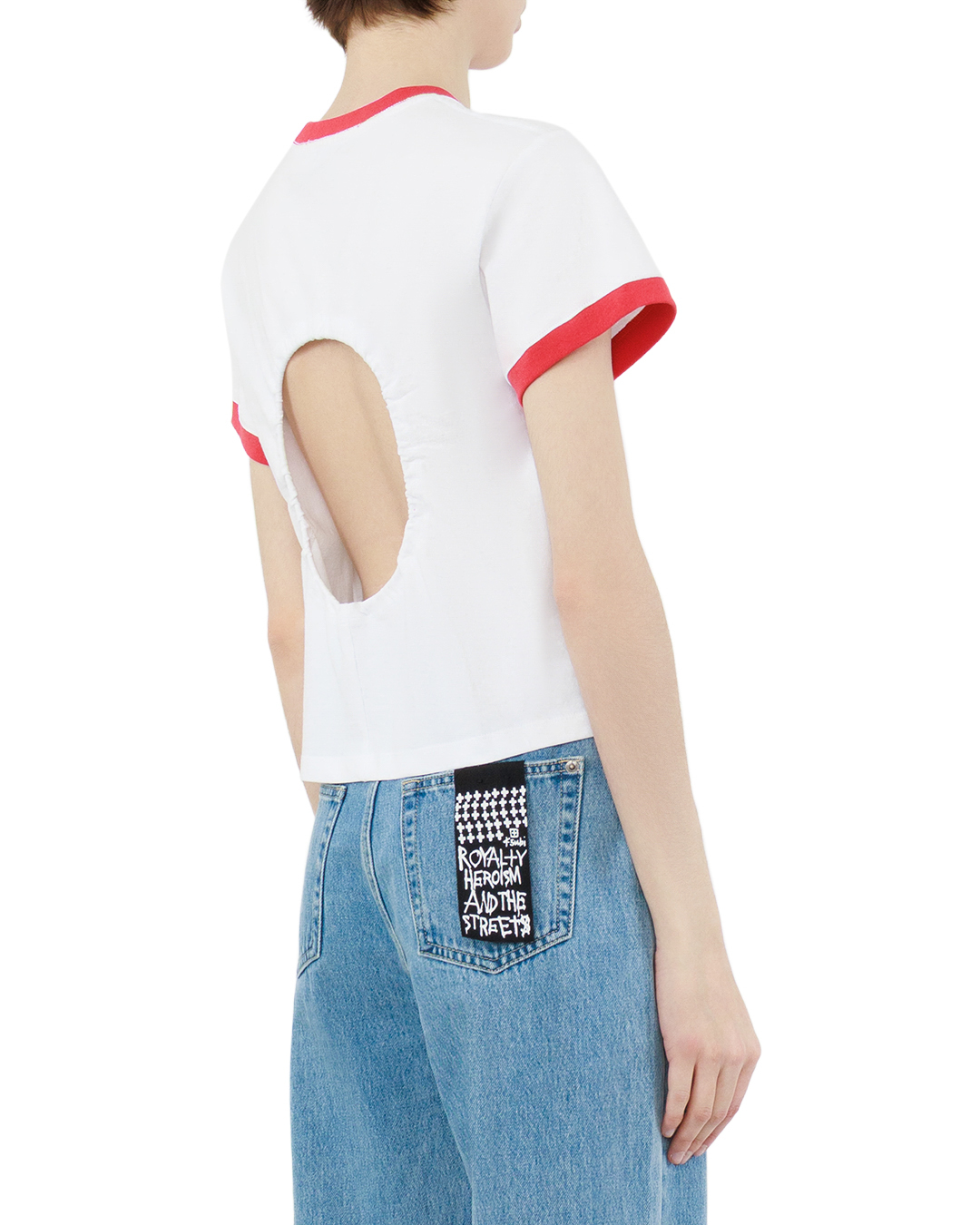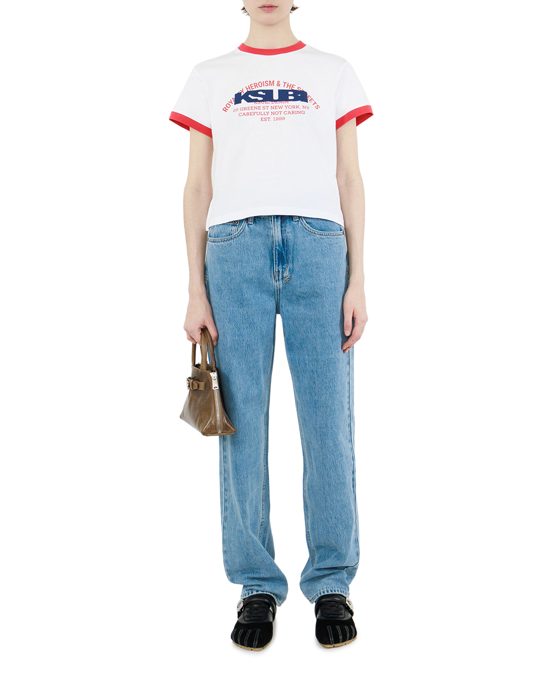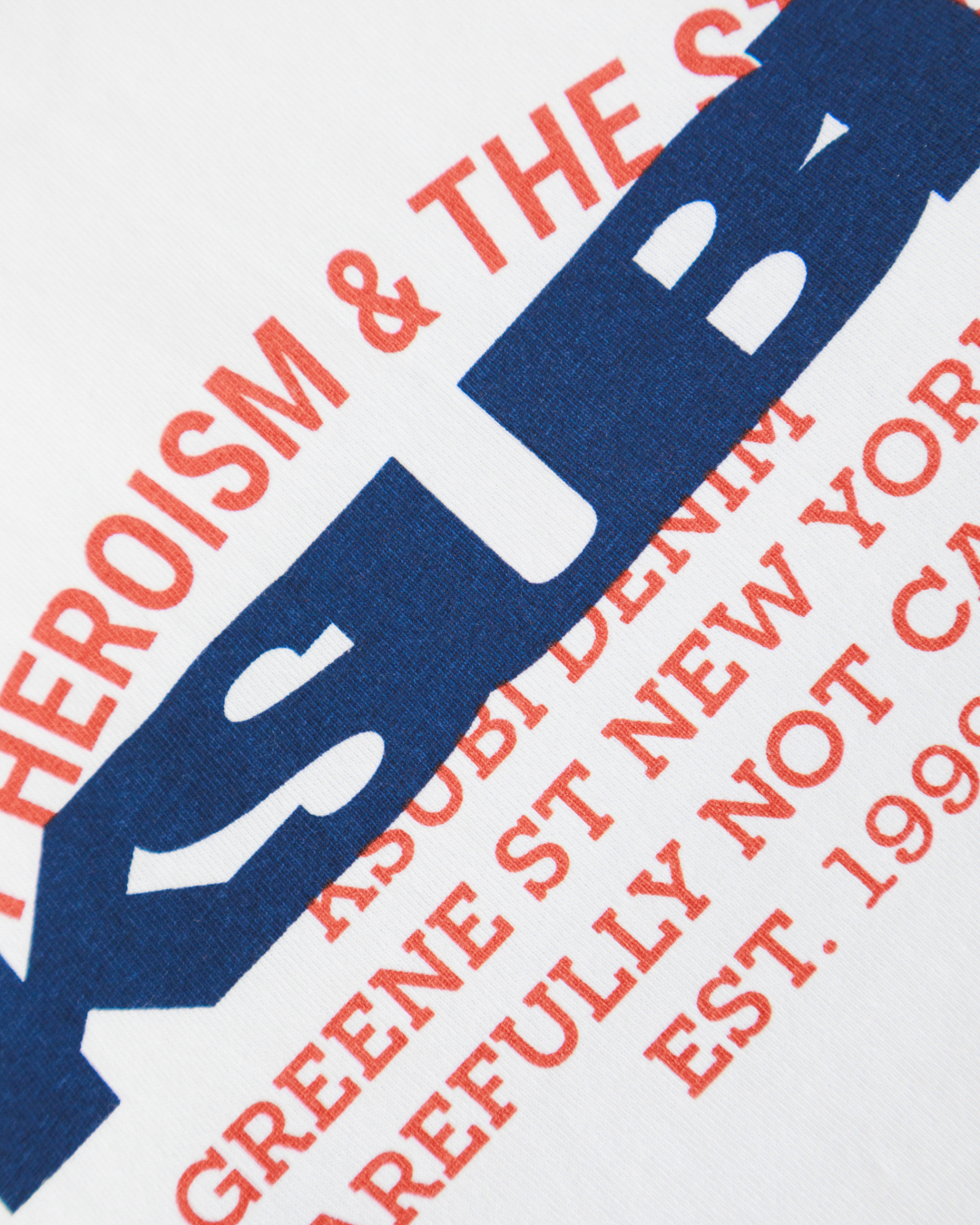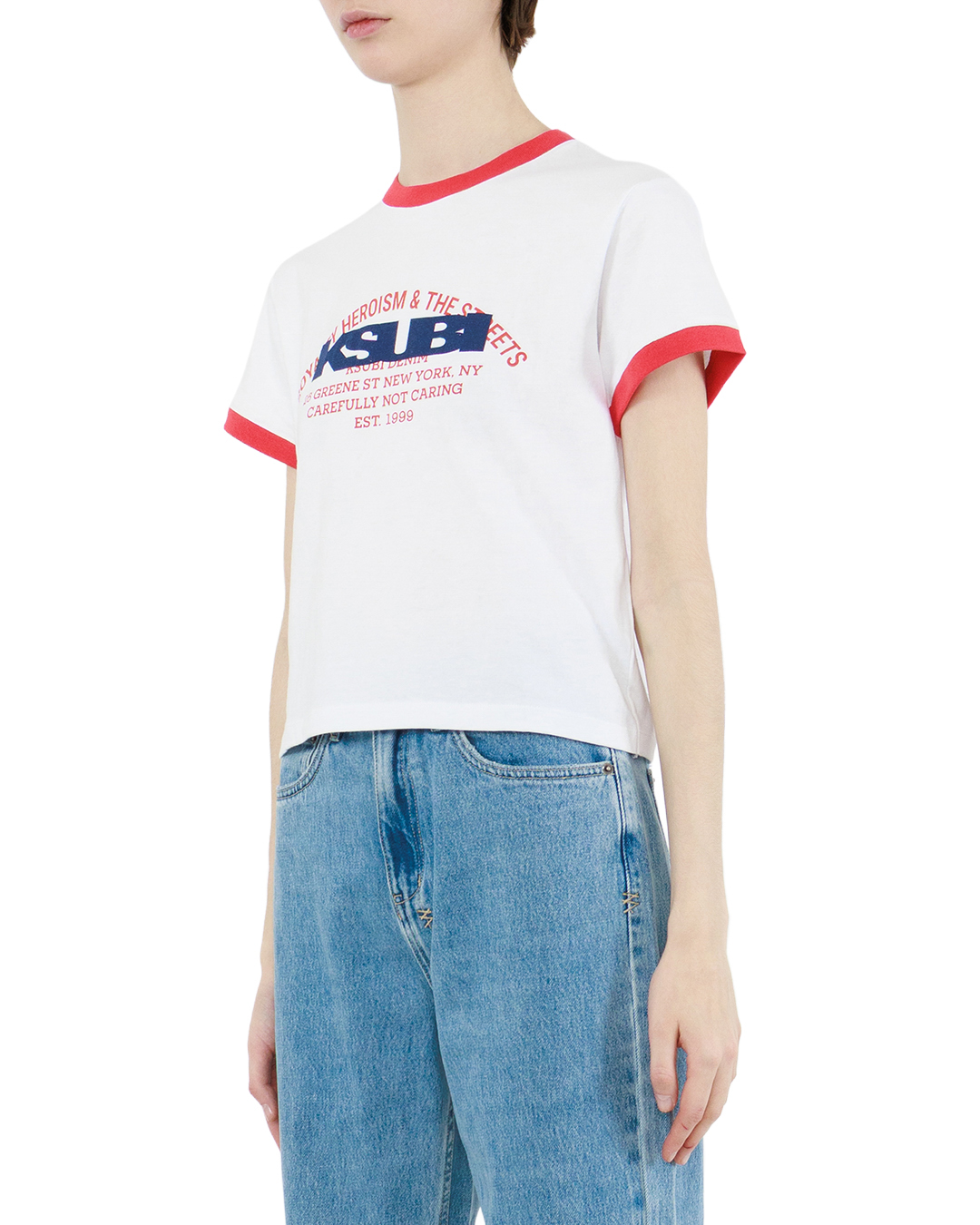 Эта белая футболка — воплощение урбанистической эстетики с оттенком дерзкой лаконичности. Классический прямой крой подчёркивает силуэт, не сковывая движений, а продуманный дизайн превращает её в выразительный элемент гардероба. Яркая красная отделка по вороту и манжетам рукавов создаёт динамичный контраст с белоснежным полотном, добавляя вещи спортивный шик. Плавные линии отделки гармонично вписываются в общий силуэт, подчёркивая аккуратность исполнения. Центральным акцентом служит крупный принт с графичной надписью. Сочетание насыщенного синего блока и выразительного красного текста создаёт эффектный визуальный акцент, который сразу притягивает взгляд. Шрифты подобраны с особым вниманием: они одновременно читаемы и стилизованы, что придаёт футболке характер. Композиция принта выстроена продуманно: верхняя дугообразная надпись обрамляет центральный блок, создавая ощущение завершённости. Детали текста — адрес, слоган, год основания — добавляют вещи истории, превращая её не просто в элемент одежды, а в носитель стиля и настроения. Аккуратные швы по всему изделию говорят о высоком уровне пошива: они ровные, практически незаметные, что подчёркивает качество исполнения. Нижний край футболки оформлен с лёгкой подгибкой, что не только защищает изделие от износа, но и добавляет ему законченности. Эта футболка станет ярким акцентом в любом образе — от расслабленного кэжуал до более собранного городского лука. Она одинаково хорошо сочетается и с джинсами, и с шортами, позволяя создавать множество стильных комбинаций. Комфорт здесь идёт рука об руку с выразительностью, а простота — с продуманной детализацией.