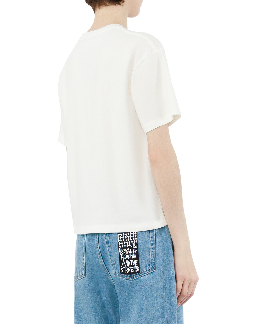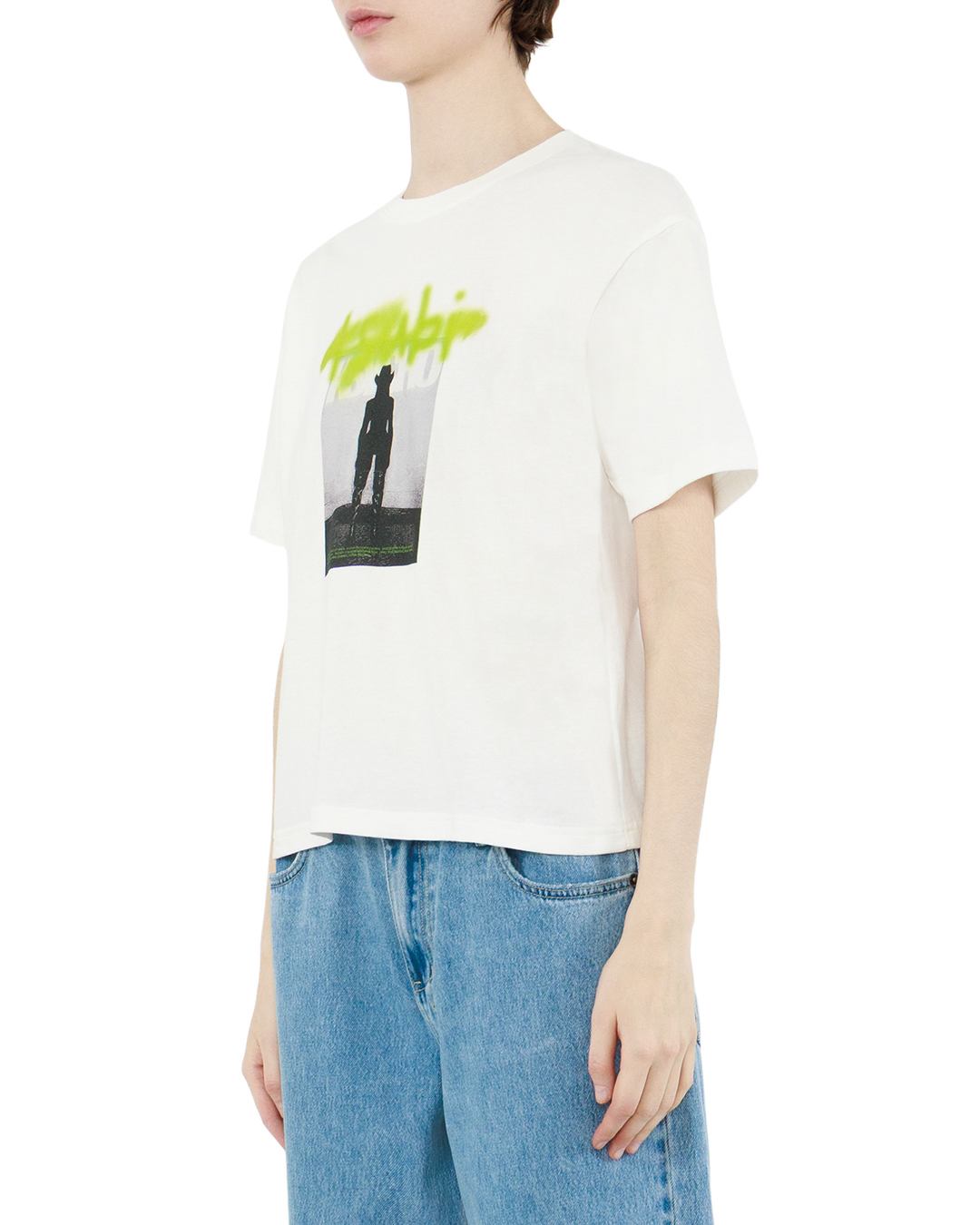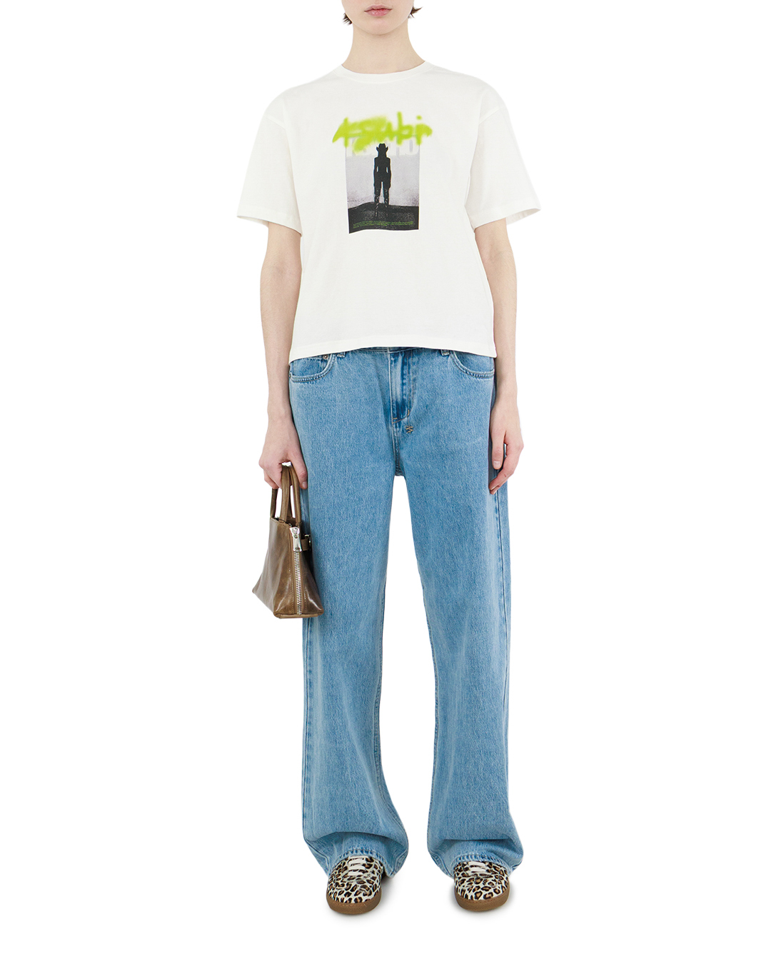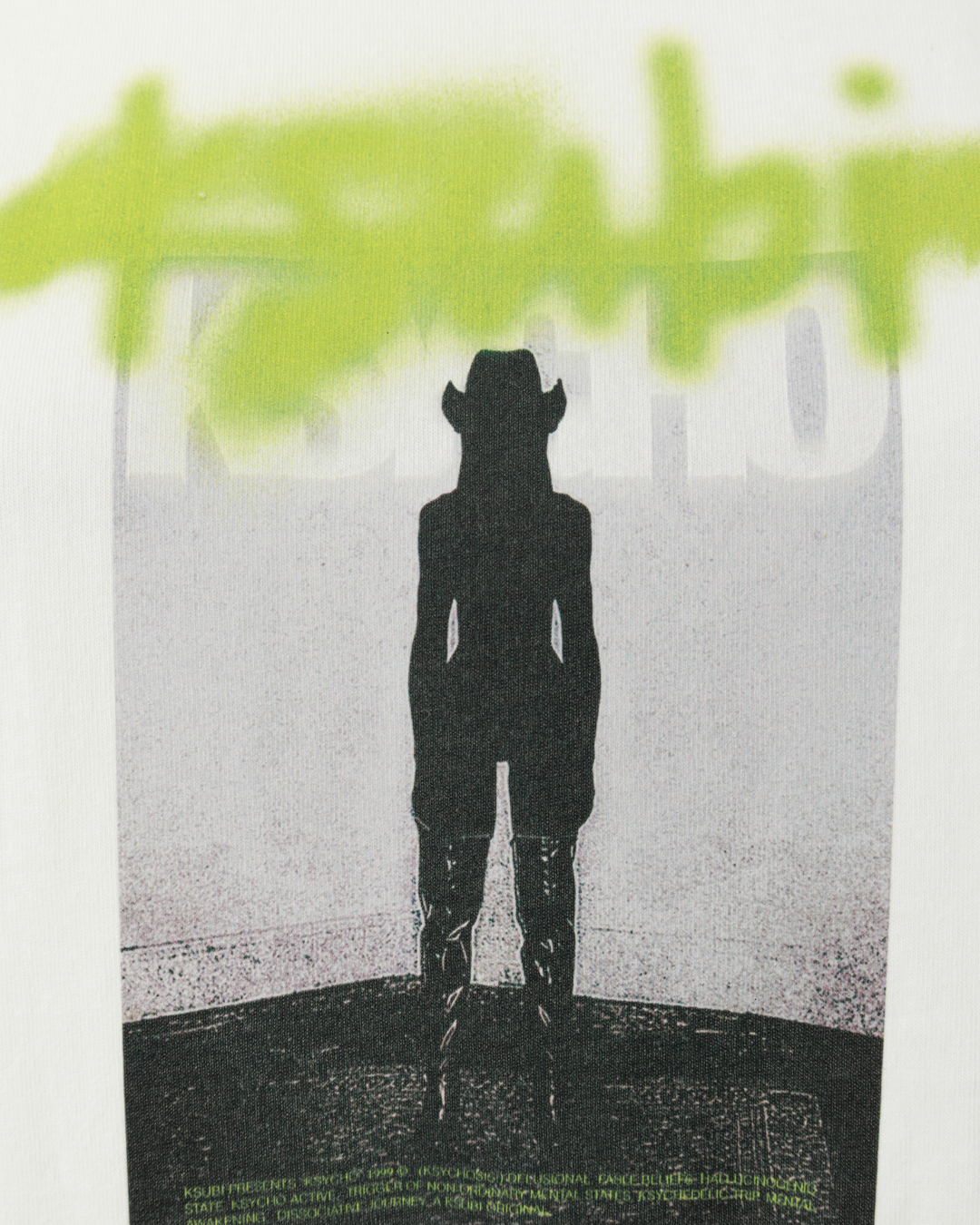 Эта белая футболка — воплощение дерзкой урбанистической эстетики с оттенком арт-эксперимента. Свободный, слегка удлинённый крой создаёт расслабленный, но выразительный силуэт, позволяя чувствовать себя комфортно в любой ситуации. Центральным акцентом служит масштабный графический принт на груди. Композиция построена на контрасте: монохромный силуэт фигуры в шляпе словно выходит из тумана, создавая атмосферу загадочности и глубины. Над силуэтом — яркая надпись в стиле граффити, выполненная насыщенно-салатовым цветом. Этот цветовой всплеск оживляет образ, добавляет ему динамики и молодёжного задора. Нижняя часть принта оформлена в виде тёмного прямоугольника с дополнительной текстовой графикой, которая перекликается с основной надписью, создавая цельную визуальную историю. Шрифты подобраны с особым вниманием: они одновременно грубоваты и стилизованы, что подчёркивает уличный характер модели. Круглый вырез горловины выполнен аккуратно, с тщательной обработкой края — это придаёт изделию законченность и предотвращает износ. Короткие рукава лаконичны, без лишних деталей, что сохраняет баланс между выразительностью принта и сдержанностью кроя. Нижний край футболки слегка подвёрнут — практичная деталь, которая добавляет изделию непринуждённости. Аккуратные, практически незаметные швы по всему изделию говорят о высоком уровне пошива. Эта футболка станет ярким акцентом в повседневном гардеробе, идеально дополняя как джинсы, так и спортивные штаны. Она одинаково хорошо впишется в расслабленный уличный образ или в более собранный лук с пиджаком. Здесь смелость принта гармонично сочетается с простотой кроя, а выразительность — с комфортом.