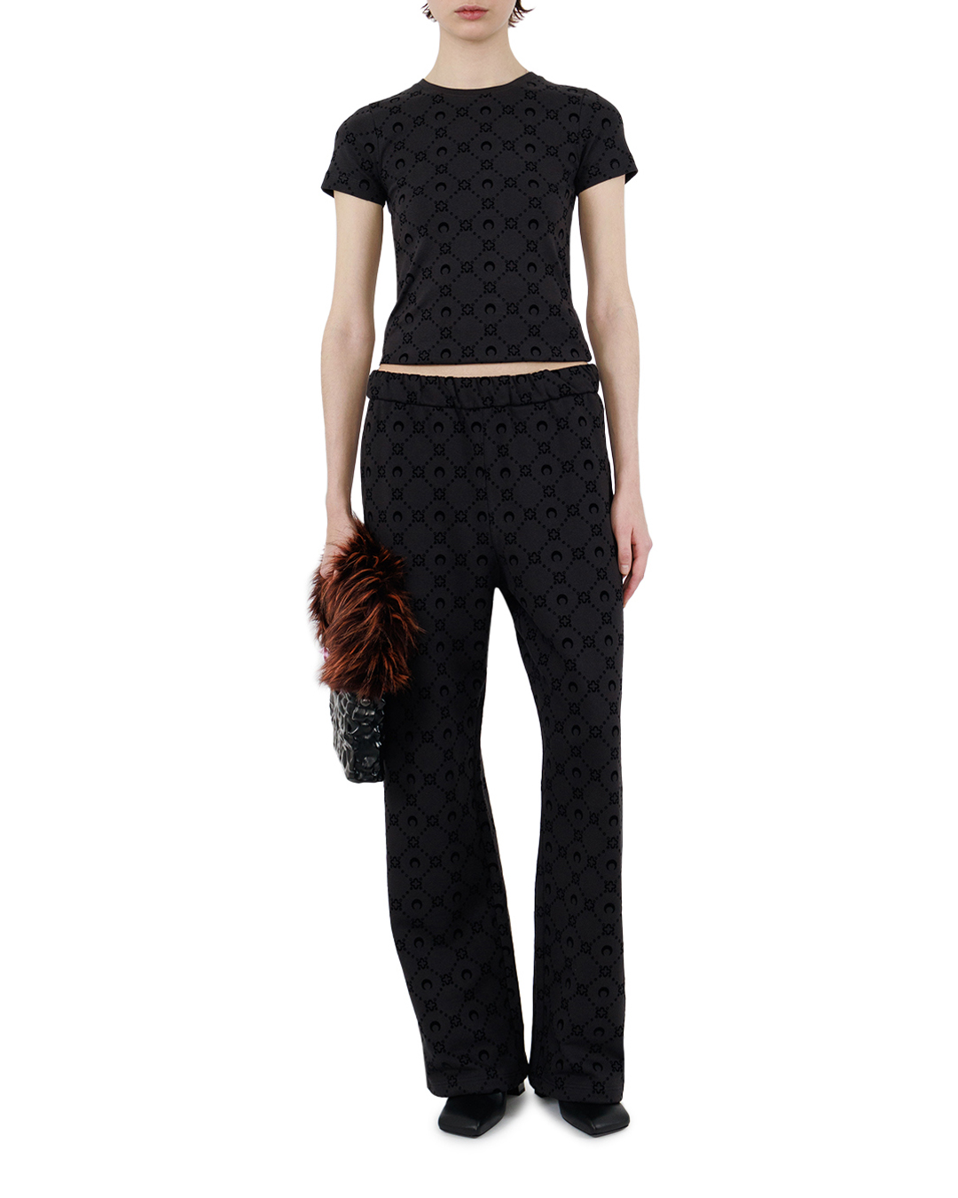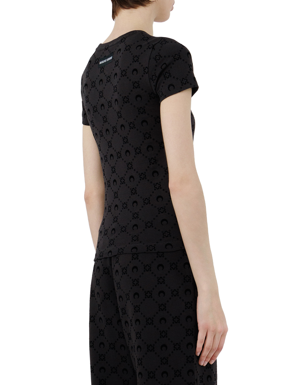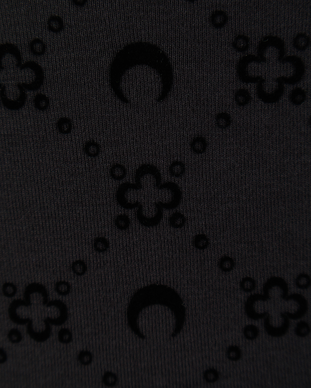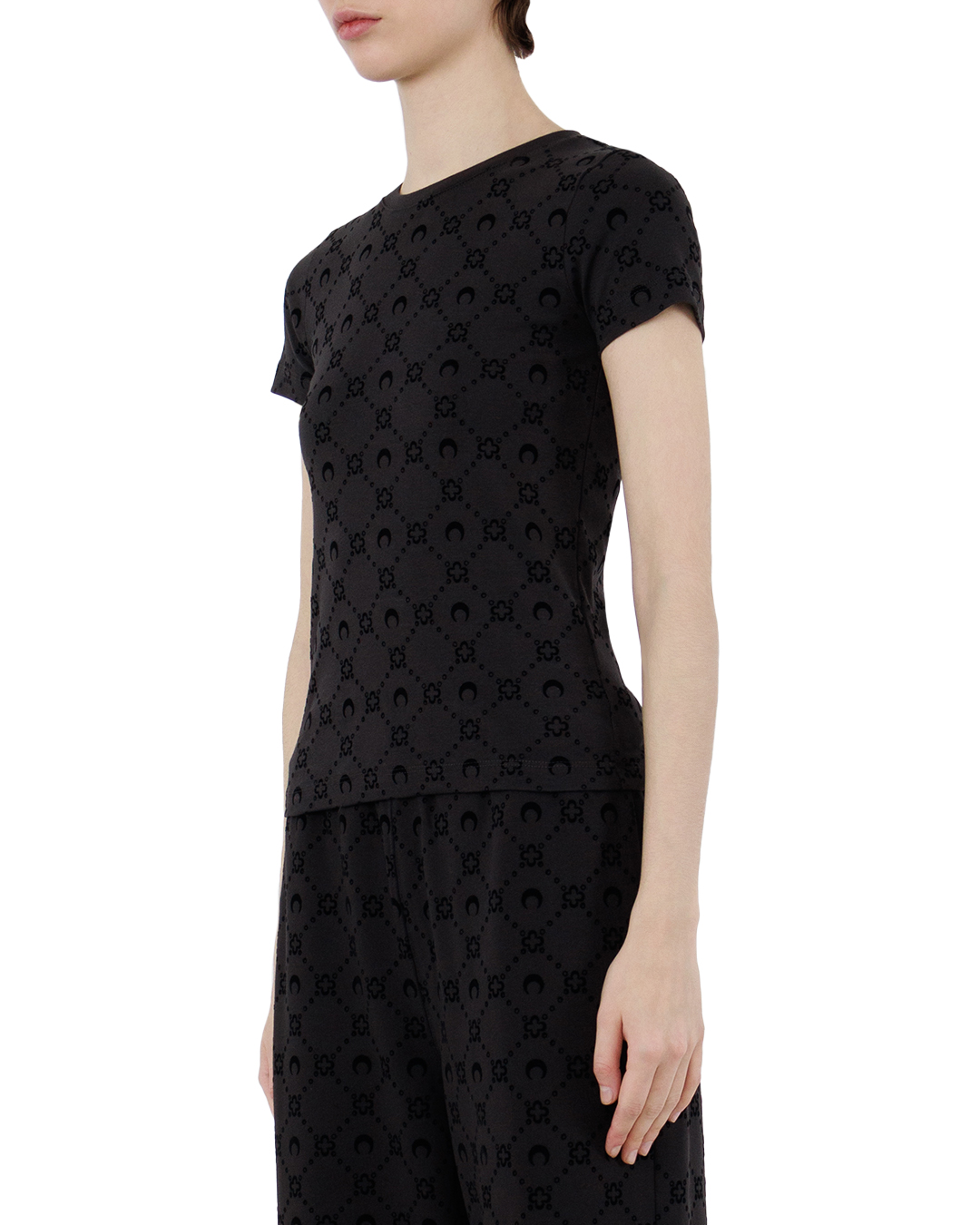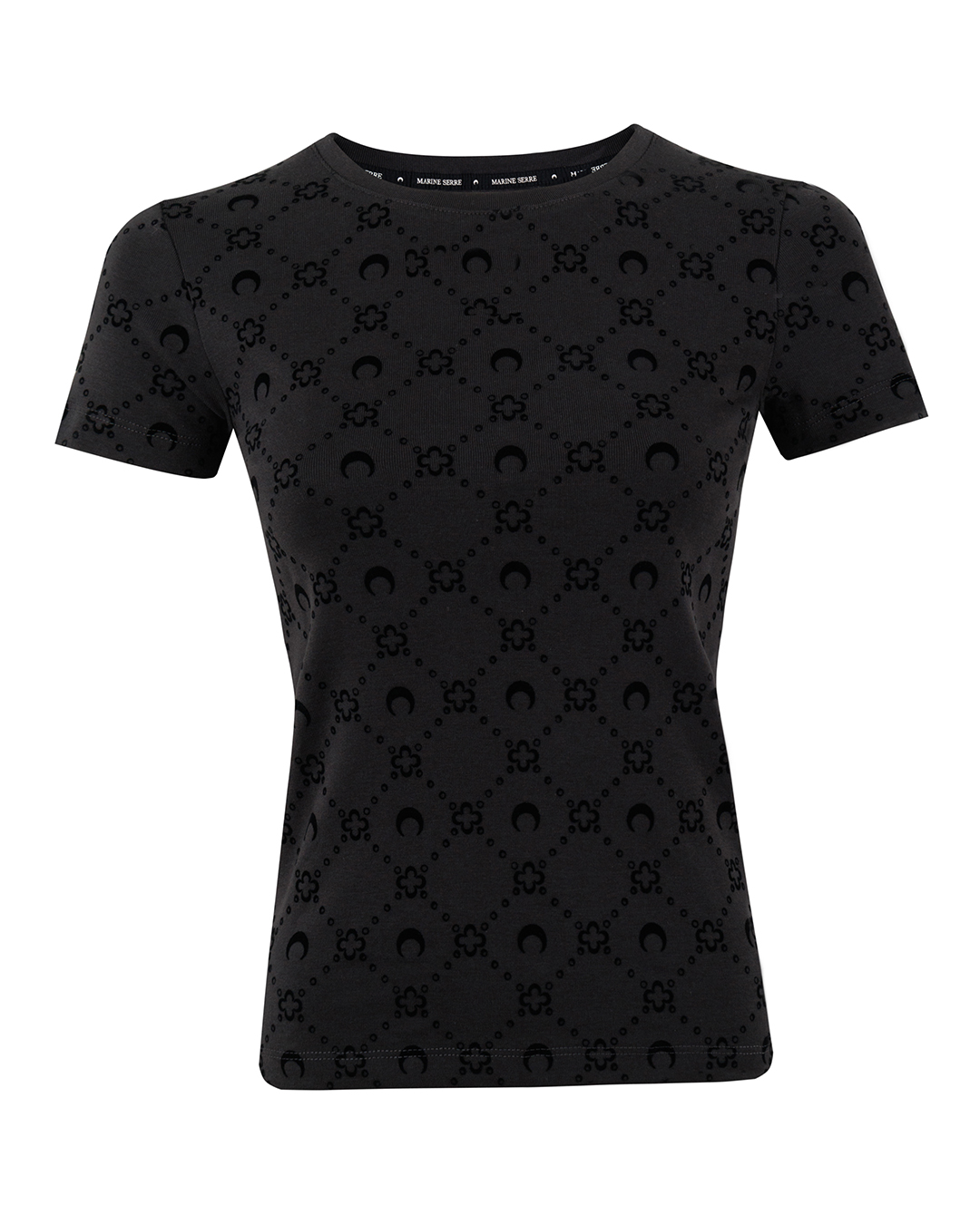 Эта футболка — стильный и универсальный элемент гардероба, сочетающий в себе современную элегантность и удобство. Выполненная из мягкого и приятного на ощупь материала, она обеспечивает комфорт и легкость при носке. Изюминкой дизайна является изысканный бархатный принт, который добавляет текстурного интереса и глубины. Этот богато детализированный узор превращает классическую черную футболку в модное заявление. Круглый вырез горловины и идеально выверенные пропорции подчеркивают линию шеи и плеч, создавая гармоничный силуэт. Аккуратные строчки и отделка края говорят о высоком качестве изготовления. Эта футболка легко сочетается с различными элементами гардероба, от строгих жакетов до повседневных джинсов, подчеркнув вашу индивидуальность и чувство стиля в любой ситуации.