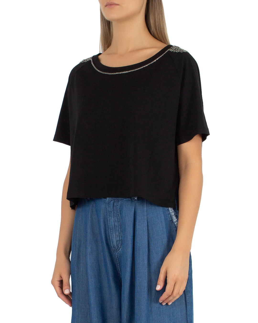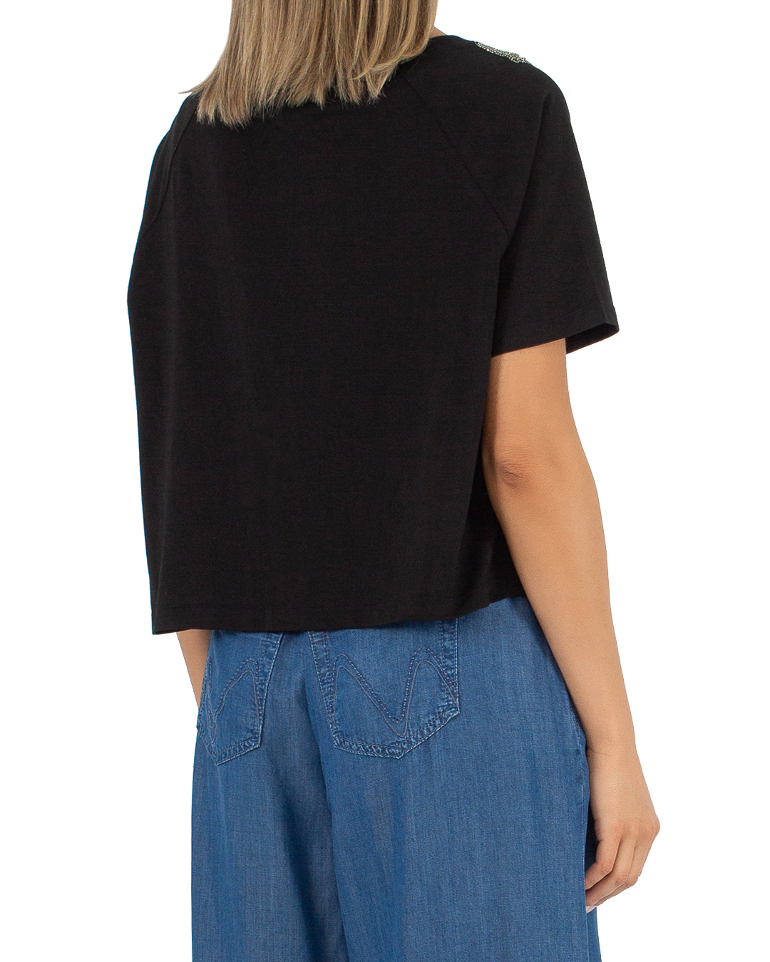 Футболка MAX&MOI из трикотажного хлопа с отделкой кристаллами. Укороченное изделие свободного силуэта.