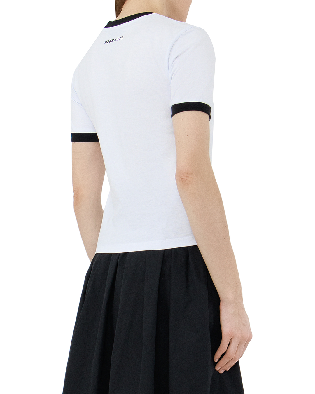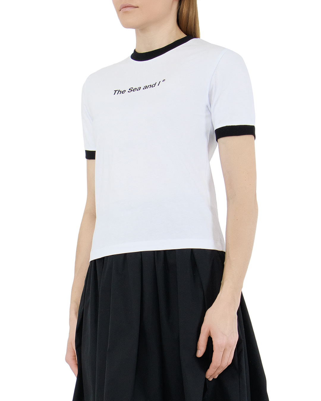 Футболка с круглым вырезом сшита из гладкого хлопкового джерси полуприталенного силуэта.