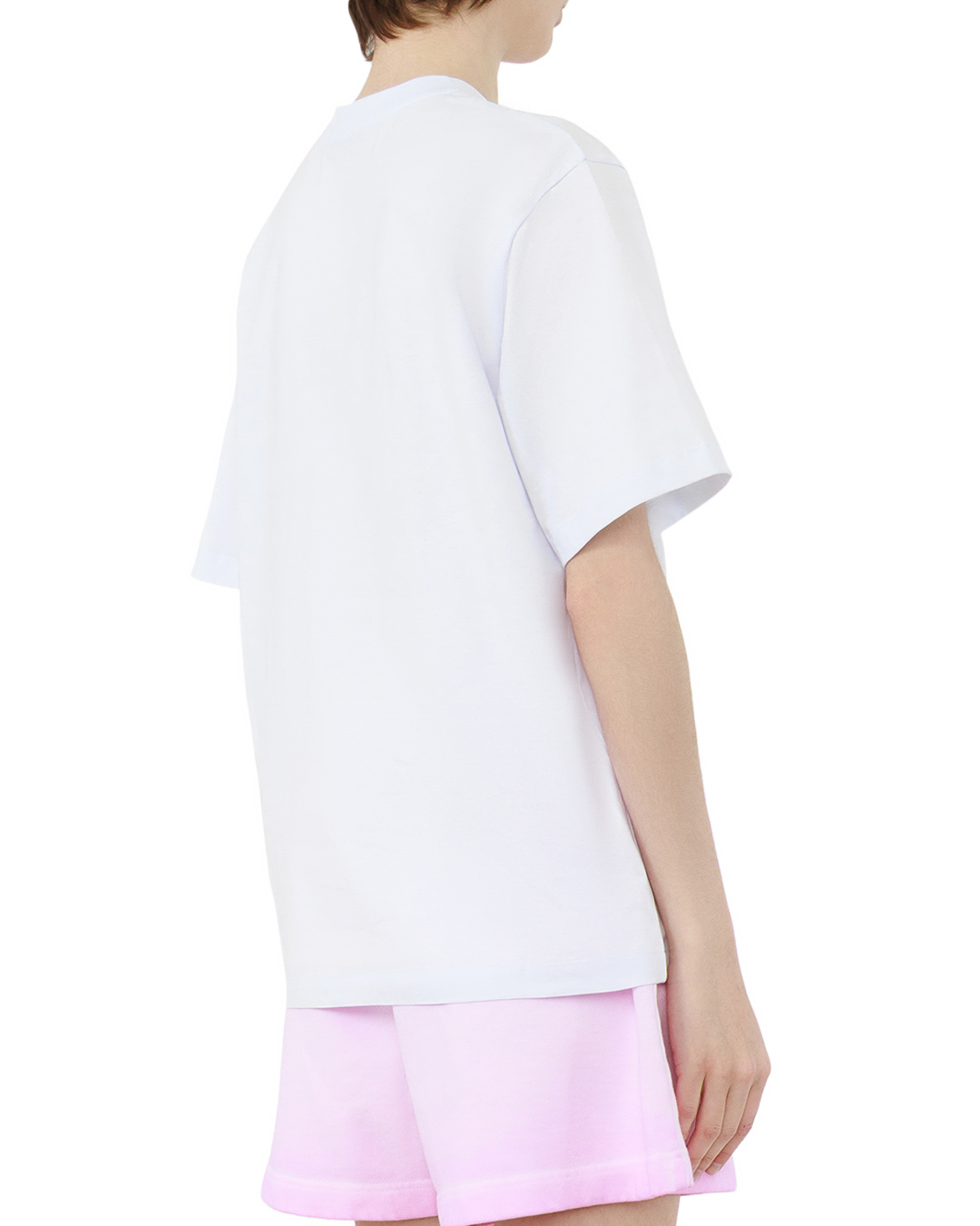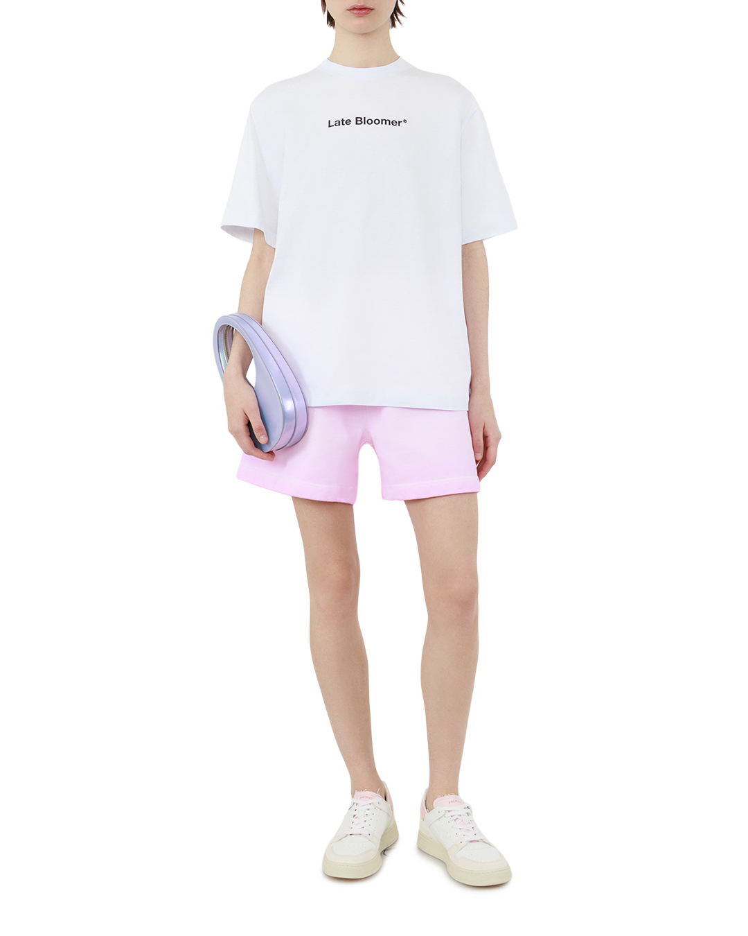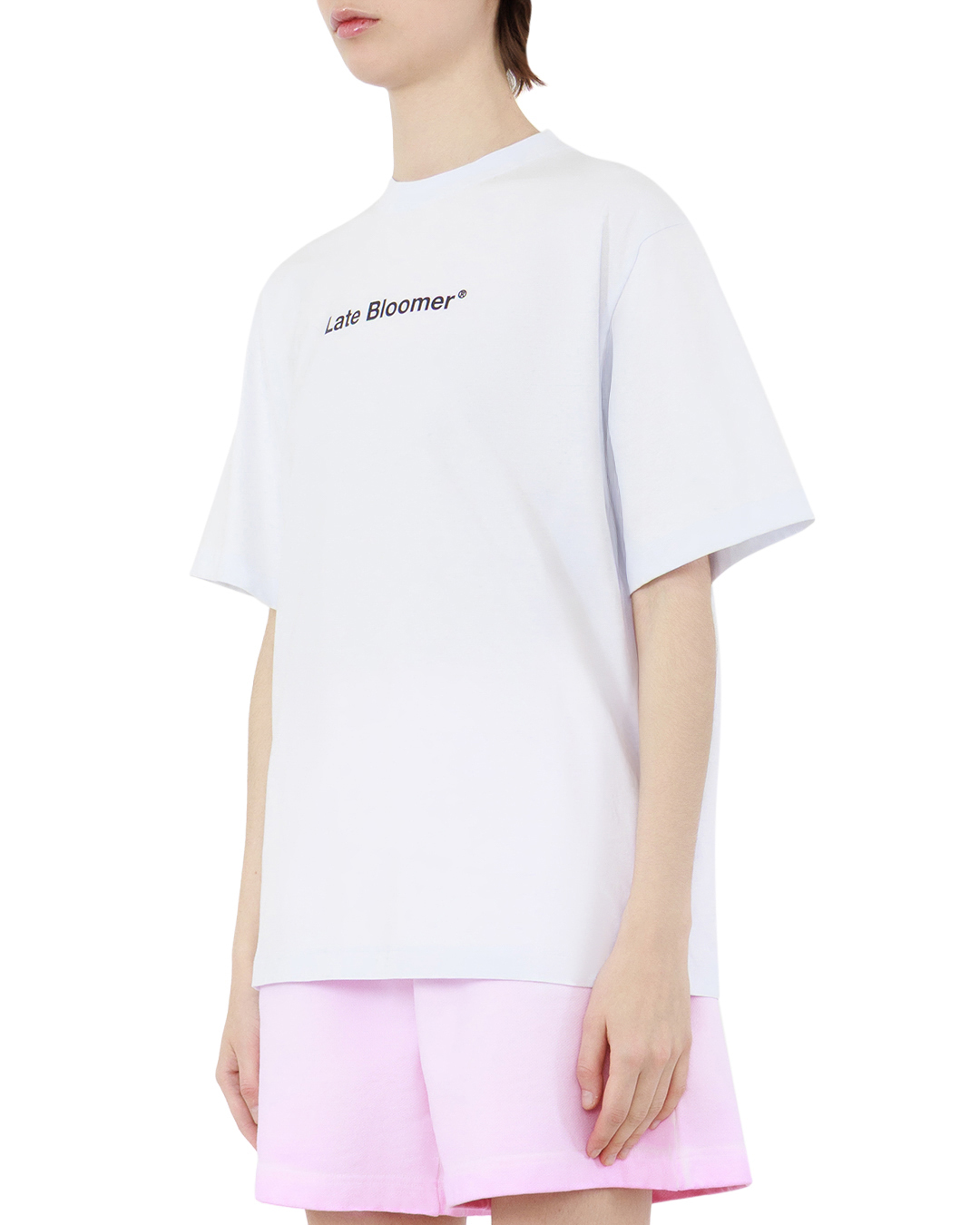 Эта белоснежная футболка — воплощение лаконичной элегантности и современного минимализма. Прямой, слегка свободный крой создаёт непринуждённый, но собранный силуэт, который легко адаптируется к разным стилям: от расслабленного кэжуала до более структурированных образов. Ключевой акцент модели — лаконичная текстовая композиция в верхней части груди. Шрифт выбран строгий, геометричный, что придаёт вещи характер и интеллектуальную сдержанность. Чёрная печать контрастирует с белоснежным фоном, подчёркивая графичность образа и не перегружая его. Круглый вырез горловины оформлен с особой тщательностью: аккуратная внутренняя окантовка обеспечивает комфорт при носке, не отвлекая от центрального акцента. Короткие рукава средней ширины поддерживают расслабленный характер модели, а их края обработаны ровной кромкой — это говорит о внимании к деталям и высоком качестве пошива. Низ изделия оформлен ровной кромкой с аккуратной отстрочкой, что подчёркивает завершённость силуэта и добавляет модели лёгкую динамику. На внутренней стороне горловины ненавязчиво размещён лейбл бренда, который служит дополнительным знаком качества, не выбиваясь из общей эстетики. Эта футболка — не просто элемент базового гардероба, а выразительный акцент, способный преобразить любой образ. Сочетание минималистичного принта и безупречной отделки делает её универсальной: она одинаково органично смотрится как с классическими джинсами, так и с более авангардными элементами гардероба. Чистота линий, продуманная композиция и безупречная отделка превращают эту вещь в стильный инструмент для создания образов с характером.