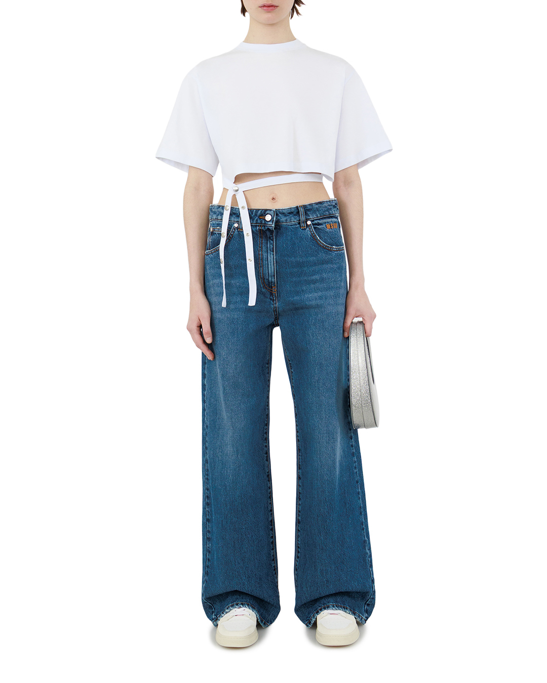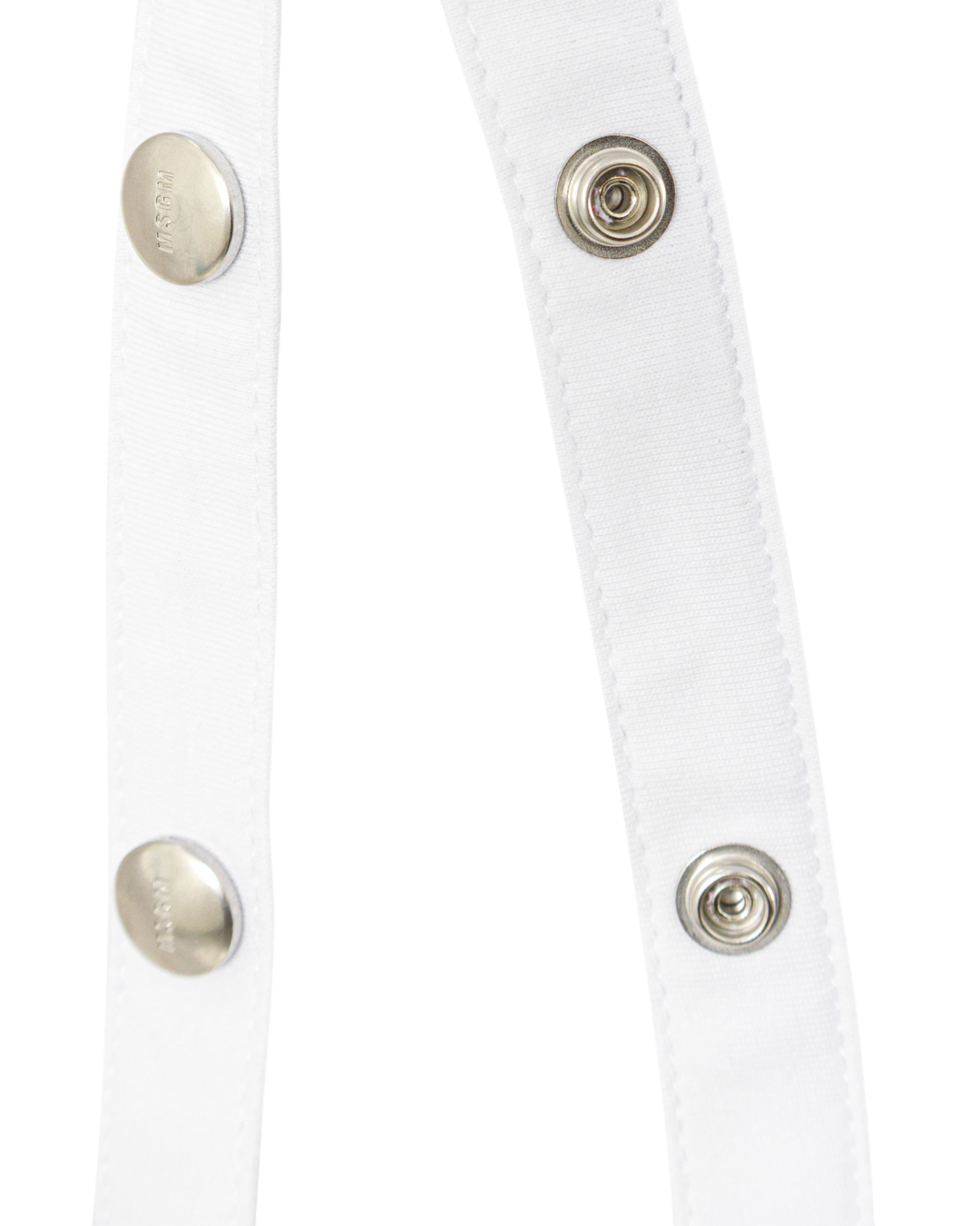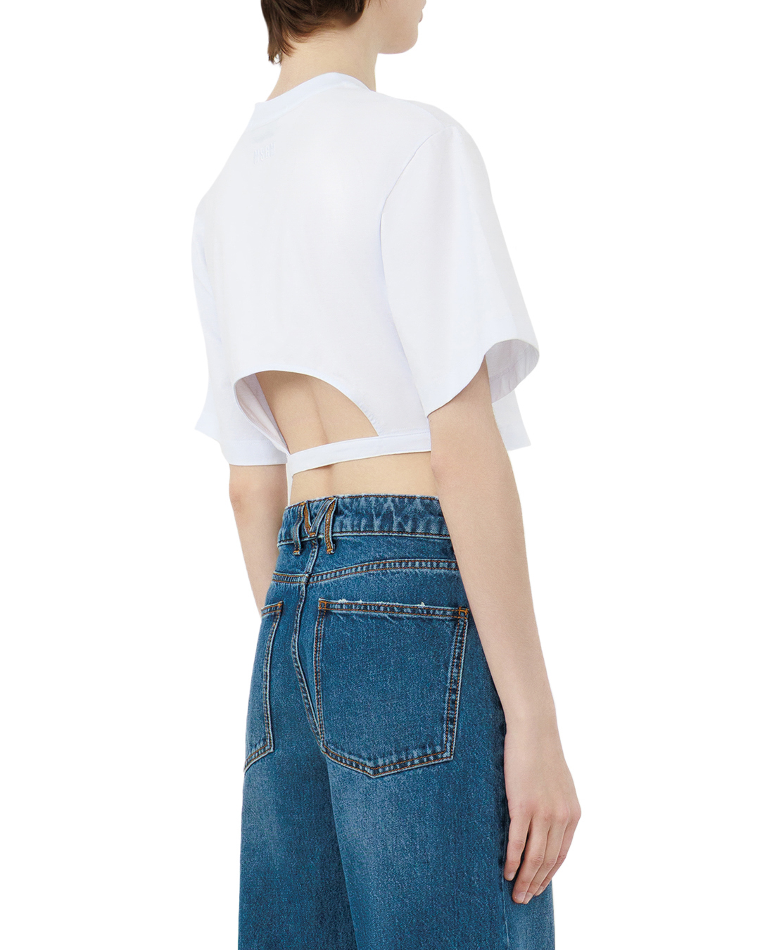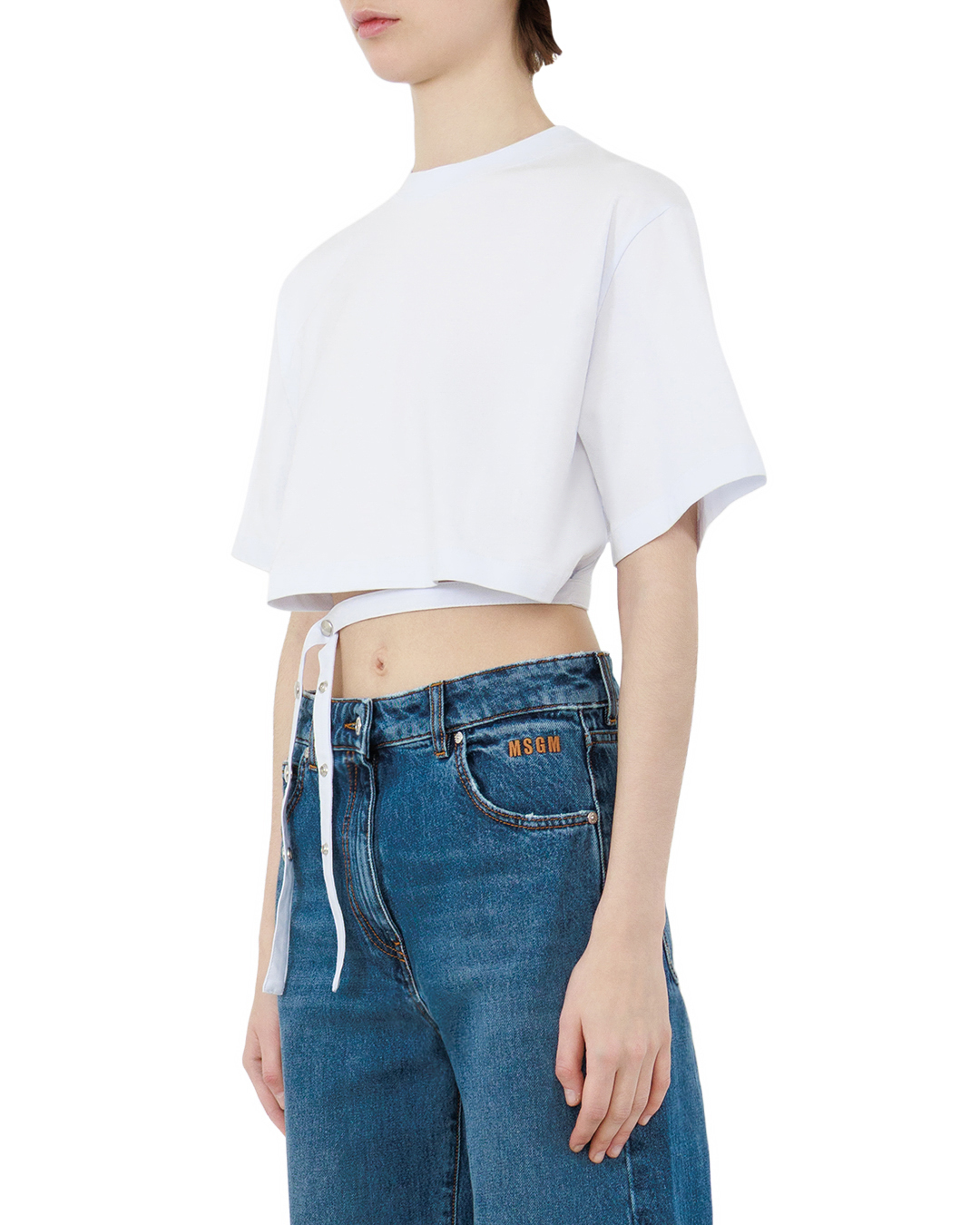 Эта белоснежная укороченная футболка — воплощение современного минимализма с изысканным акцентом. Свободный, слегка оверсайзный крой создаёт расслабленный, но структурированный силуэт, который подчёркивает индивидуальность и не сковывает движения. Главная изюминка модели — оригинальный элемент в виде удлинённого ремешка с декоративными пуговицами, который изящно обвивает бок изделия. Этот дизайнерский ход придаёт футболке динамику и графичность, превращая базовую вещь в выразительный акцент гардероба. Ремешок не только украшает, но и позволяет регулировать посадку, добавляя модели функциональности. Круглый вырез горловины оформлен с особой тщательностью: аккуратная внутренняя окантовка обеспечивает комфорт при носке, подчёркивая линию шеи без лишнего акцента. Короткие рукава средней ширины поддерживают общий расслабленный характер модели, а их края обработаны ровной кромкой — признак безупречного качества пошива. Низ изделия намеренно укорочен, что создаёт лёгкую асимметрию и подчёркивает линию талии. Аккуратная отстрочка по краю придаёт силуэту завершённость и дополнительную выразительность. На внутренней стороне горловины ненавязчиво размещён лейбл бренда, который служит знаком качества, не выбиваясь из общей эстетики. Эта футболка — не просто элемент базового гардероба, а стильный инструмент для создания образов с характером. Она одинаково органично впишется как в повседневный лук с джинсами-бойфрендами, так и в более дерзкий ансамбль с кожаной юбкой или брюками-карго. Чистота линий, продуманная композиция и безупречная отделка делают эту вещь незаменимой в гардеробе ценительницы современной моды.