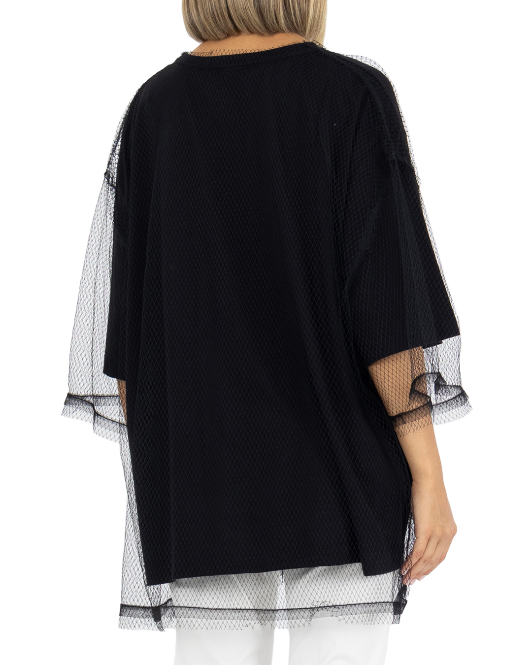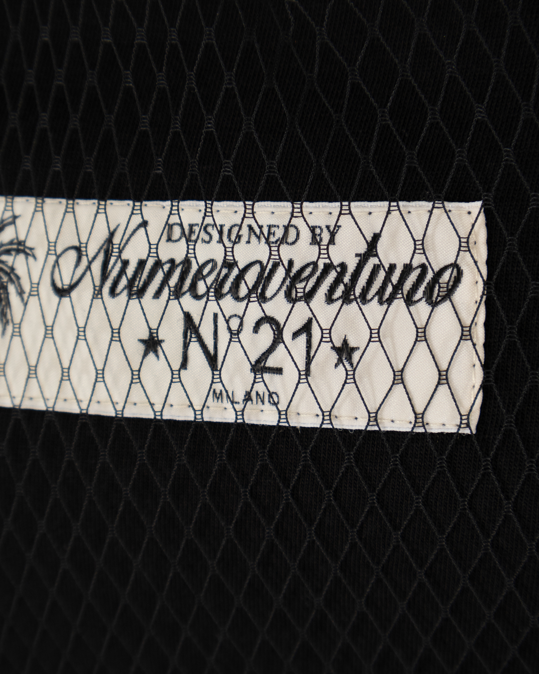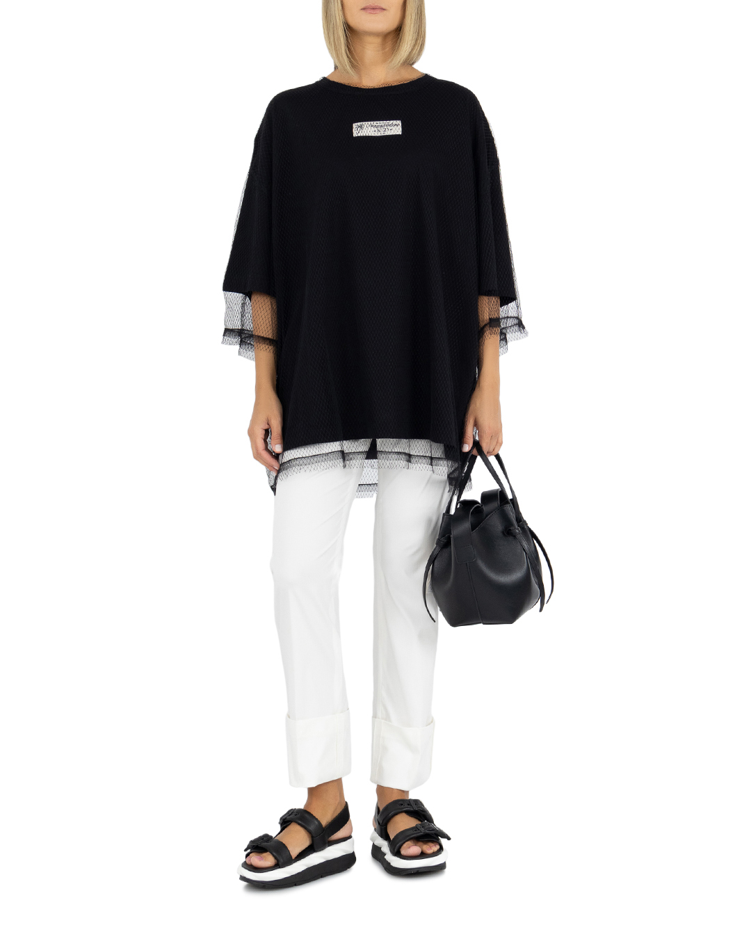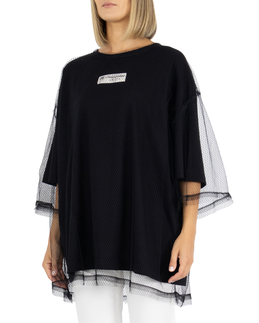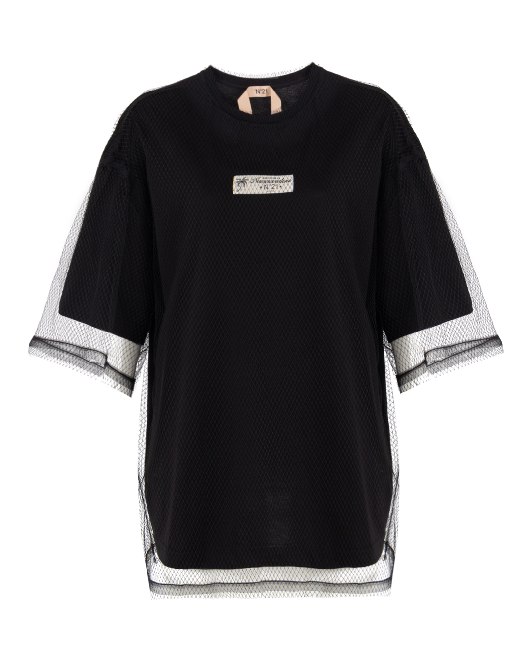 Футболка № 21 из трикотажного хлопка с отделкой тонкой сеткой. Эластичное изделие прямого удлиненного силуэта со спущенной линией плеч и широкими рукавами.