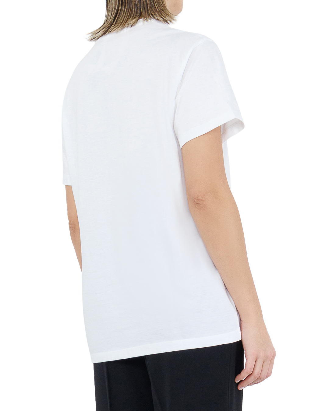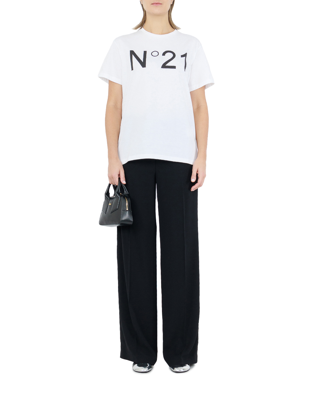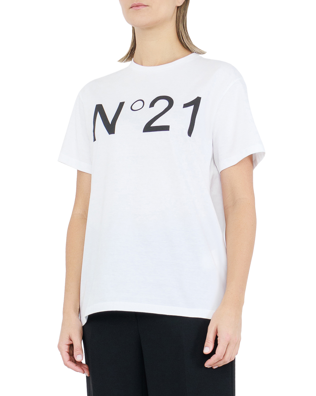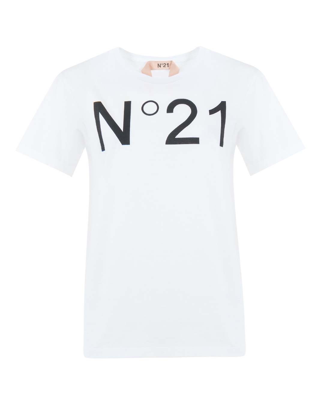 Футболка №21 — это идеальный пример стильного минимализма и современной элегантности. Чистый белый цвет создает свежий и утонченный фон, который делает черный логотип "N°21" центральным акцентом, придающим образу яркости и выразительности. Классический крой футболки с короткими рукавами и округлым вырезом горловины обеспечивает универсальную посадку и комфорт, идеально подходя для создания как кэжуал, так и более формальных образов. Высококачественный материал гарантирует долговечность и приятные ощущения на коже. Аккуратные швы и сдержанная отделка подчеркивают внимание к деталям, придавая изделию завершенность и изысканность. Легкость исполнения позволяет этой футболке стать основой вашего гардероба, легко комбинирующейся с любыми элементами — от джинсов до классических брюк. Безукоризненный вкус и сдержанная роскошь делают эту футболку незаменимой для тех, кто ценит качество и утонченность в каждой детали.