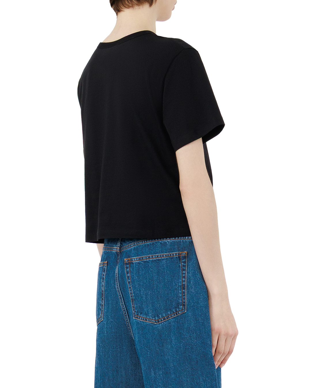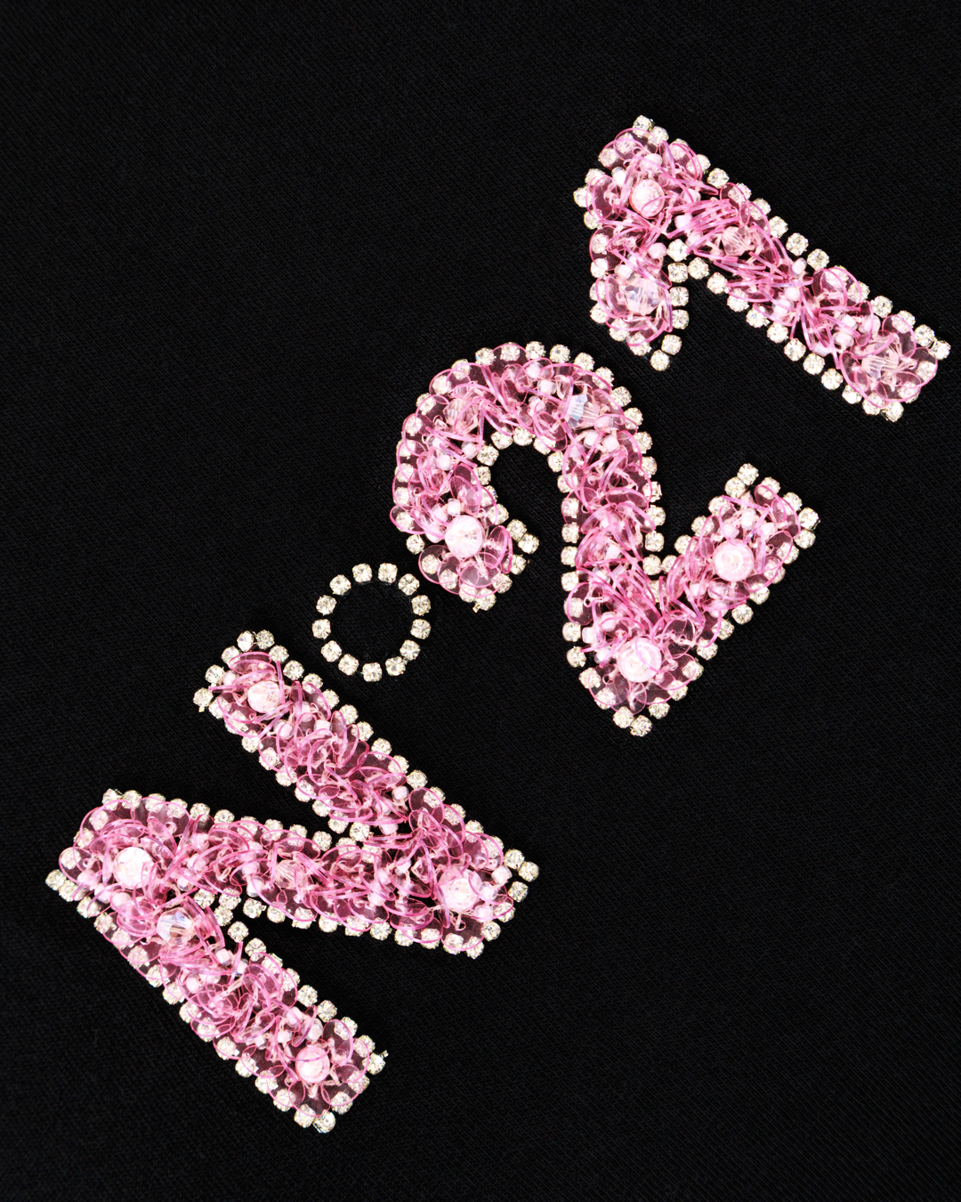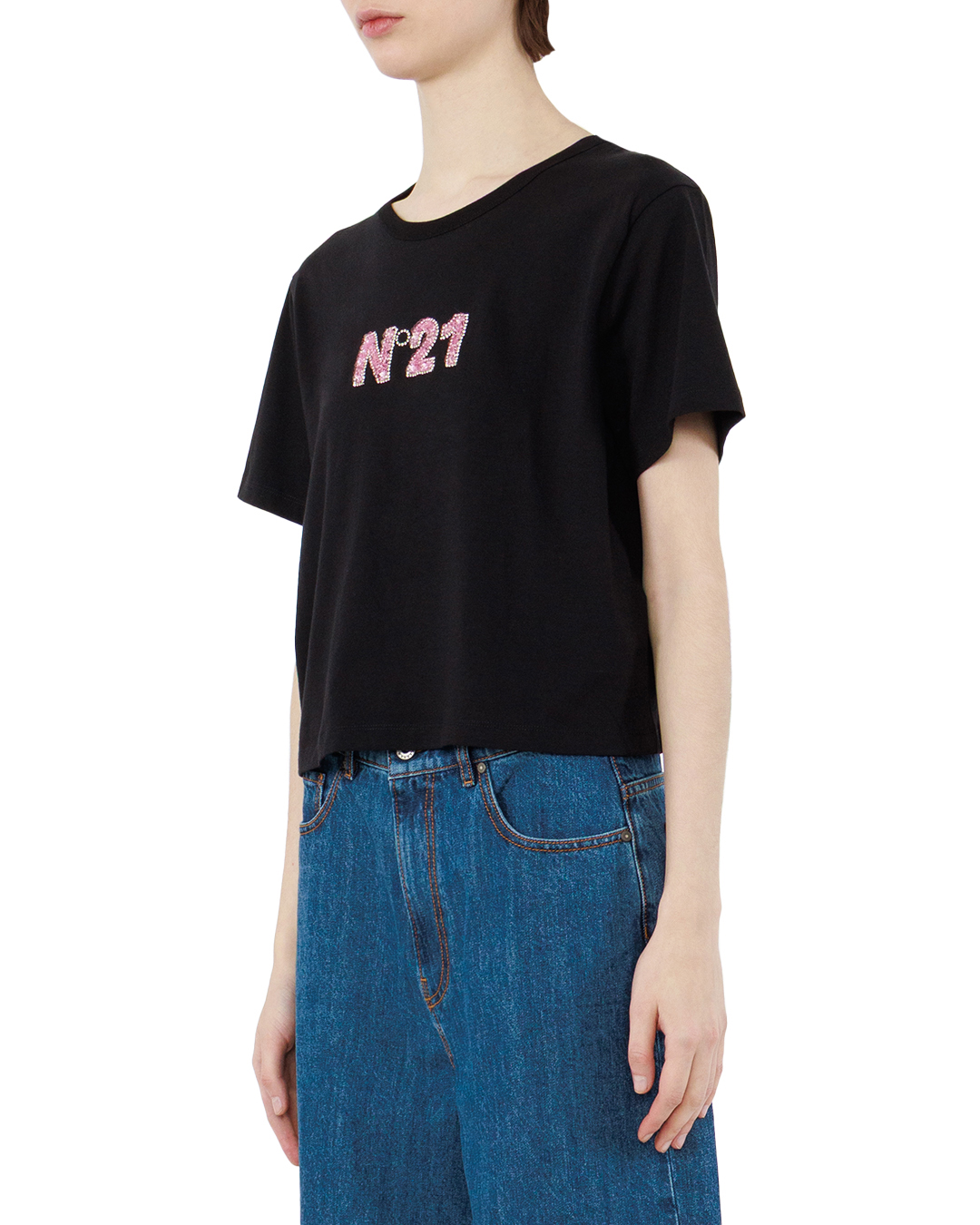 Эта чёрная футболка — воплощение лаконичной дерзости и современного шика. Укороченный крой подчёркивает линию талии, придавая силуэту лёгкую игривость, а классический круглый вырез обеспечивает комфорт и свободу движений, не перегружая образ. Ключевой акцент модели — выразительный логотип «№21», выполненный с использованием блестящих декоративных элементов. Розово-перламутровая россыпь создаёт завораживающий контраст на глубоком чёрном фоне, превращая лаконичную вещь в эффектный элемент гардероба. Декор не просто украшает футболку — он задаёт характер, добавляет нотку гламура, не переходя грань вычурности. Продуманная обработка краёв изделия выполнена безупречно: аккуратная строчка не бросается в глаза, но подчёркивает качество пошива. Рукава средней длины гармонично дополняют силуэт, сохраняя баланс между расслабленностью и собранностью. Эта футболка легко станет основой для множества образов: она одинаково хорошо смотрится как с классическими джинсами, так и с юбкой-карандашом или кожаными брюками. Благодаря выразительному, но сдержанному декору вещь позволяет создавать образы с характером — от повседневного кэжуала до более нарядного ансамбля. Она подчёркивает индивидуальность, добавляет облику лёгкую провокационность и современный лоск.