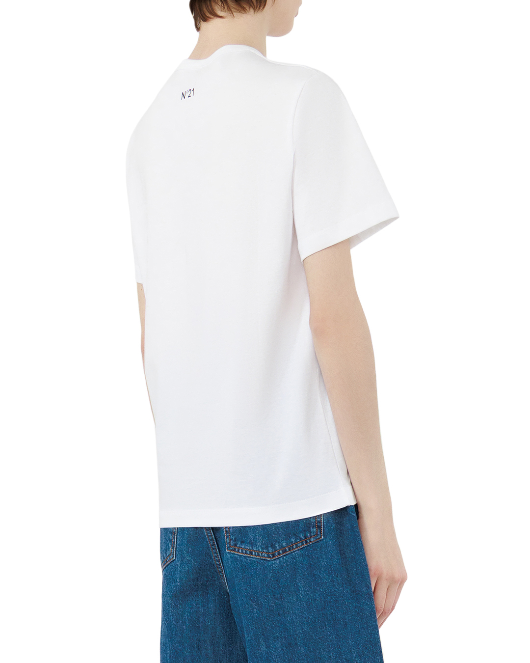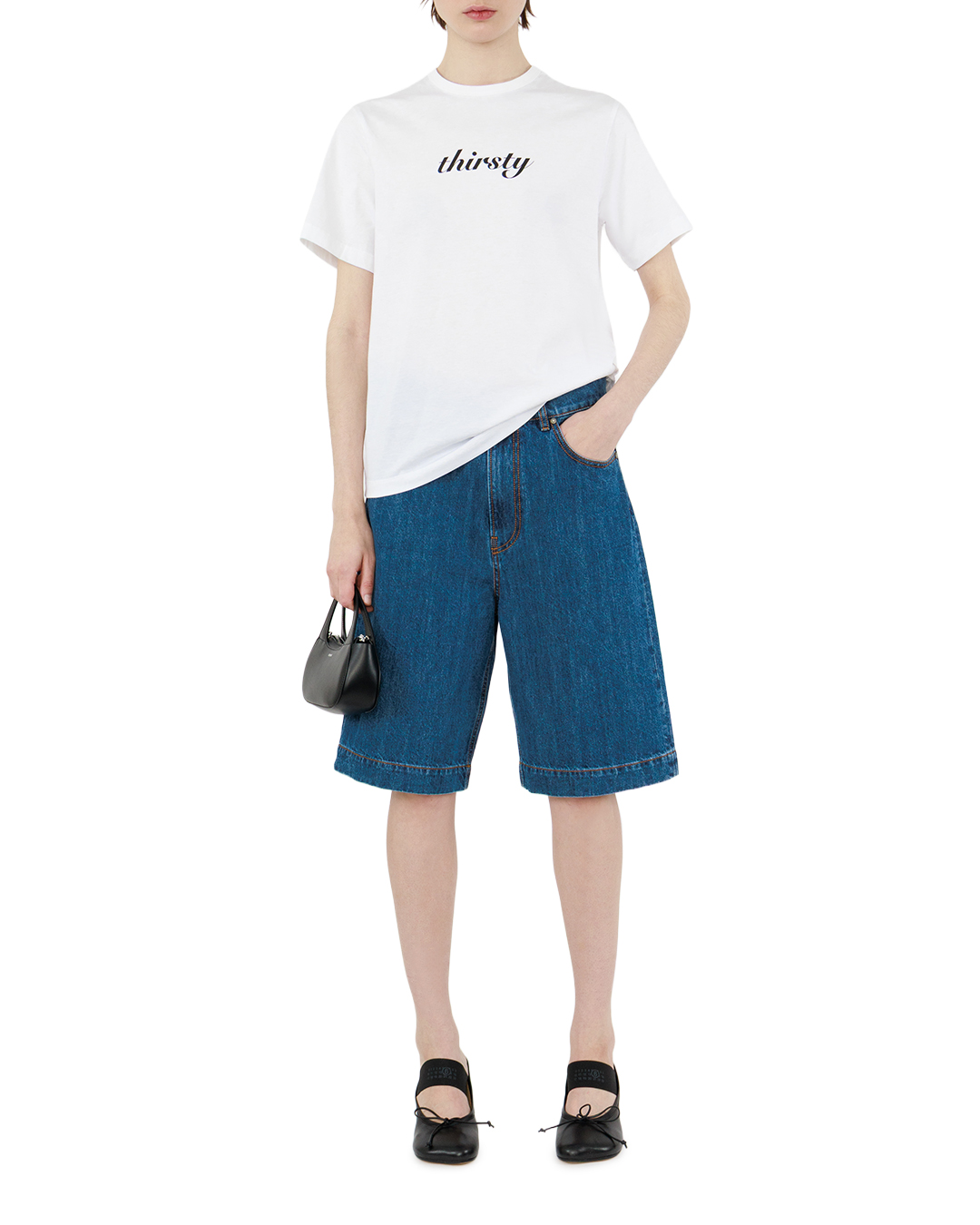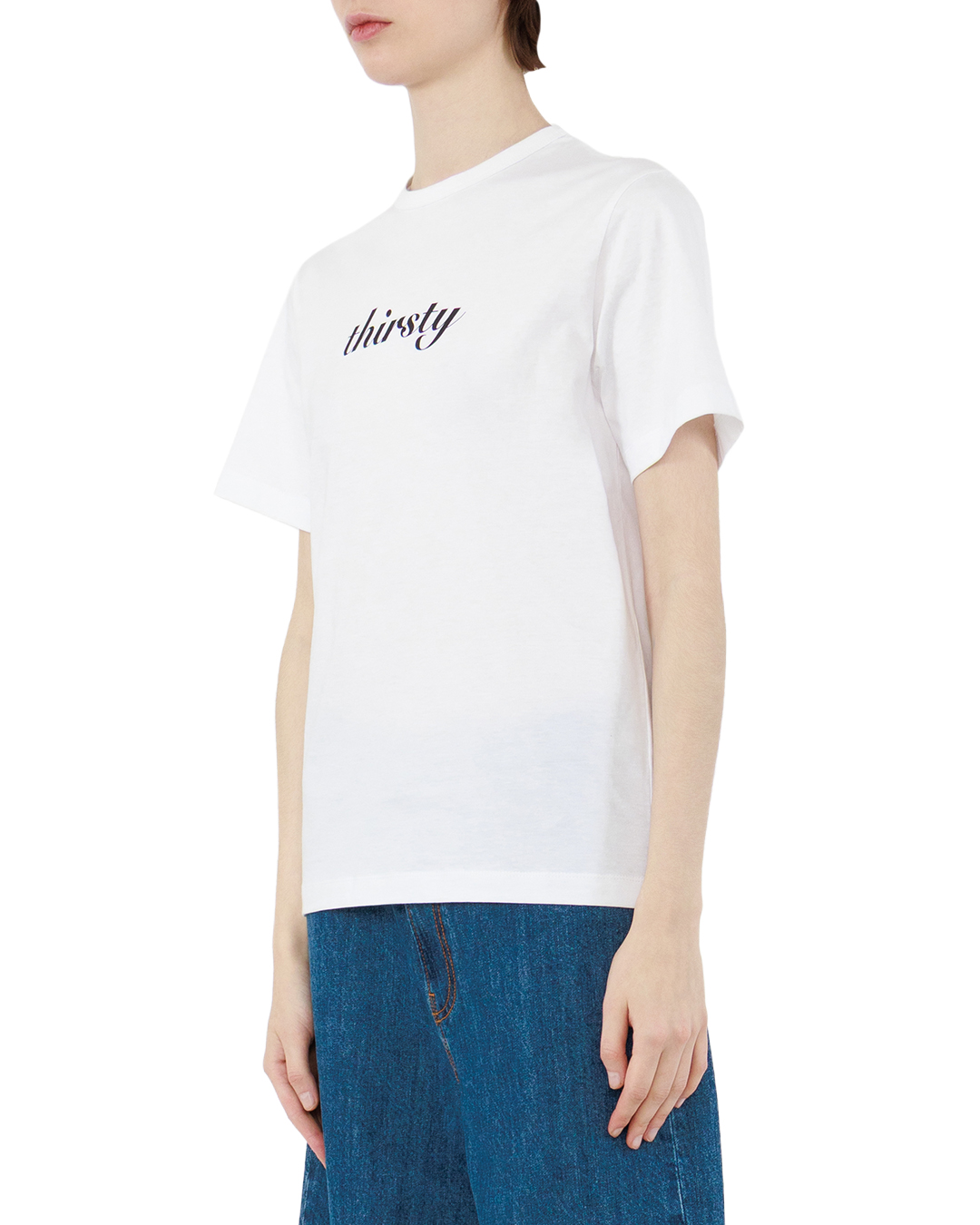 Эта белоснежная футболка — образец лаконичной элегантности с ноткой дерзкого настроения. Прямой, слегка удлинённый крой создаёт расслабленный, но собранный силуэт, который одинаково хорошо смотрится как в повседневном, так и в слегка приподнятом образе. Классический круглый вырез горловины обеспечивает комфорт и не отвлекает внимание от главного акцента модели. Изюминка футболки — выразительная надпись, выполненная изящным каллиграфическим шрифтом. Тёмный цвет букв создаёт эффектный контраст на безупречной белой основе, превращая простую вещь в стильный манифест. Шрифт подобран с особым вкусом: плавные линии и динамичный наклон придают образу лёгкую игривость, не переходя грань эпатажа. Особое внимание заслуживает отделка горловины: аккуратный подгиб и ровная строчка подчёркивают качество пошива, не нарушая минималистичную эстетику. Края рукавов обработаны классическим способом — чистый подгиб без лишних деталей, что добавляет вещи сдержанности. Низ изделия оформлен с лёгкой асимметрией, что придаёт модели современный характер. Эта футболка легко станет центральным элементом гардероба: она гармонично сочетается с джинсами, шортами или даже классическими брюками. Благодаря удачному балансу между простотой и выразительным акцентом вещь позволяет создавать образы с характером — от непринуждённого кэжуала до стильного городского лука. Она подчёркивает индивидуальность, добавляет облику лёгкую провокационность и современный шик.