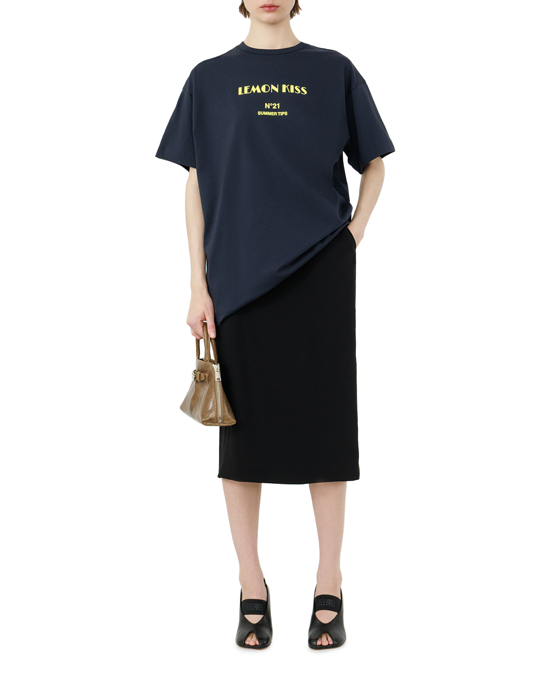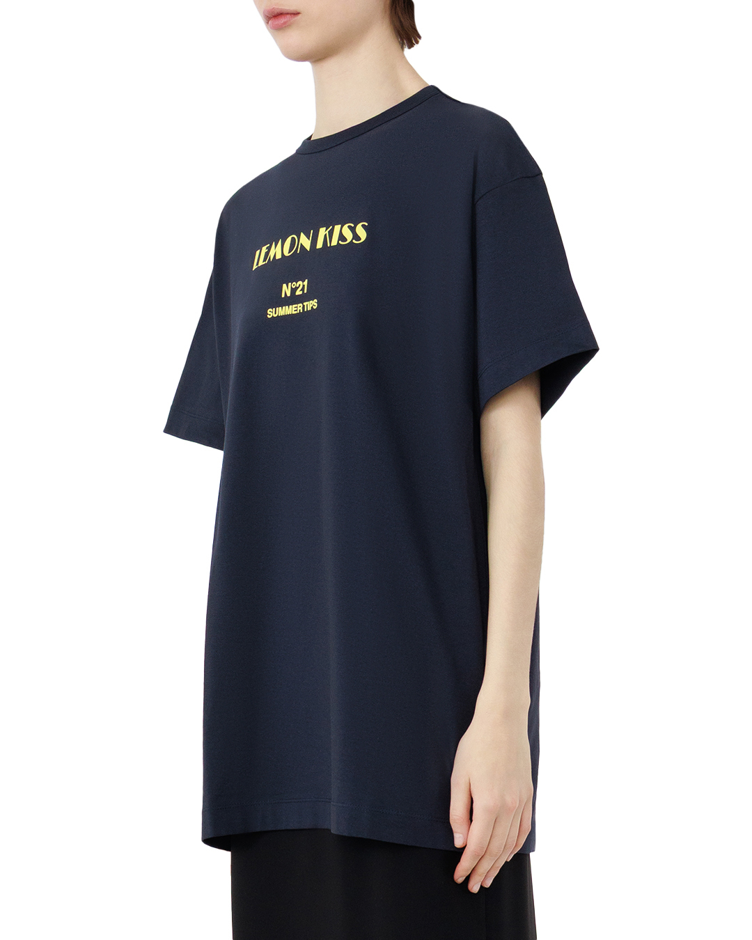 Эта тёмно-синяя футболка — воплощение летнего настроения в лаконичном дизайне. Оверсайзный крой создаёт расслабленный, но стильный силуэт, который дарит свободу движений и подчёркивает современный подход к моде. Классический круглый вырез горловины обеспечивает комфорт, не отвлекая внимания от главного акцента модели — выразительного принта. Яркая надпись выполнена крупным шрифтом насыщенного жёлтого оттенка, который эффектно контрастирует с глубоким цветом основы. Этот графический элемент задаёт настроение и превращает простую футболку в выразительный элемент гардероба. Чуть ниже, в более сдержанном исполнении, располагается дополнительная надпись — она добавляет образу лёгкую игривость и отсылает к летней тематике, не перегружая композицию. Особое внимание заслуживает отделка изделия: аккуратная строчка по горловине и рукавам подчёркивает качество пошива, а ровные подгибы краёв придают вещи законченный вид. Рукава средней длины гармонично дополняют силуэт, сохраняя баланс между расслабленностью и собранностью. Низ футболки оформлен с лёгкой асимметрией, что придаёт модели современный характер. Эта футболка легко станет основой для множества образов: она одинаково хорошо смотрится как с классическими джинсами, так и с лёгкими шортами или юбкой. Благодаря удачному сочетанию насыщенного цвета, выразительного принта и продуманной отделки вещь позволяет создавать образы с характером — от непринуждённого кэжуала до стильного летнего лука. Она подчёркивает индивидуальность, добавляет облику лёгкости и свежести, идеально вписываясь в атмосферу тёплых дней.