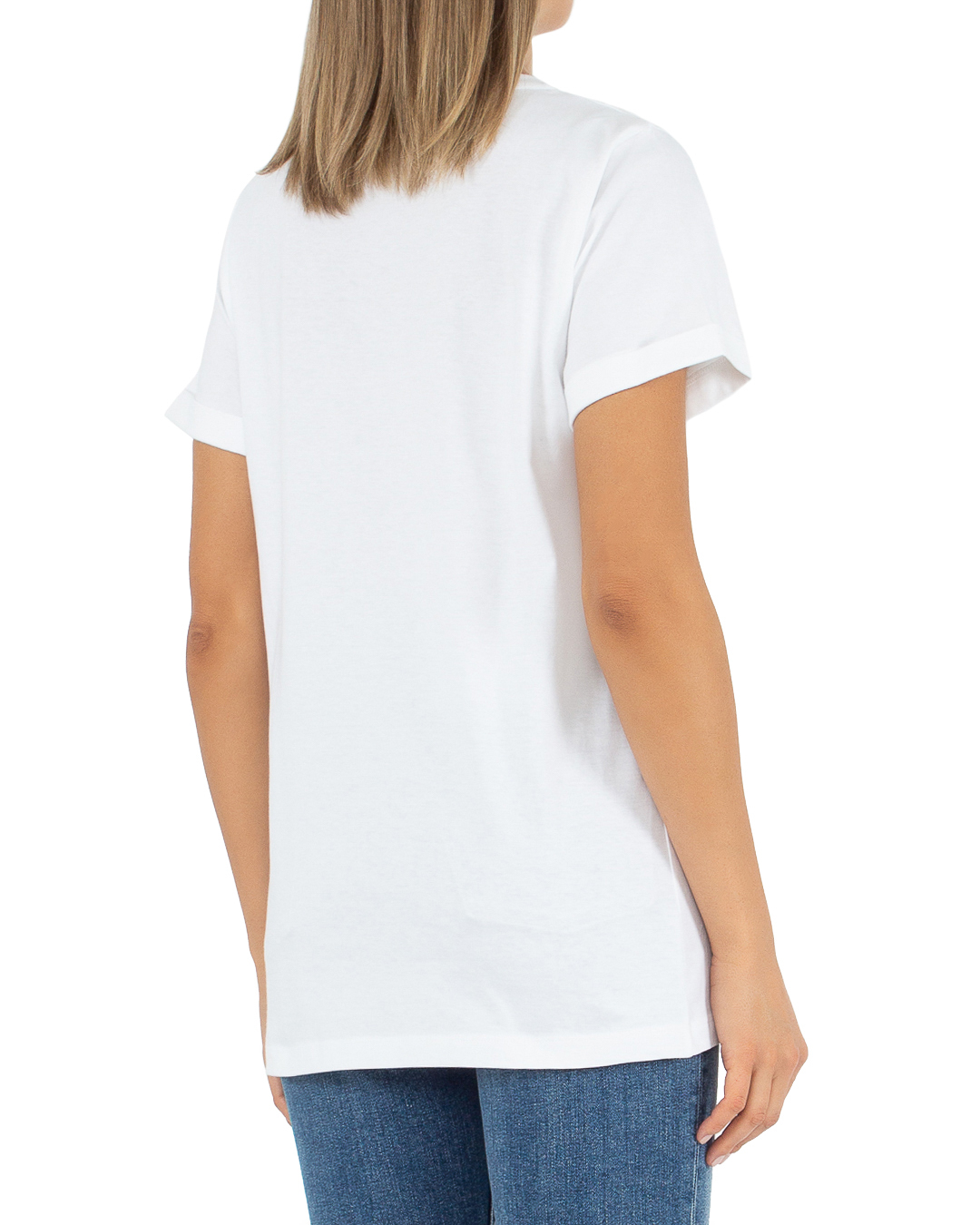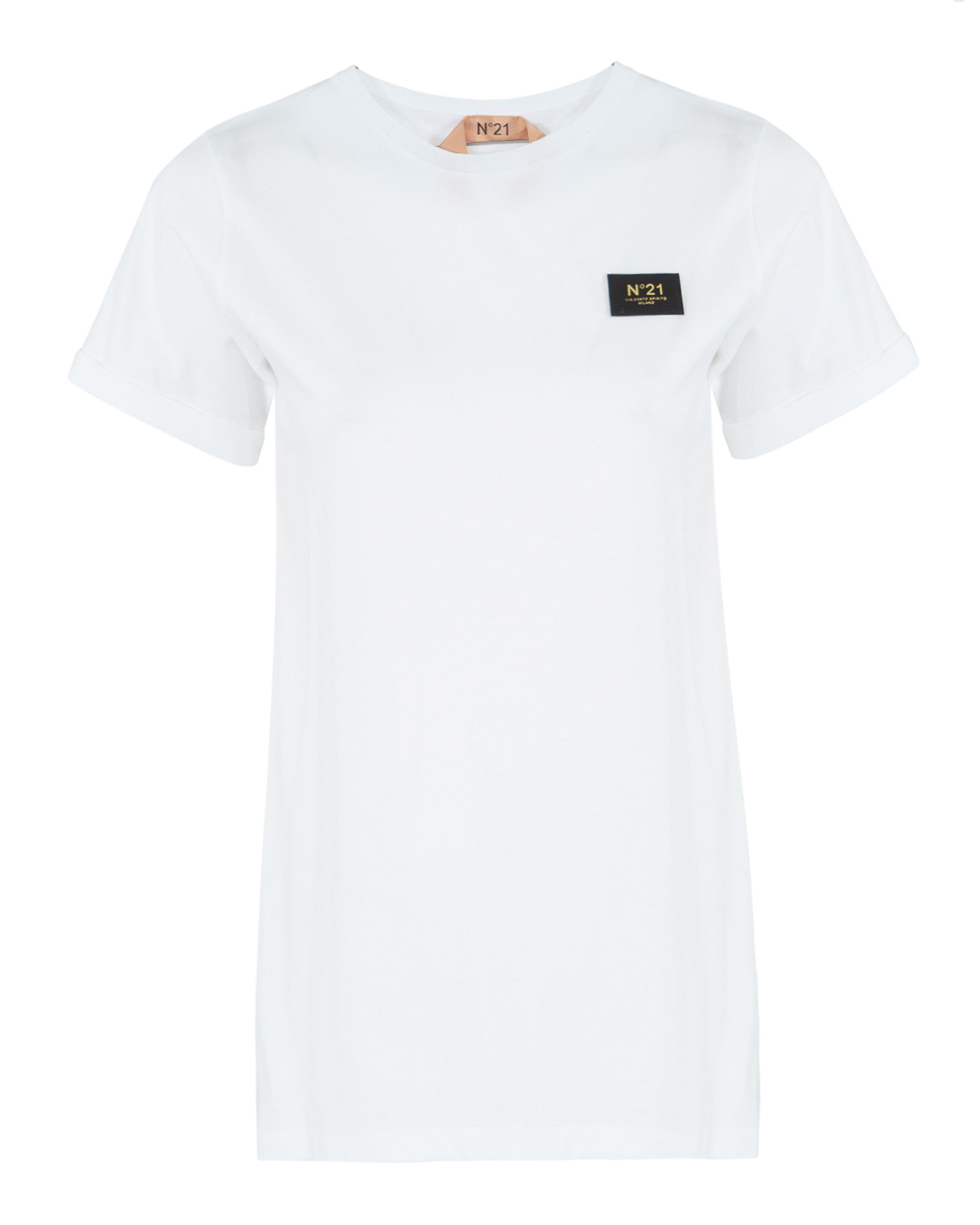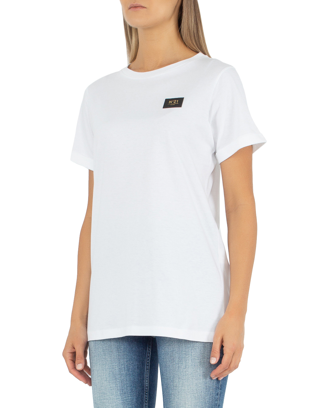 Футболка № 21 из трикотажного хлопка белого цвета с логотипом бренда. Модель прямого удлиненного силуэта с круглой линией выреза.
