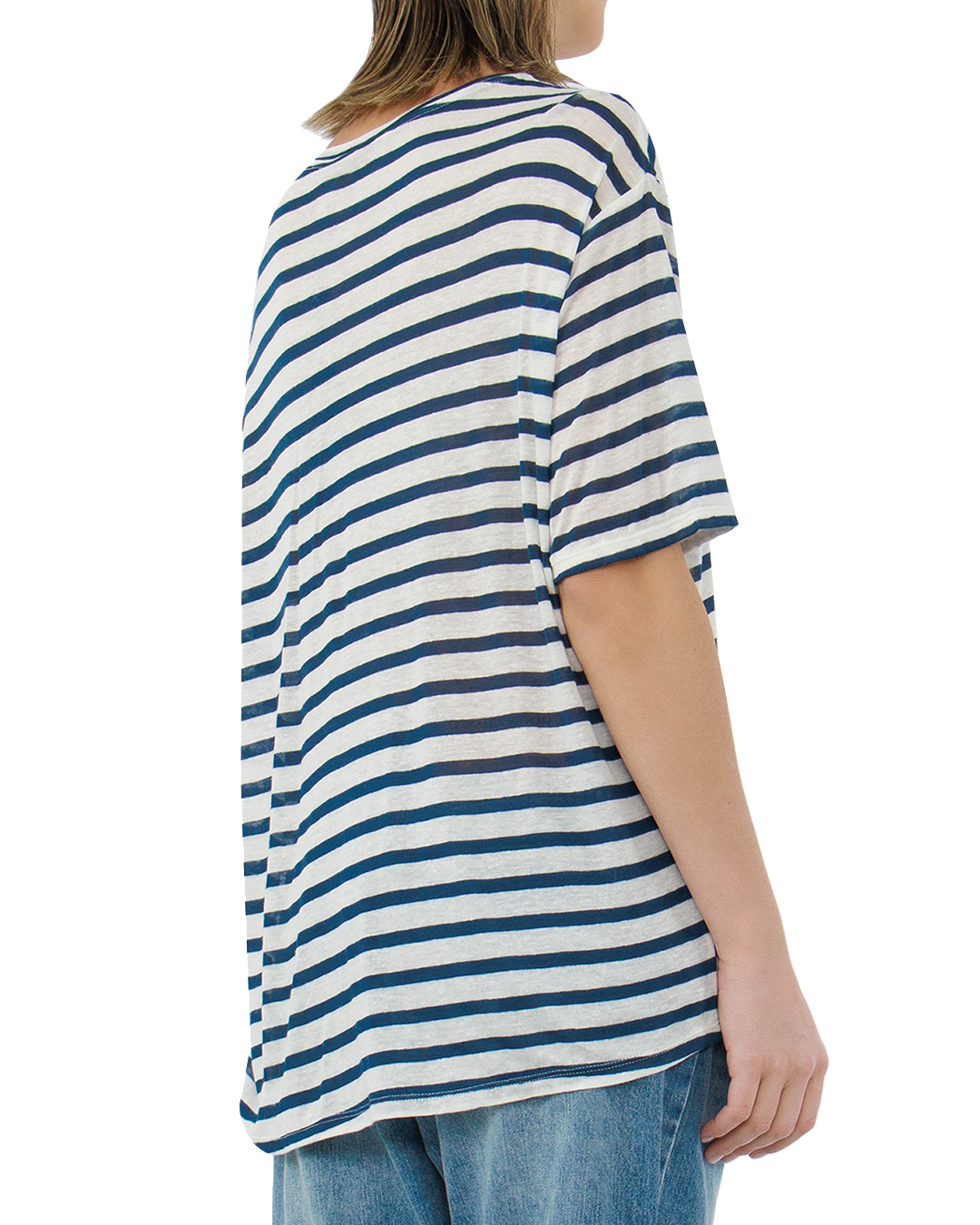 Футболка свободного кроя с заниженной линией плеч изготовлена из тонкой вискозы с добавлением льна