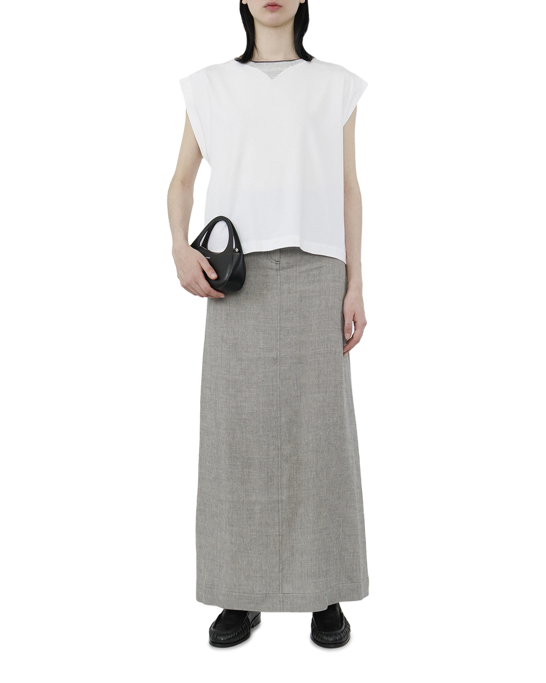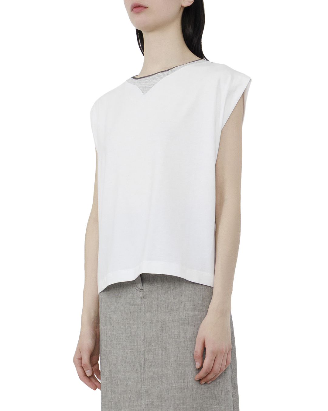 Эта футболка — воплощение современного комфорта с утонченными деталями, которые делают её особенной. Изготовленная из высококачественного хлопка, она обеспечивает ощущение легкости и непринужденности, идеально подходя для любого времени года. Чистый белый цвет делает её универсальной основой для любого гардероба, добавляя свежести и изысканности. Круглая горловина украшена контрастной трикотажной вставкой, которая добавляет спортивный элемент и визуально выделяет линию шеи. Эта деталь придаёт классическому фасону футболки современный и динамичный вид. Широкая пройма с укороченными рукавами создает эффект лёгкости и непринужденности, делая её идеальной для создания многослойных комплектов. Окантовка и швы выполнены с высоким профессионализмом, подчеркивая внимание к деталям. Эта футболка великолепно комбинируется как с повседневными джинсами, так и с элегантными юбками, позволяя вам экспериментировать и создавать разнообразные образы. Это незаменимый элемент гардероба для тех, кто ценит стиль и комфорт в каждой детали.