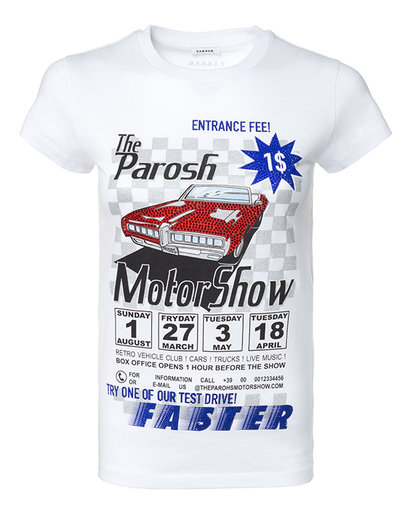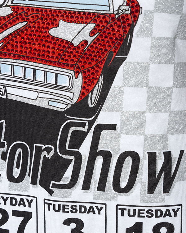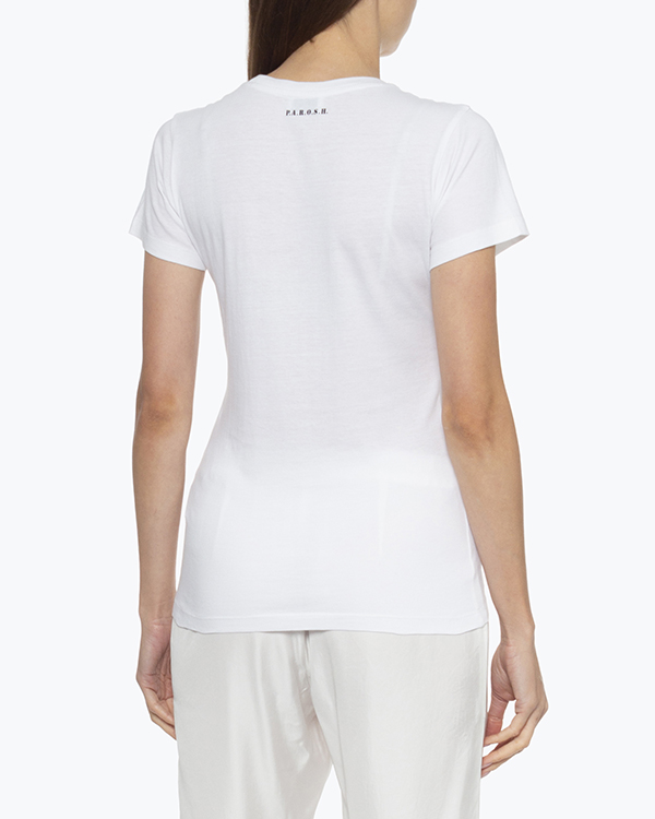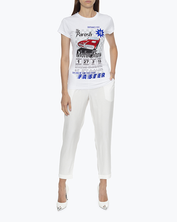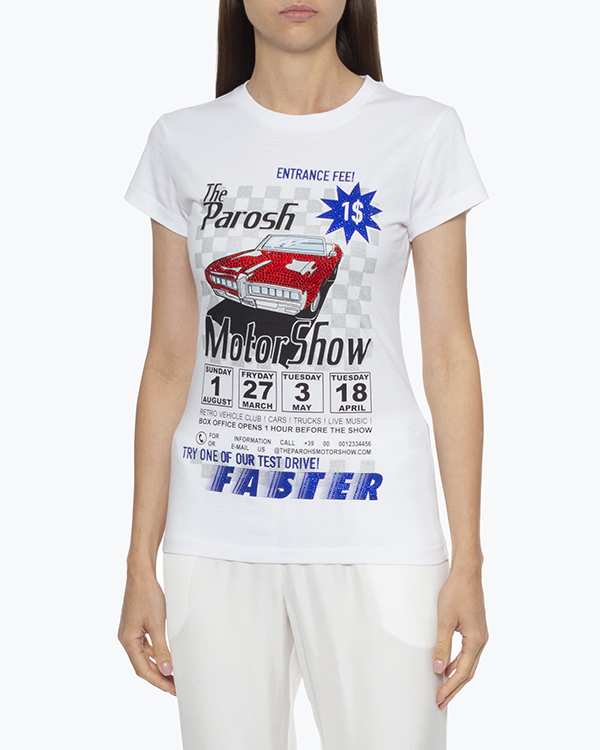 Футболка из трикотажного хлопка белого цвета с принтом и отделкой кристаллами. Модель полуприлегающего силуэта с круглой линией выреза.