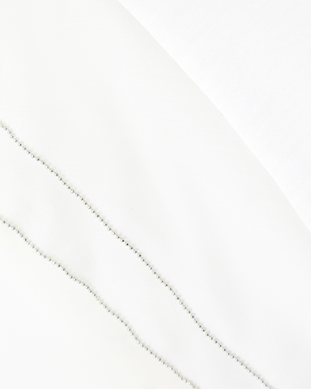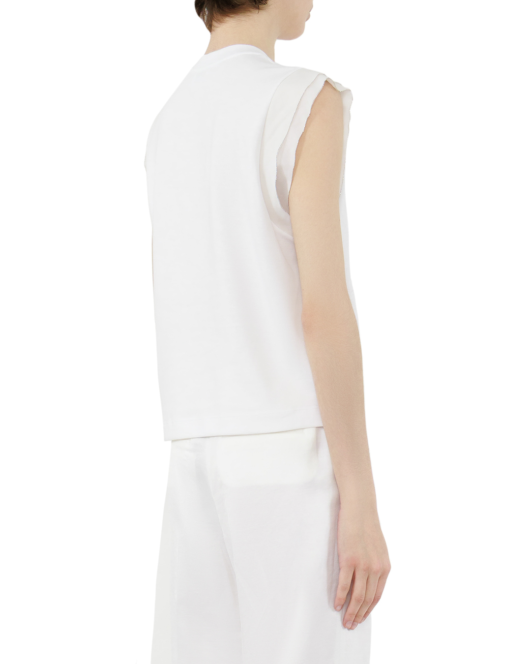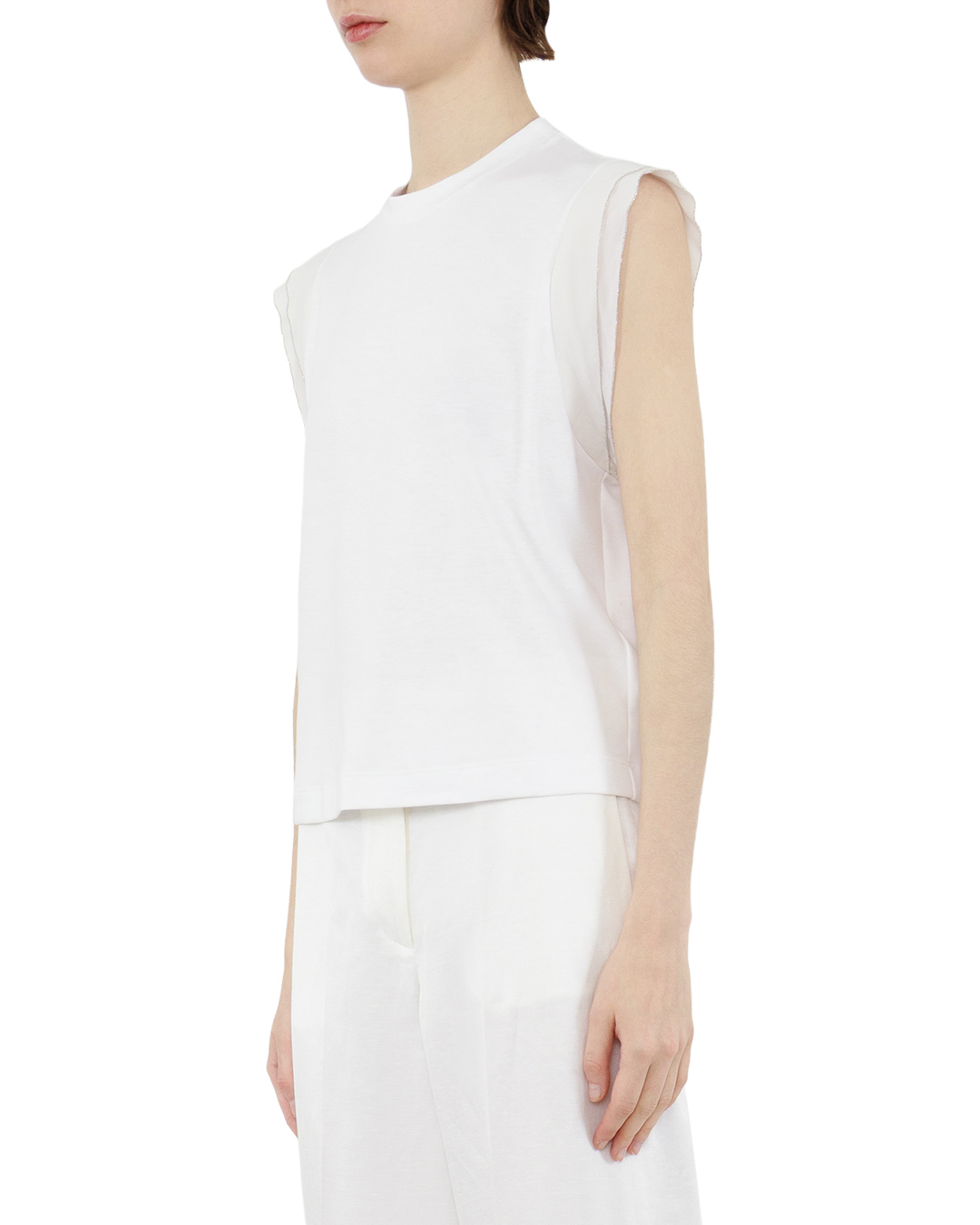 Этот белоснежный топ — квинтэссенция лаконичной элегантности. Прямой, слегка удлинённый силуэт мягко подчёркивает линии фигуры, создавая баланс между свободой кроя и утончённой сдержанностью. Классический круглый вырез горловины выполнен с безупречной аккуратностью: ровная обработка края придаёт изделию изысканную завершённость, не отвлекая от общей чистоты образа. Особенный шарм топу придают рукава: их конструкция сочетает в себе простоту и изящество — полупрозрачные вставки по краям создают эффект лёгкости, словно крылья, обрамляющие плечи. Тонкая отстрочка по контуру вставок работает как деликатный акцент, подчёркивая продуманность дизайна и мастерство исполнения. Низ изделия оформлен ровным подрезом, который поддерживает гармоничную симметрию силуэта. Отсутствие лишнего декора делает этот топ универсальной базой для самых разных образов — от минималистичного до многослойного. Чистота линий, выверенные пропорции и изысканная простота отделки превращают простую вещь в стильный элемент гардероба, способный стать центральным акцентом любого лука.