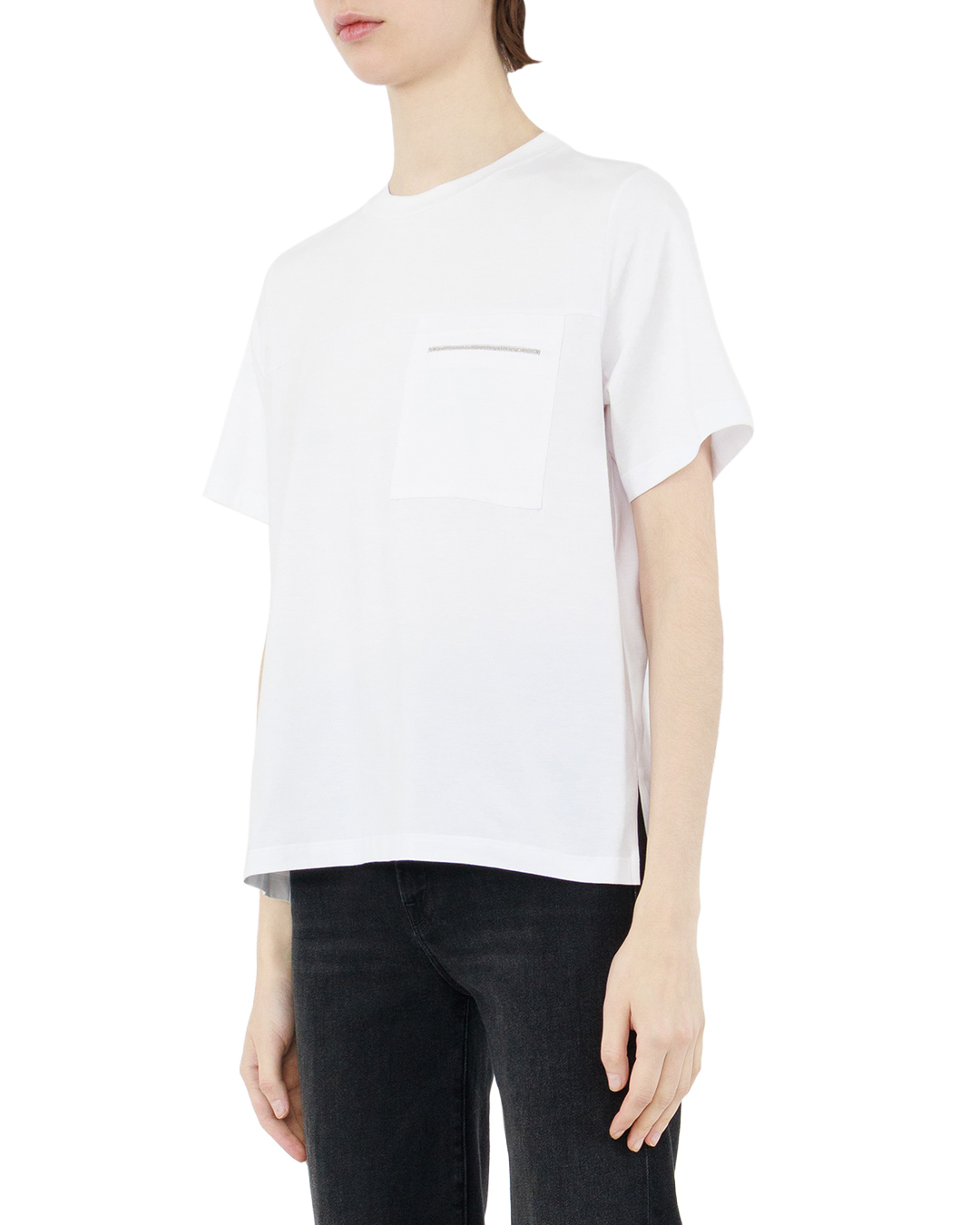 Эта белоснежная футболка — образец безупречного минимализма, в котором каждая деталь продумана до мелочей. Прямой, слегка удлинённый силуэт создаёт ощущение непринуждённой элегантности, мягко облегая фигуру и не сковывая движений. Классический круглый вырез горловины выполнен с особой тщательностью: аккуратная обработка края подчёркивает изысканность модели, не отвлекая от общей лаконичности образа. Короткий рукав с мягкими линиями органично дополняет композицию, сохраняя лёгкость и свободу кроя. Особого внимания заслуживает нагрудный карман — лаконичный элемент, который добавляет изделию практичности без ущерба для эстетики. Тонкая декоративная отстрочка на кармане работает как деликатный акцент: она оживляет минималистичный дизайн, придавая ему характер и индивидуальность. Чистота белого оттенка и выверенные пропорции превращают эту футболку в универсальную базу для самых разных образов — от расслабленного кэжуал до более структурированных комбинаций. Элегантная простота отделки и продуманность каждой детали делают эту вещь не просто предметом гардероба, а стильным инструментом для создания выразительных луков.