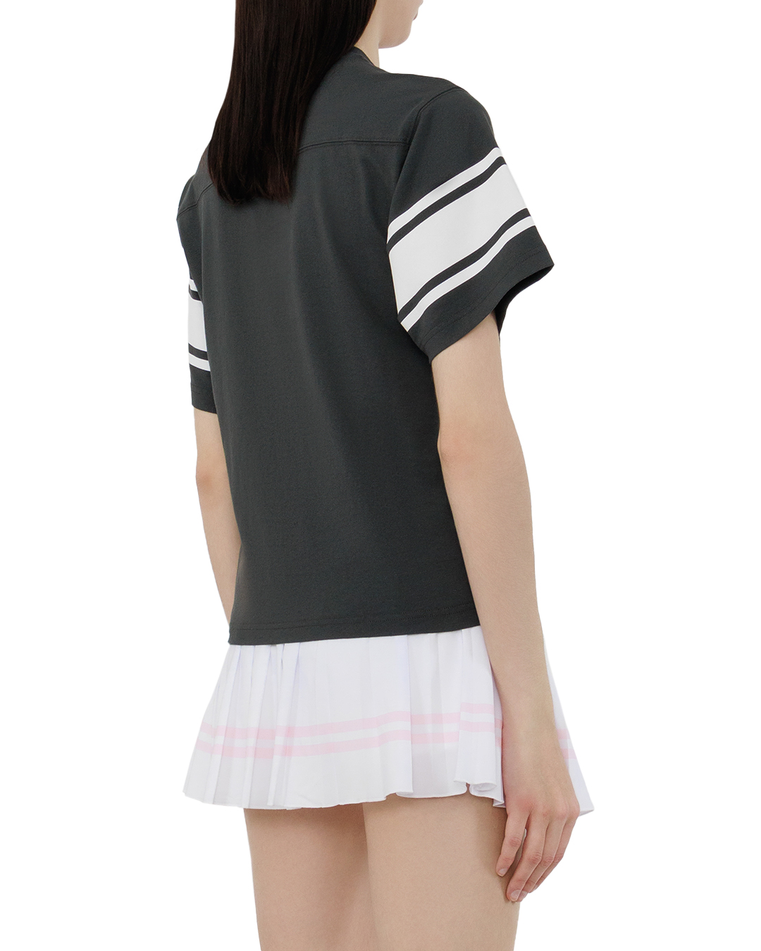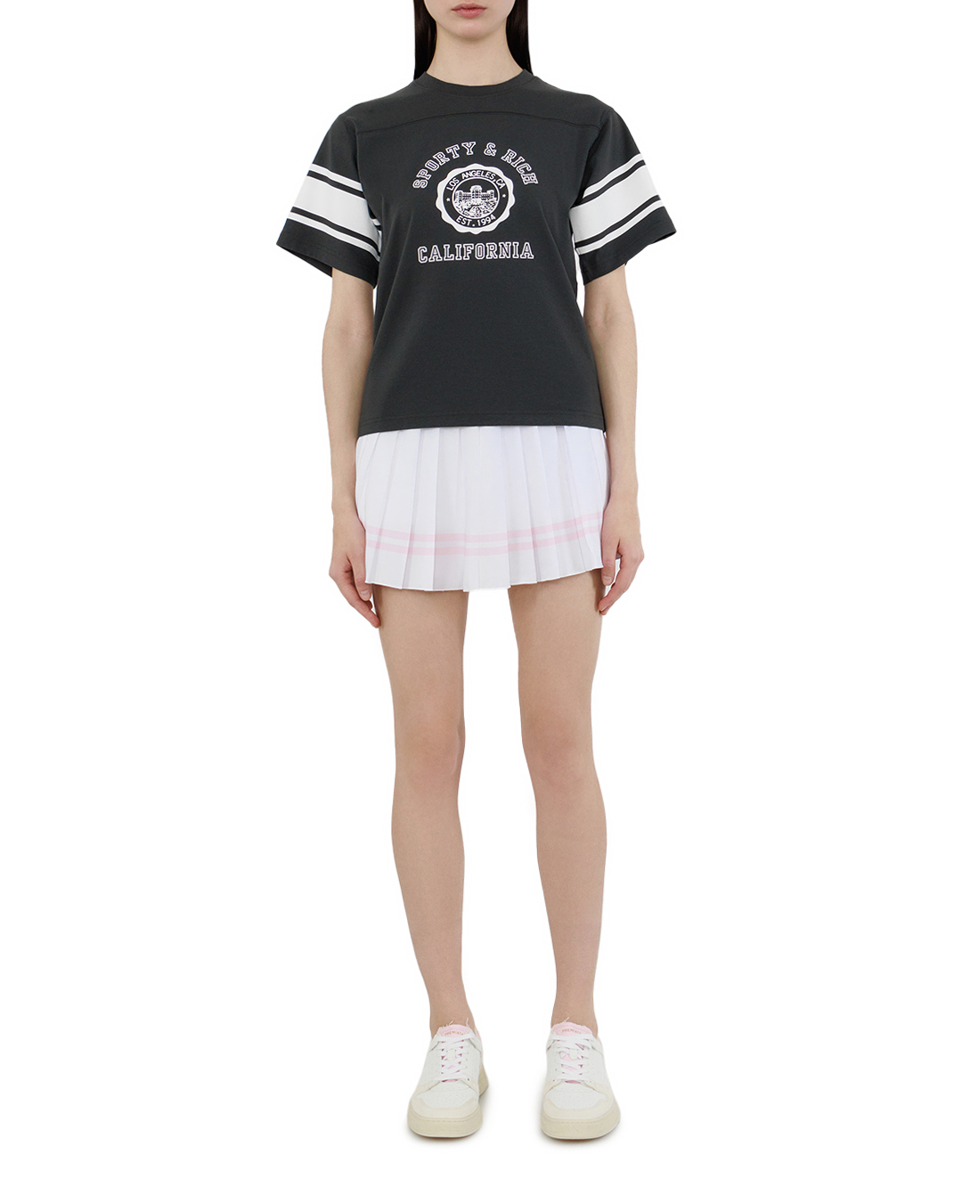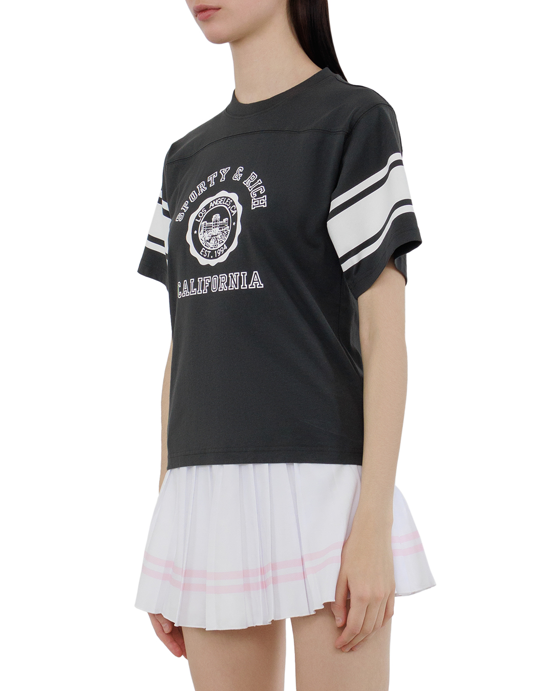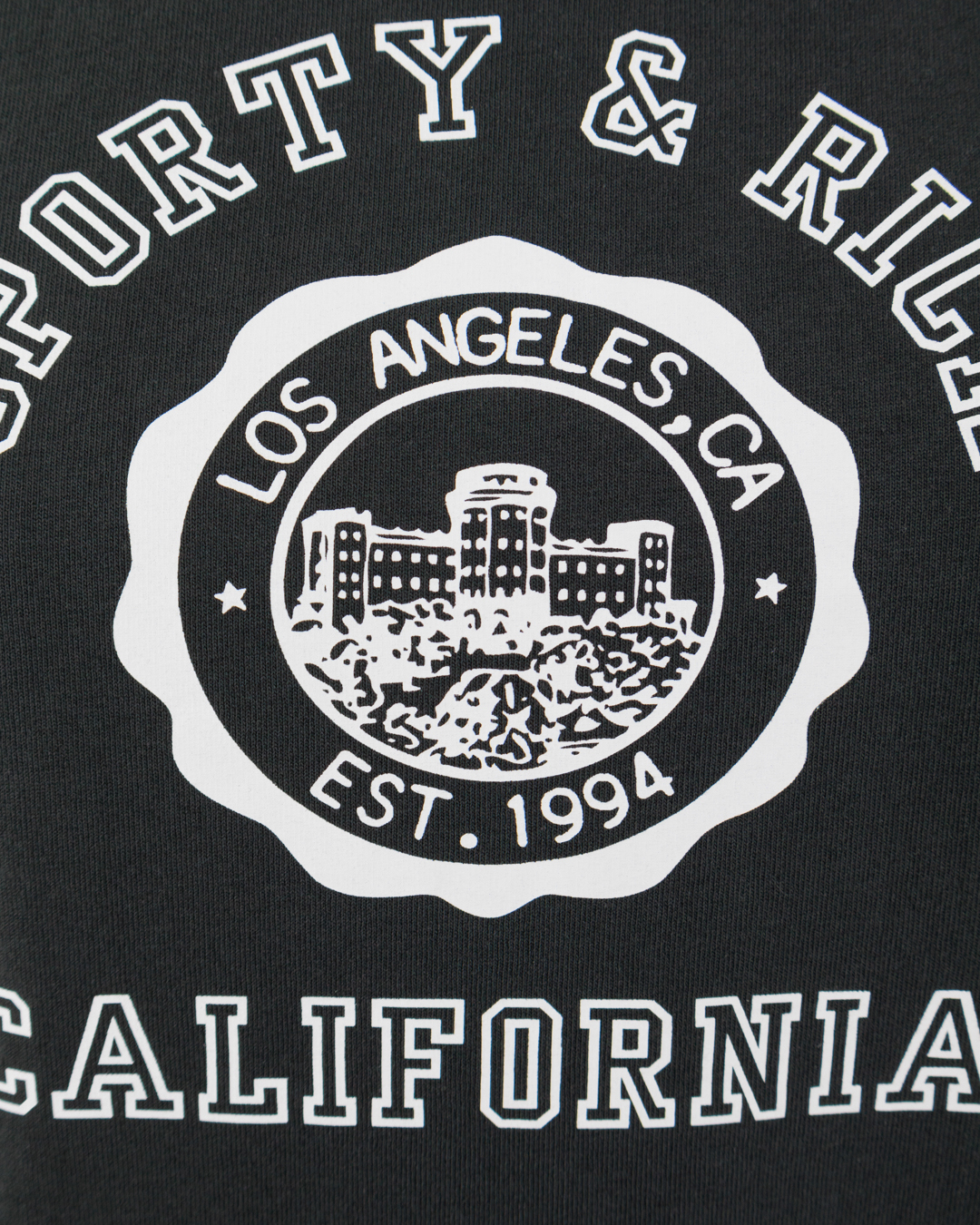 Эта стильная футболка в глубоких черных тонах представляет собой гармоничное сочетание спортивного шика и уличного стиля. Изготовленная из высококачественного хлопка, она обеспечивает отличную дышимость и приятные тактильные ощущения. Крой футболки — слегка оверсайз, что придает ей расслабленный и современный вид. Короткие рукава украшены выразительными полосами в контрастных белых и серых оттенках, которые добавляют динамичности и акцента к общему образу. На груди расположен фирменный принт, выполненный в стиле ретро, с округлыми формами и стилизованными элементами, что подчеркивает атмосферу калифорнийского шика. Вышивка с надписями "Sporty & Rich" и "California" создает эффектный акцент, добавляя индивидуальности и стиля. Отделка включает аккуратные двойные швы, что не только обеспечивает долговечность изделия, но и подчеркивает качественный подход в их изготовлении. Эта футболка прекрасно сочетается как с спортивными штанами, так и с джинсовыми шортами, создавая стильные образы для активного отдыха или повседневных выходов.