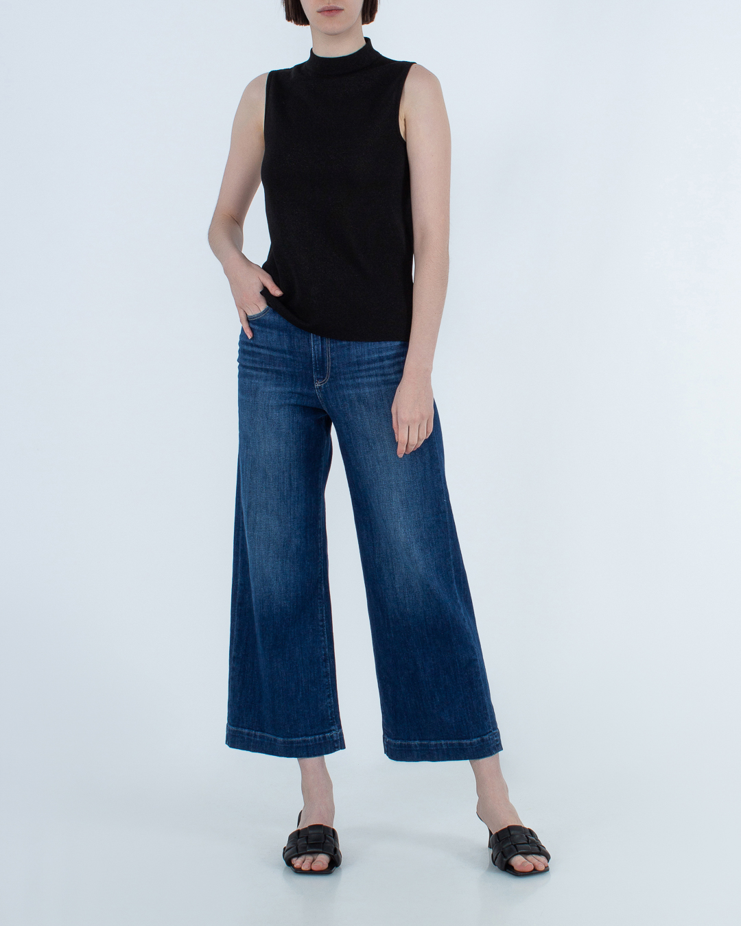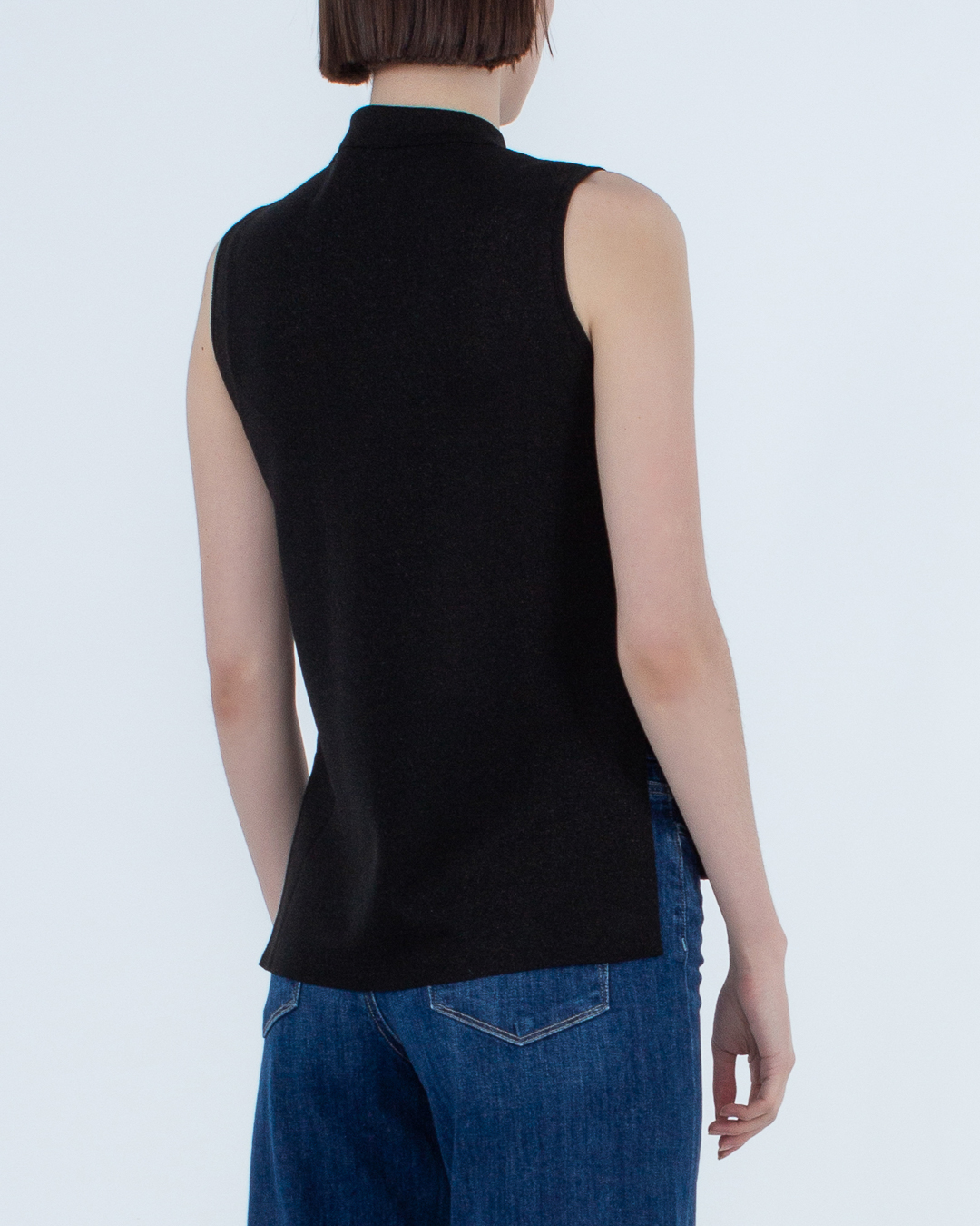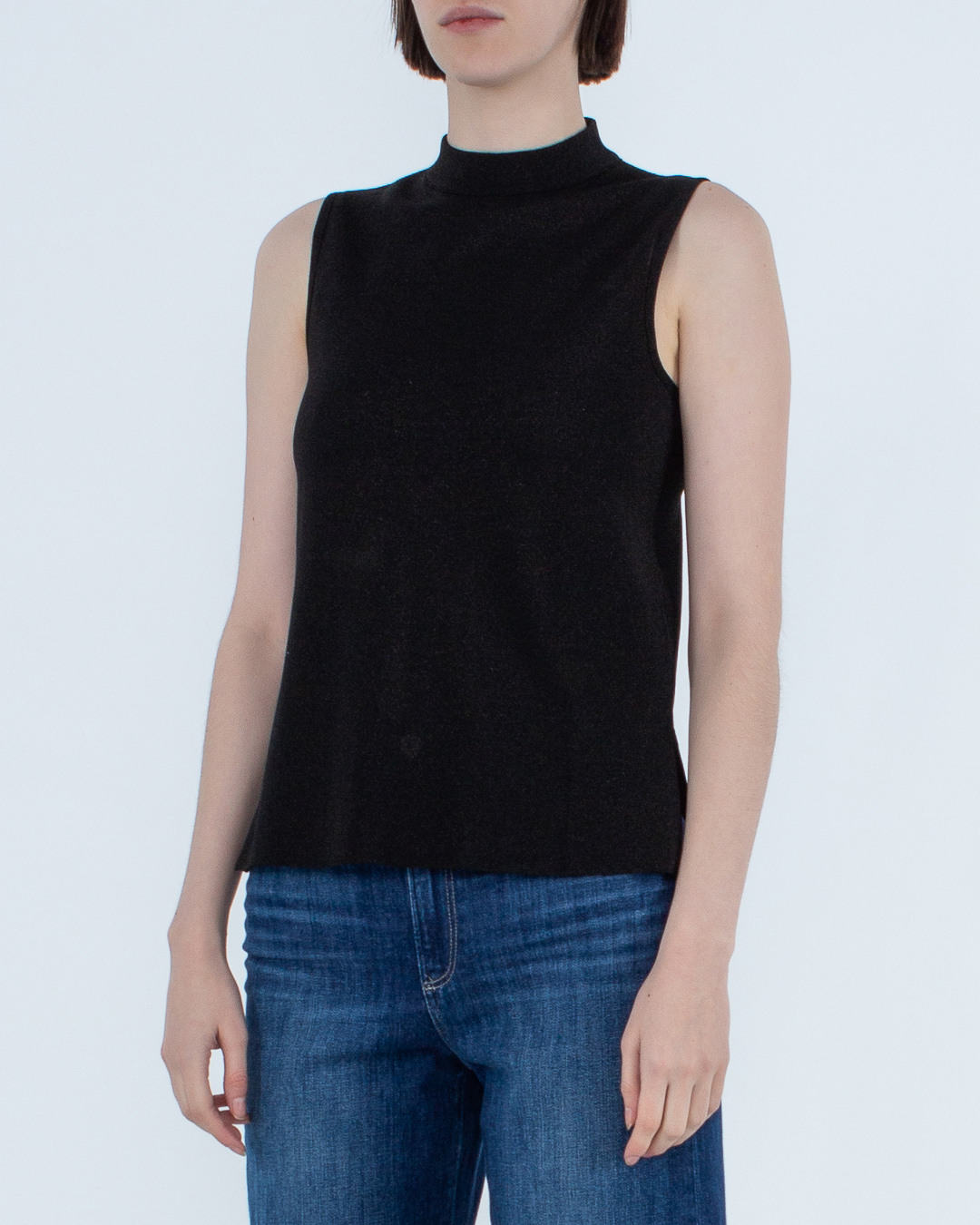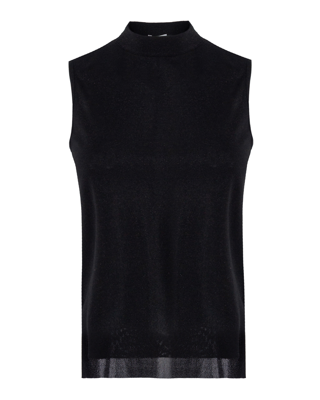 Топ MRZ сшили из трикотажной вискозы черного цвета и добавили блестящую нить. Эластичное изделие прямого силуэта без рукавов дополнили невысоким воротником-стойкой.