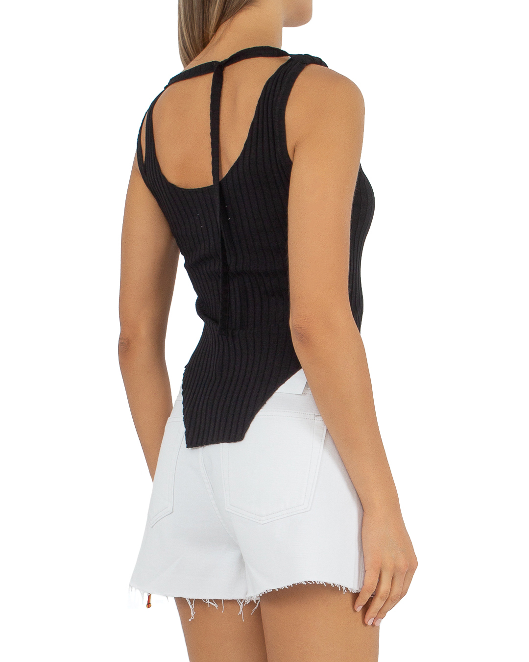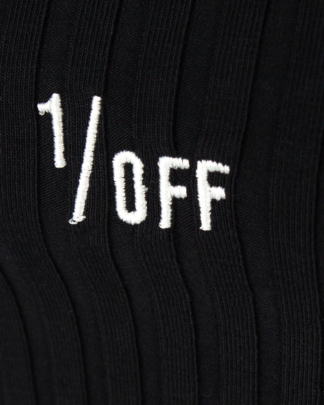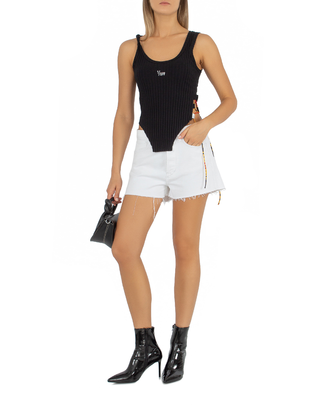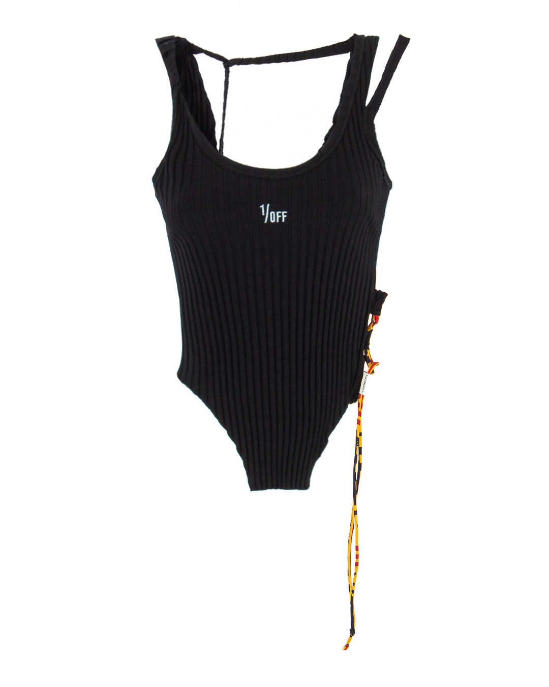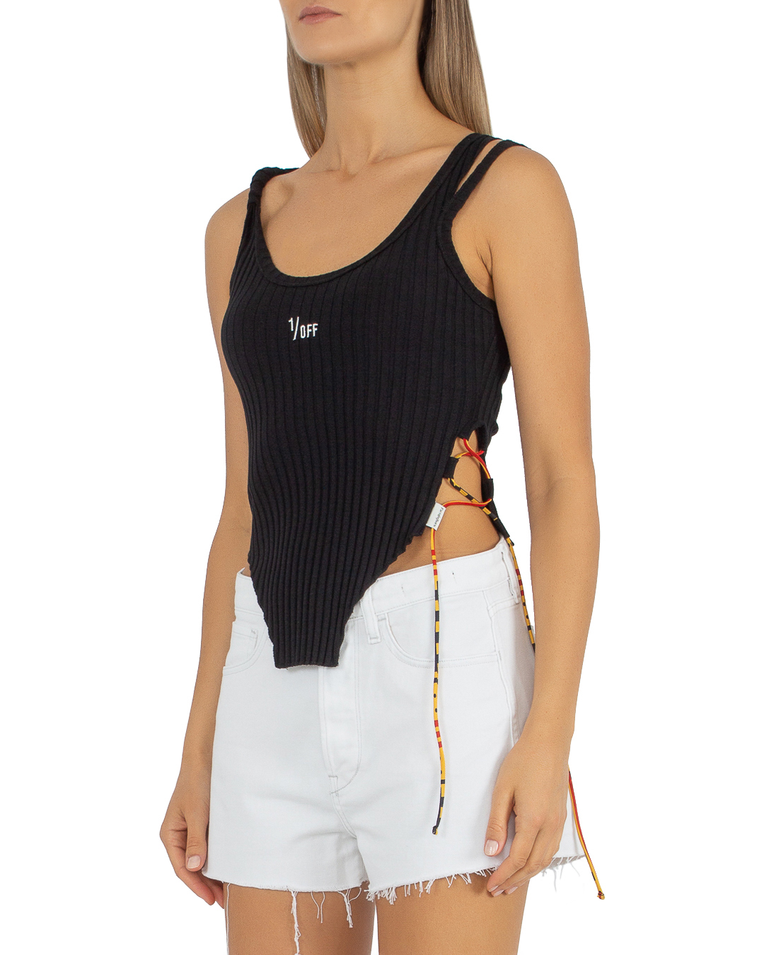 Рестайлинговый топ 1/OFF выполнен из трикотажного хлопка в рубчик с миниатюрной фирменной вышивкой. Изделие облегающего силуэта с цветными завязками сбоку.