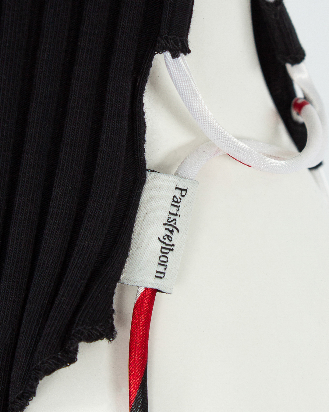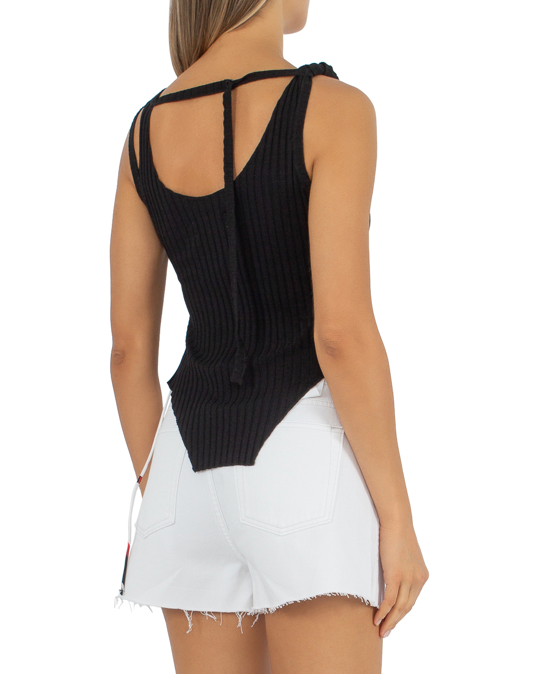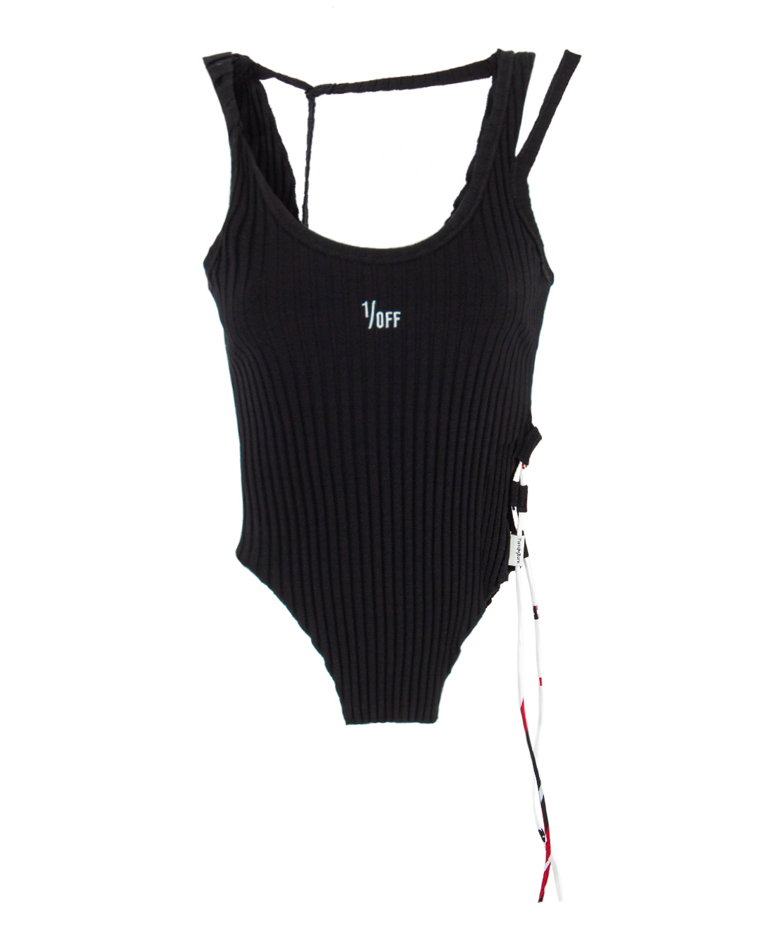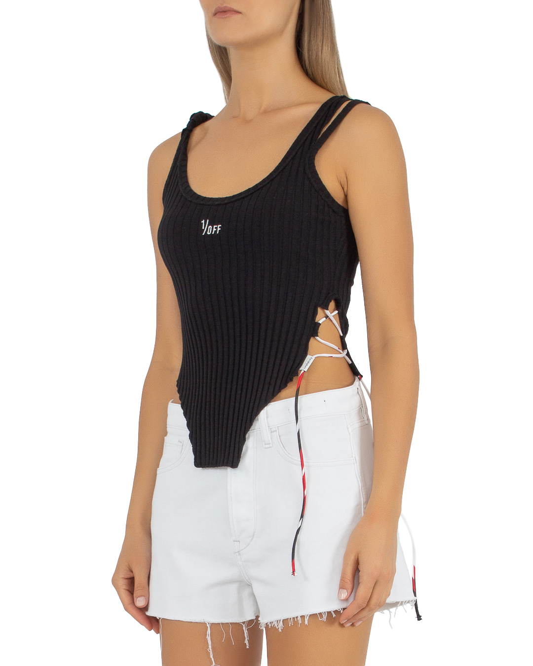 Рестайлинговый топ 1/OFF выполнен из трикотажного хлопка в рубчик с миниатюрной фирменной вышивкой. Изделие облегающего силуэта с цветными завязками сбоку.