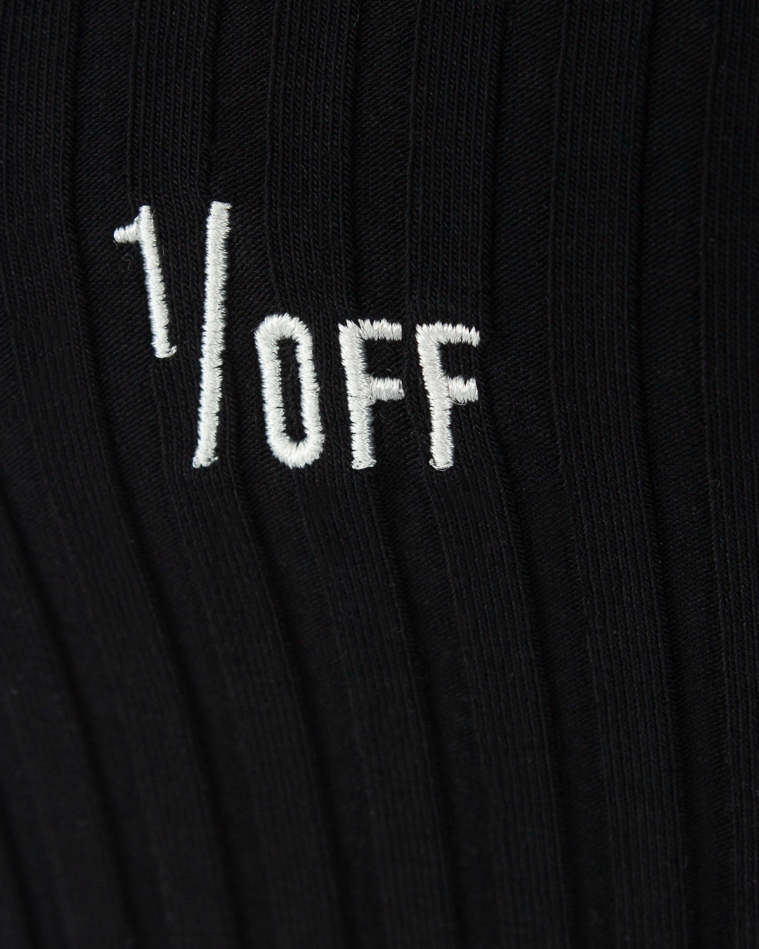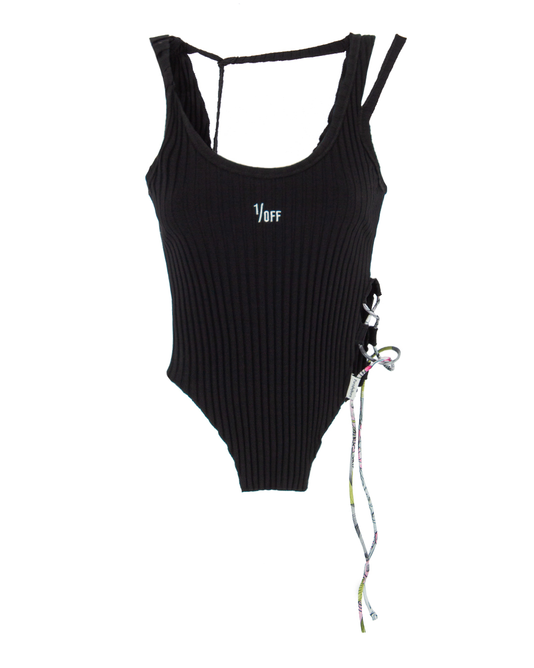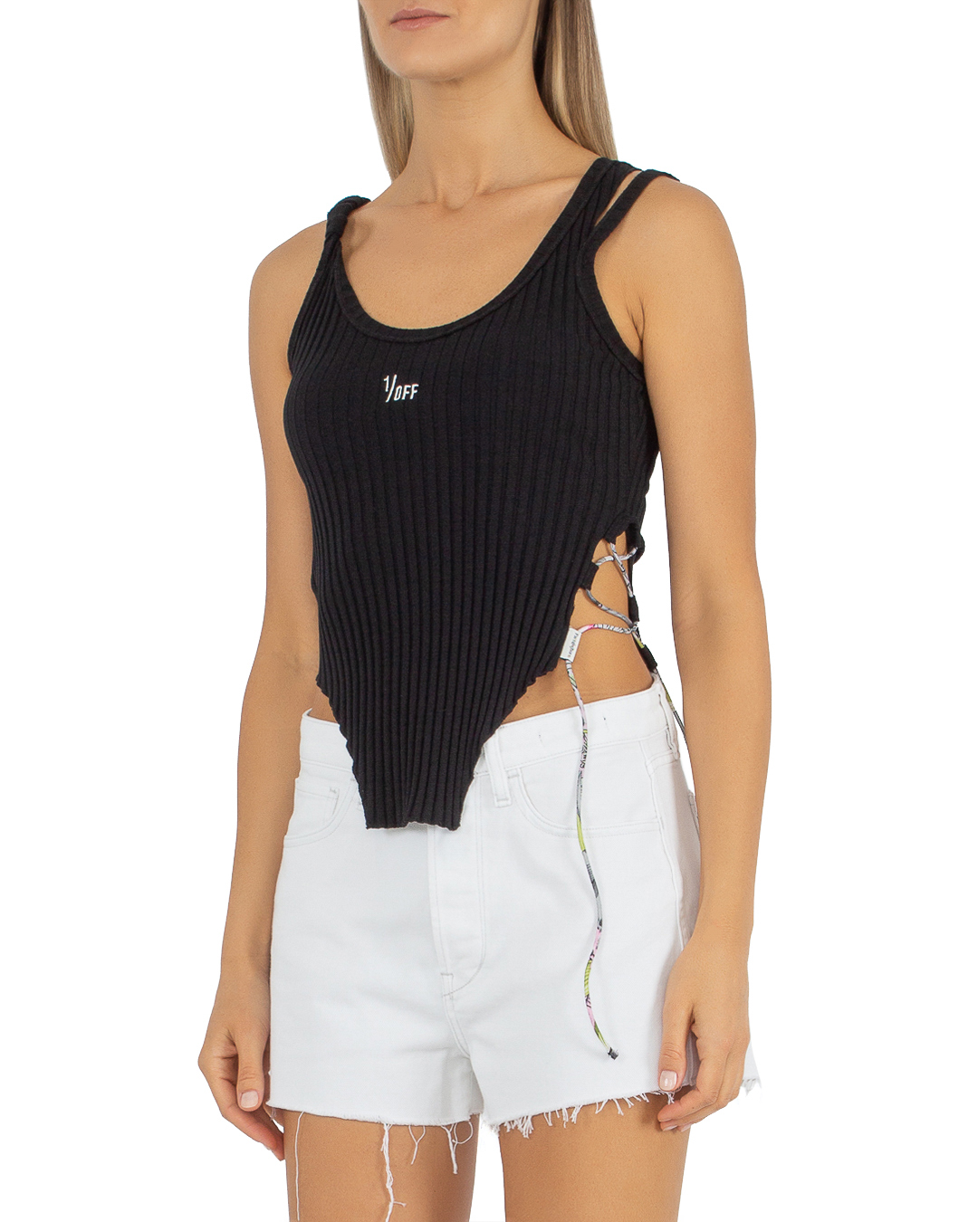Рестайлинговый топ 1/OFF выполнен из трикотажного хлопка в рубчик с миниатюрной фирменной вышивкой. Изделие облегающего силуэта с цветными завязками сбоку.
