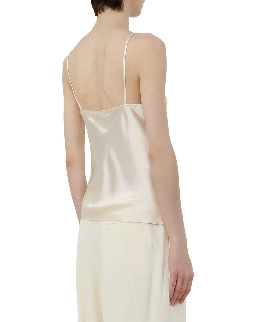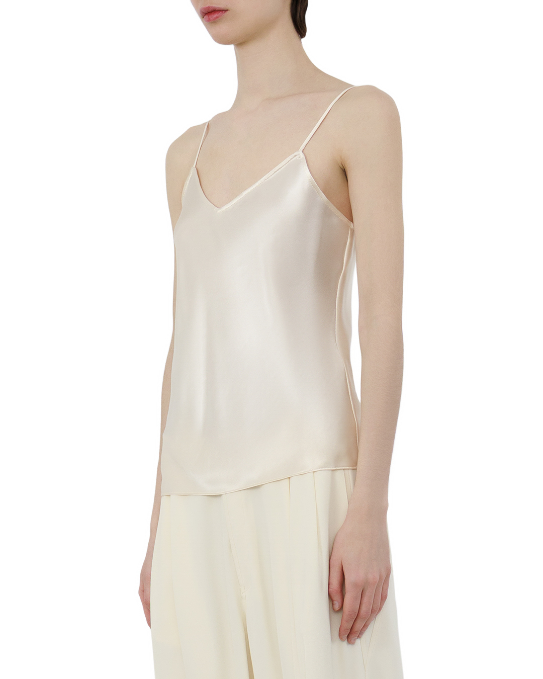 Этот топ — воплощение лаконичной элегантности. Молочный оттенок придаёт вещи утончённость и универсальность, а свободный крой создаёт ощущение невесомости. Тонкие бретели подчёркивают линию плеч, не перегружая образ. Вырез оформлен мягко, с плавными контурами, что добавляет женственности. Ткань струится естественным образом, формируя изящные складки. Отсутствие избыточной отделки подчёркивает чистоту дизайна — акцент сделан на качестве материала и точности кроя. Такой топ легко станет основой для стильных комбинаций, превращая любой образ в изысканный и гармоничный.