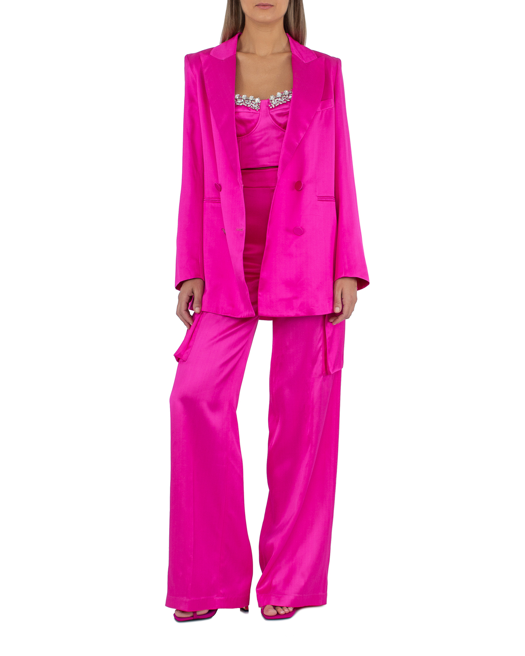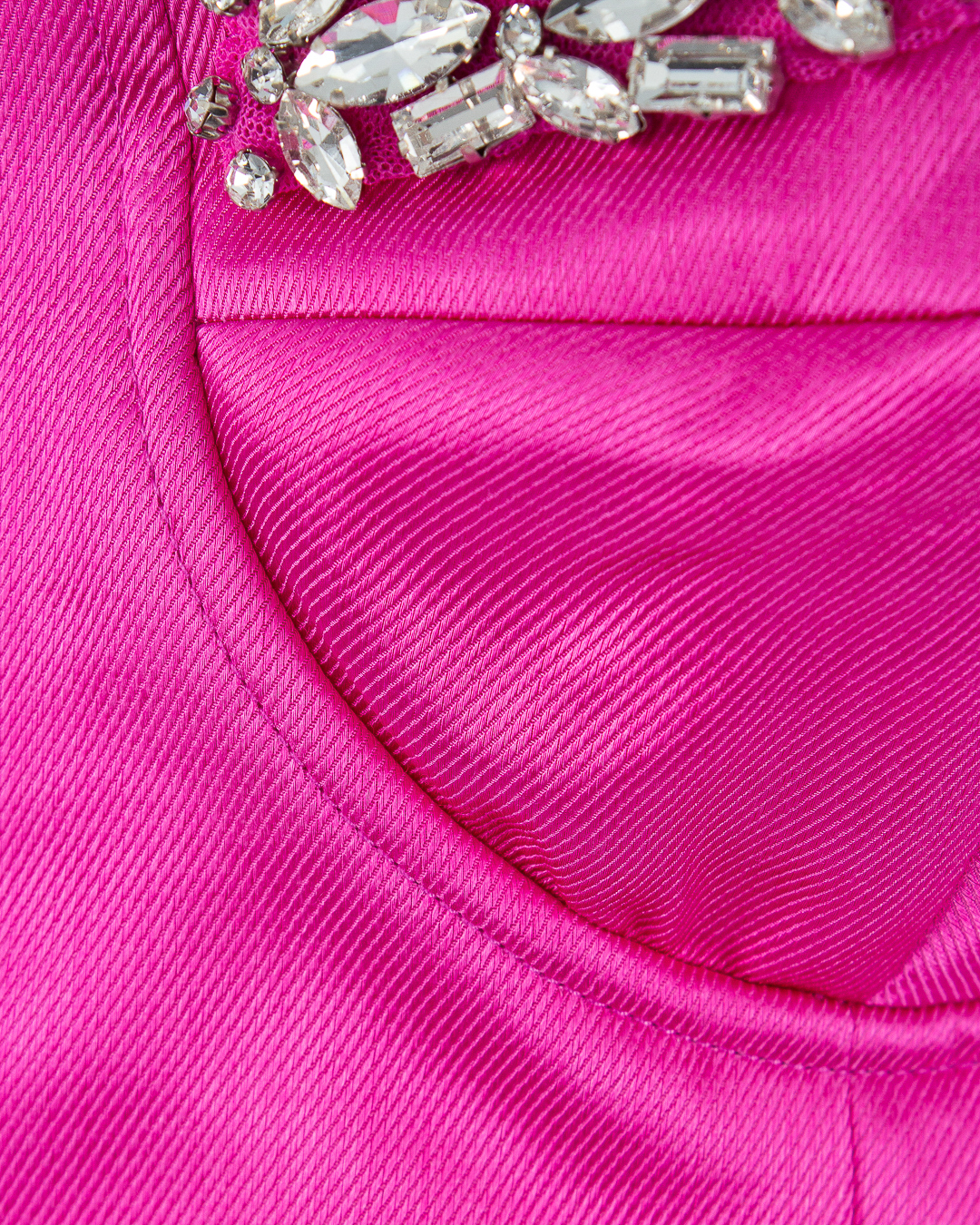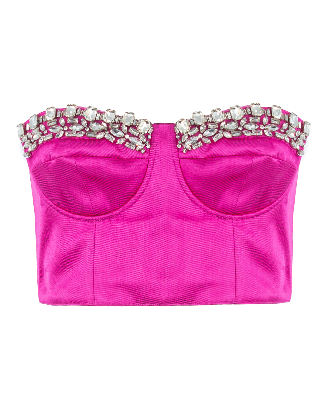 Кроп-топ Amen корсетного вида сшит из вискозы розового насыщенного оттенка. Модель облегающего силуэта с застежкой на молнию на спине. Лиф дополнен отделкой блестящими кристаллами.