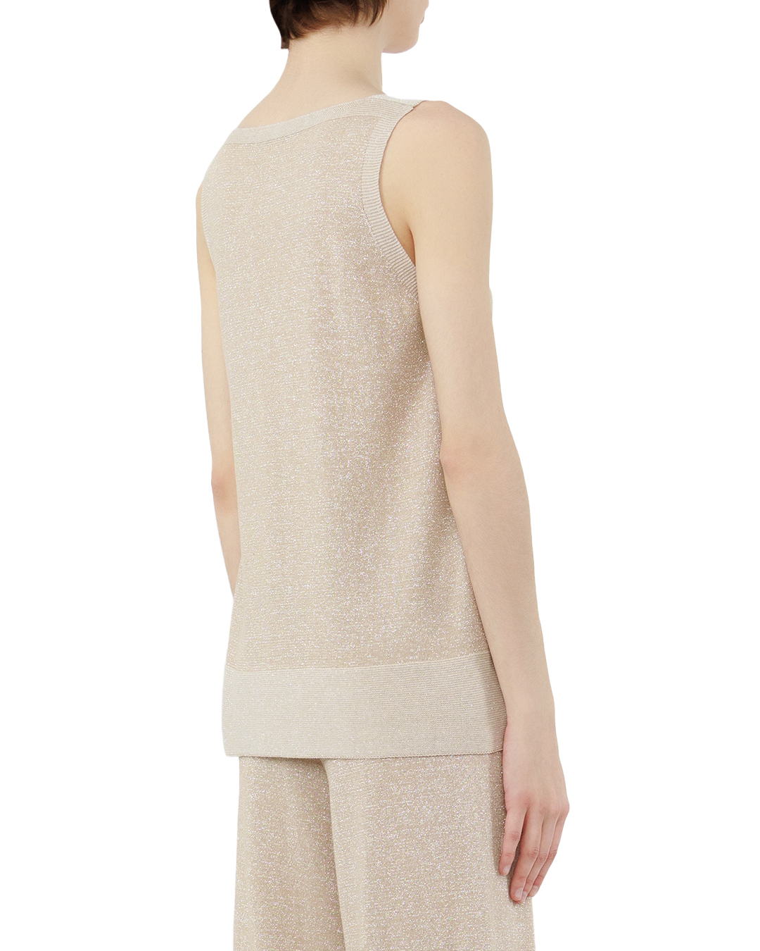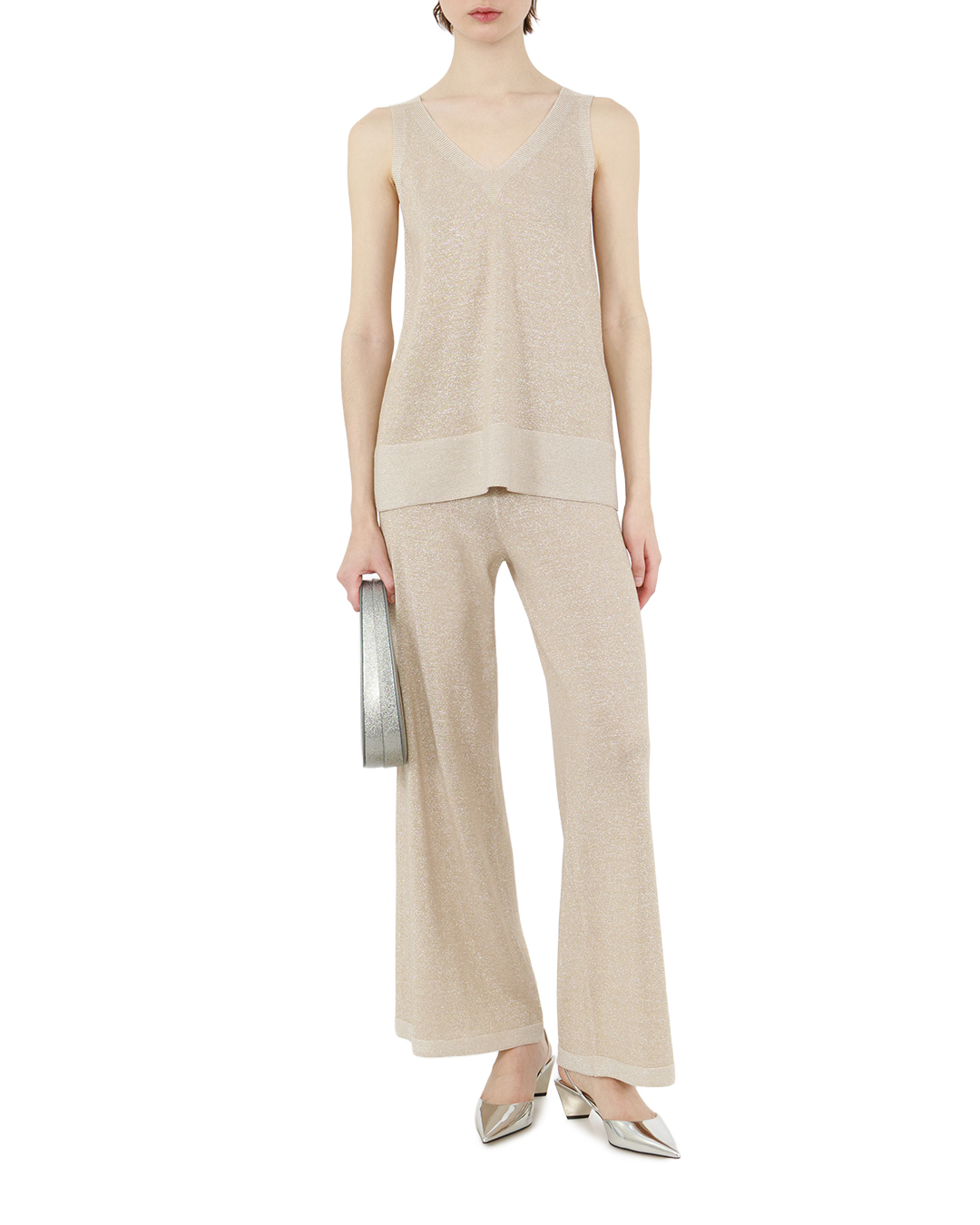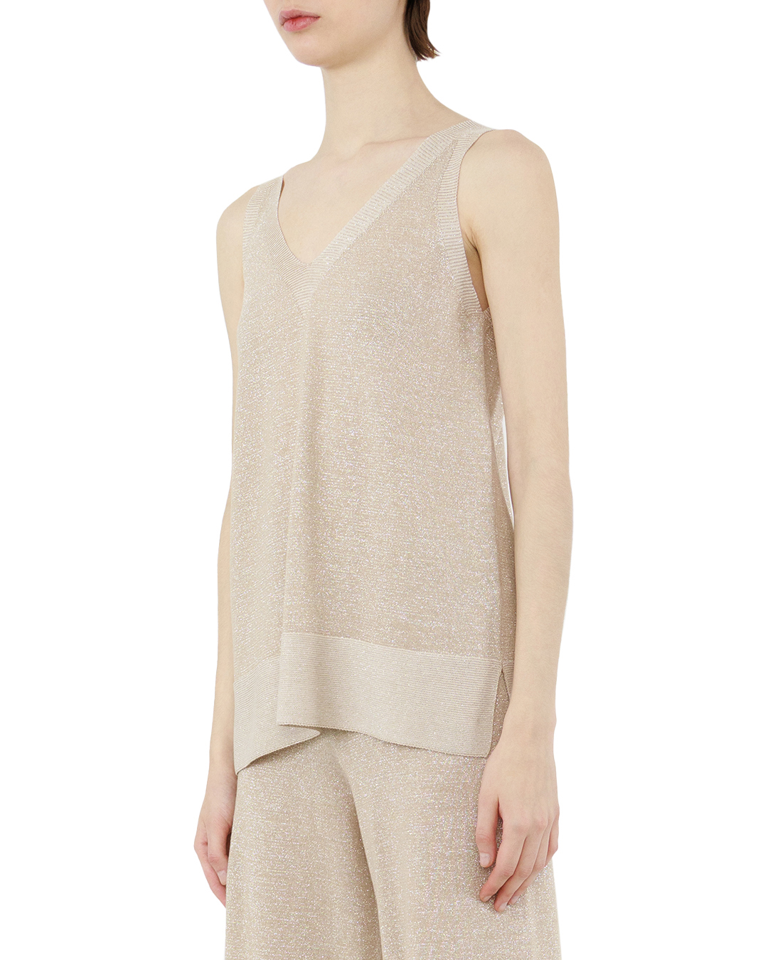Этот топ — истинное воплощение утончённой простоты и элегантности. Нежный бежевый оттенок с лёгким мерцанием создаёт ощущение невесомости, превращая базовую вещь в изысканный акцент любого образа. Ткань словно играет со светом, придавая облику деликатное сияние. Модель пленяет своей лаконичностью: свободный крой гармонично сочетается с изящным V-образным вырезом, который мягко подчёркивает линию шеи и ключиц. Безрукавный фасон делает топ идеальным выбором для тёплых дней — он дарит ощущение лёгкости и свободы, оставаясь при этом невероятно стильным. Плавные линии силуэта создают безупречную посадку: топ мягко облегает фигуру, не сковывая движений. Особая фактура материала с люрексом добавляет глубины и характера, превращая повседневный элемент гардероба в произведение текстильного искусства. Этот топ универсален: он одинаково органично впишется как в расслабленный летний образ с льняными брюками, так и в романтичный ансамбль с юбкой-миди. Можно использовать его как основу для многослойных луков — поверх топа прекрасно ляжет лёгкий кардиган или жакет. Благородный оттенок и изысканный блеск позволят создать десятки неповторимых комбинаций, делая каждую встречу особенной.
