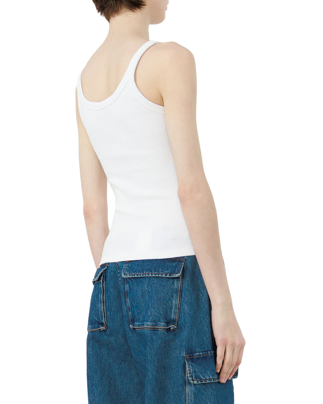 Этот белый топ — воплощение минималистичной элегантности, где каждая деталь работает на создание чистого, утончённого образа. Классический крой подчёркивает линии фигуры, не перегружая силуэт, а лаконичность дизайна делает вещь универсальной: она легко впишется как в спортивный, так и в повседневный гардероб. Широкие бретели обеспечивают надёжную фиксацию на плечах, не сдавливая и не сковывая движений. Их плавные линии гармонично сочетаются с округлым вырезом горловины, который деликатно подчёркивает линию шеи, добавляя образу лёгкости. Рельефная фактура полотна придаёт топу изысканность, создавая игру света и тени на поверхности. Эта деталь превращает простую вещь в стильный акцент, который можно комбинировать с разными элементами гардероба — от джинсов до юбок. Обработка краёв выполнена с особой тщательностью: швы ровные, практически незаметные, что говорит о высоком уровне пошива. Нижний край топа аккуратно подвёрнут, что придаёт изделию законченность и предотвращает износ. Небольшая фирменная этикетка на горловине — сдержанный штрих, который подчёркивает принадлежность к бренду, не перегружая дизайн. Этот топ станет базовой вещью в гардеробе, способной преобразить любой образ, добавив ему свежести и утончённости. Комфорт здесь идёт рука об руку с эстетикой, а простота — с выразительностью.