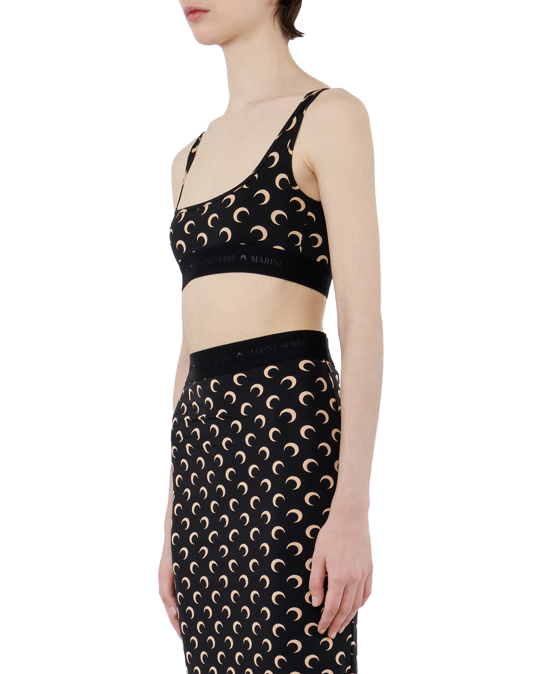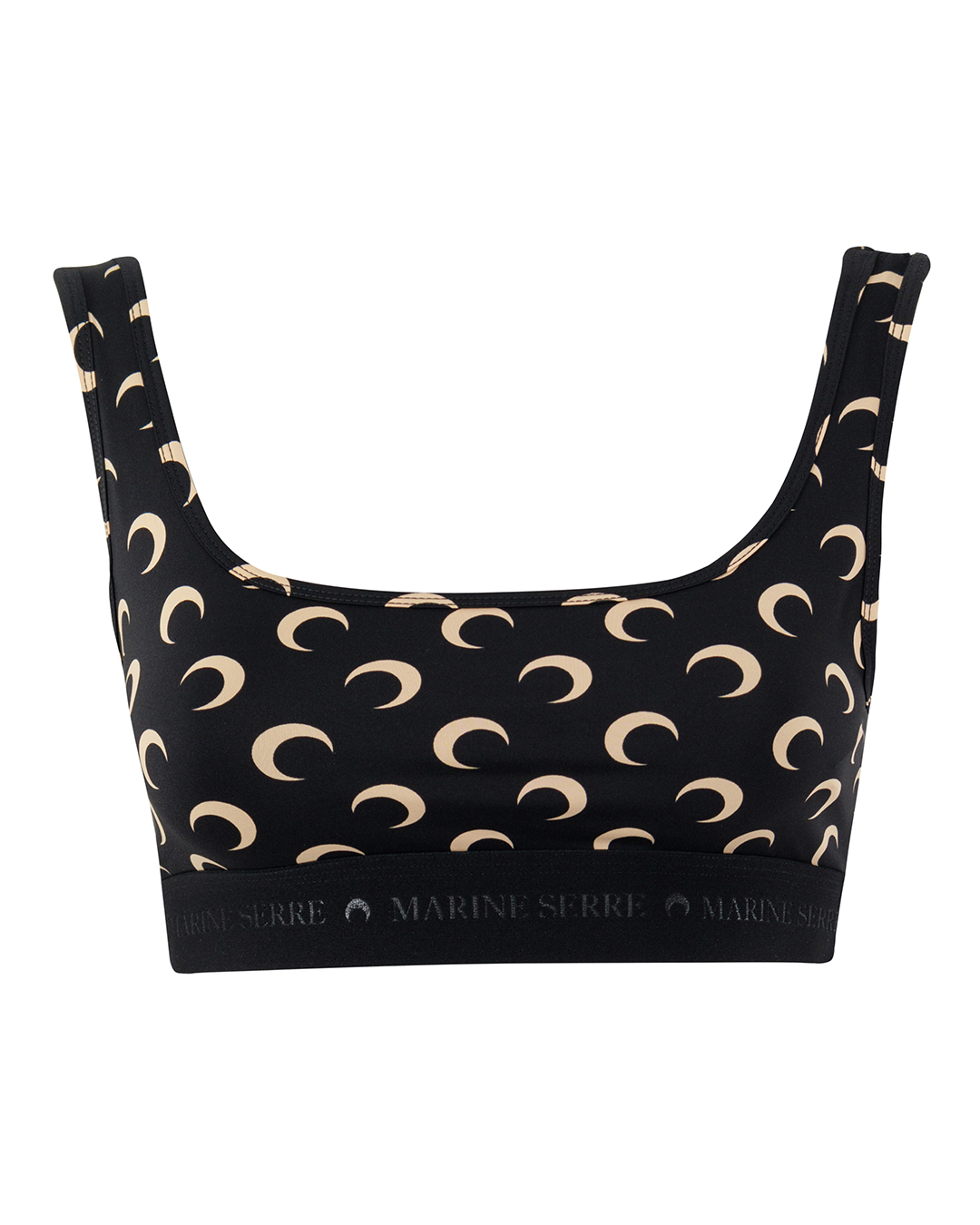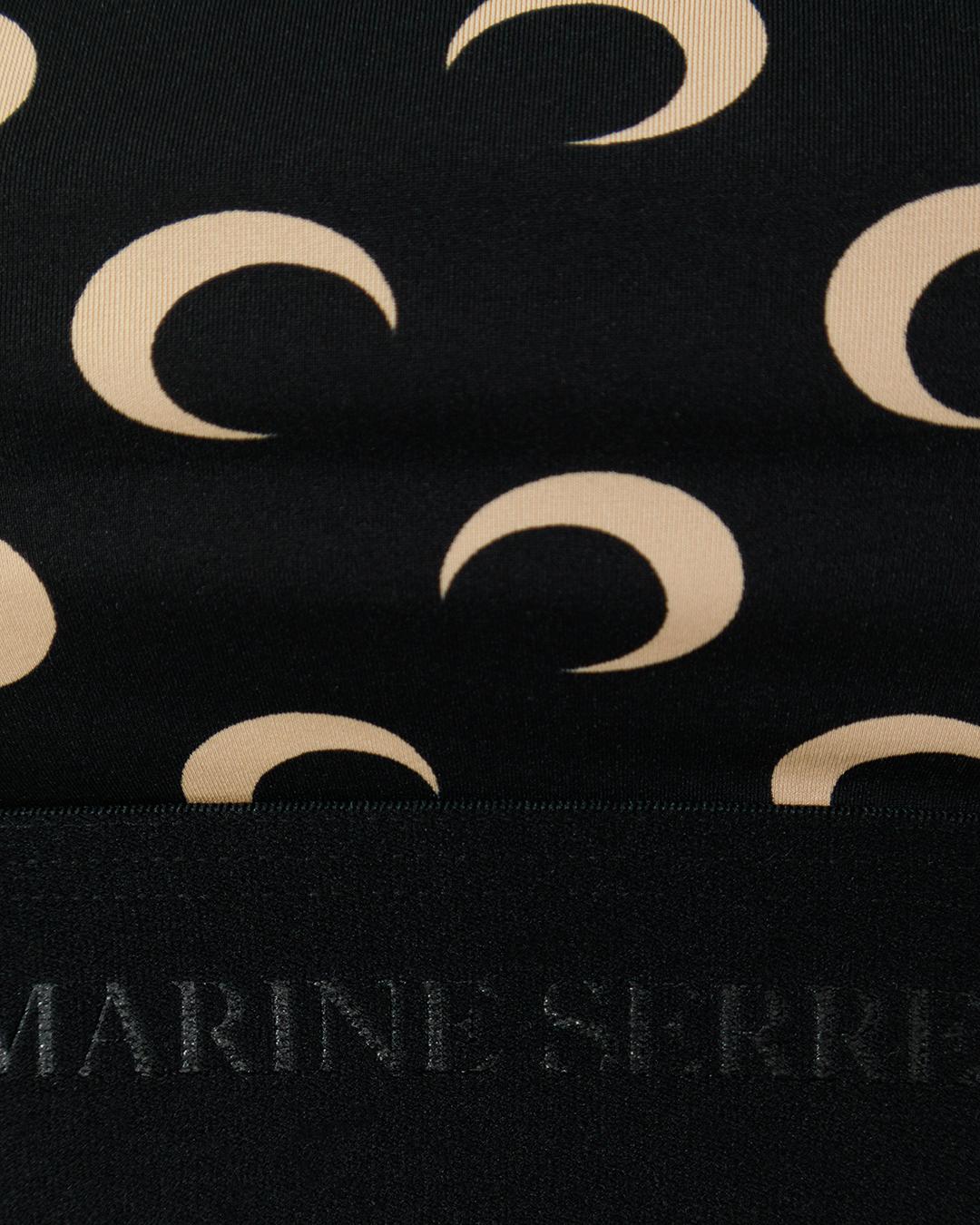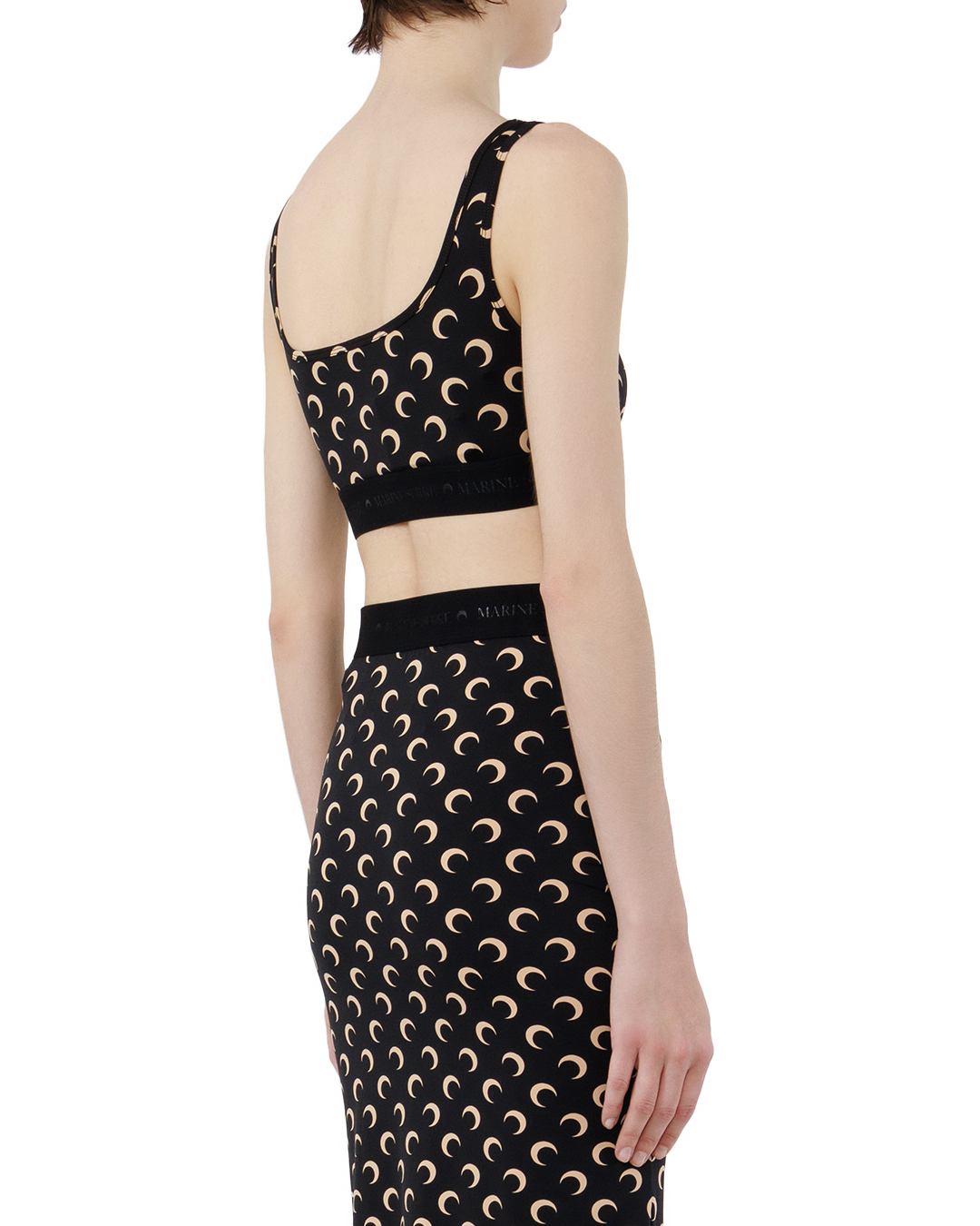 Этот топ — идеальный пример сочетания авангардного стиля и комфорта. Изготовленный из эластичного и мягкого материала, он обеспечивает идеальную посадку и легкость движений. На черном фоне расположился изысканный принт с полумесяцами, создающий эффект динамики и придающий изделию художественный акцент. Этот узор не только добавляет визуального интереса, но и подчеркивает современный стиль. Широкие бретели и глубокий вырез декольте создают гармоничный и сбалансированный силуэт, акцентируя внимание на линии плеч и ключиц. Эластичная лента с фирменной надписью внизу добавляет элемент спортивной элегантности и обеспечивает комфортную поддержку. Этот топ идеально подходит для создания как кэжуал, так и более экстравагантных образов, сочетая в себе функциональность и модный шик.