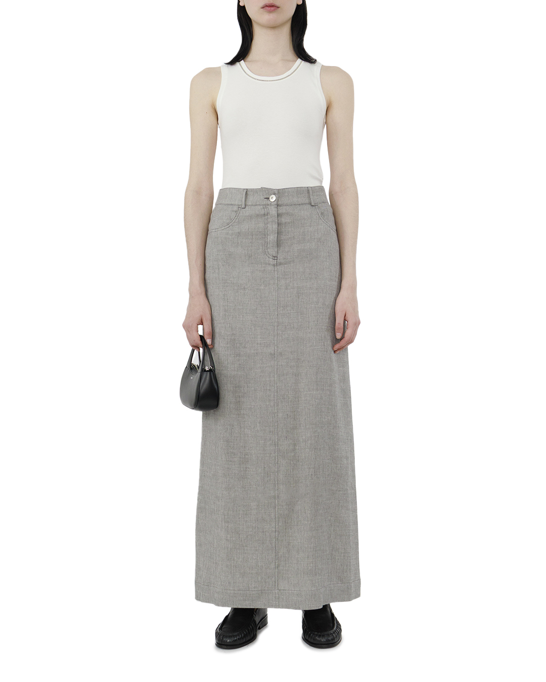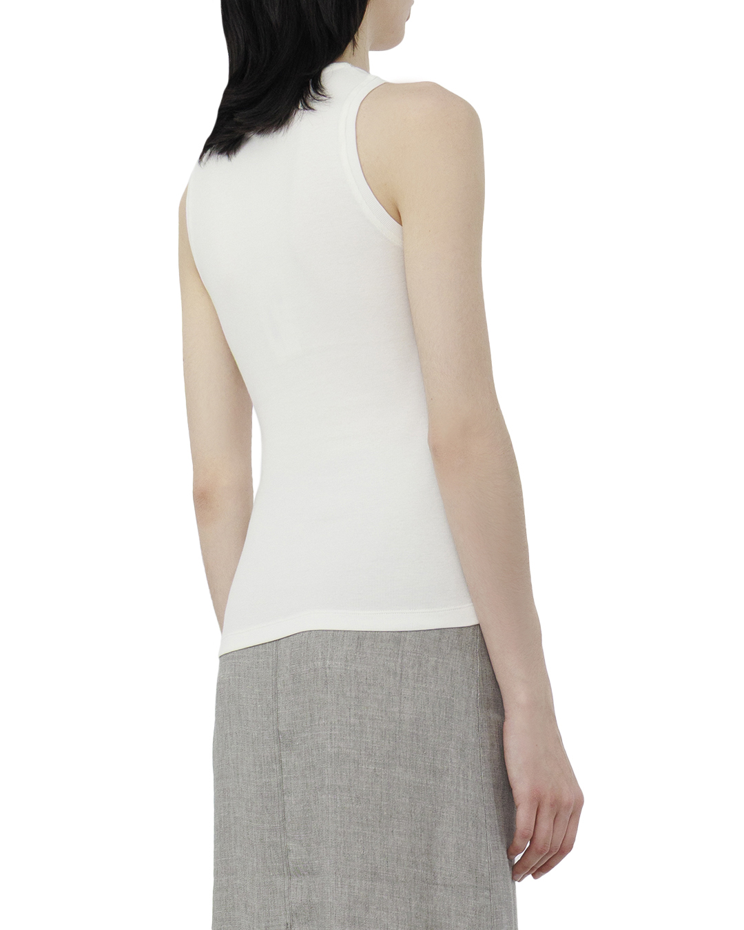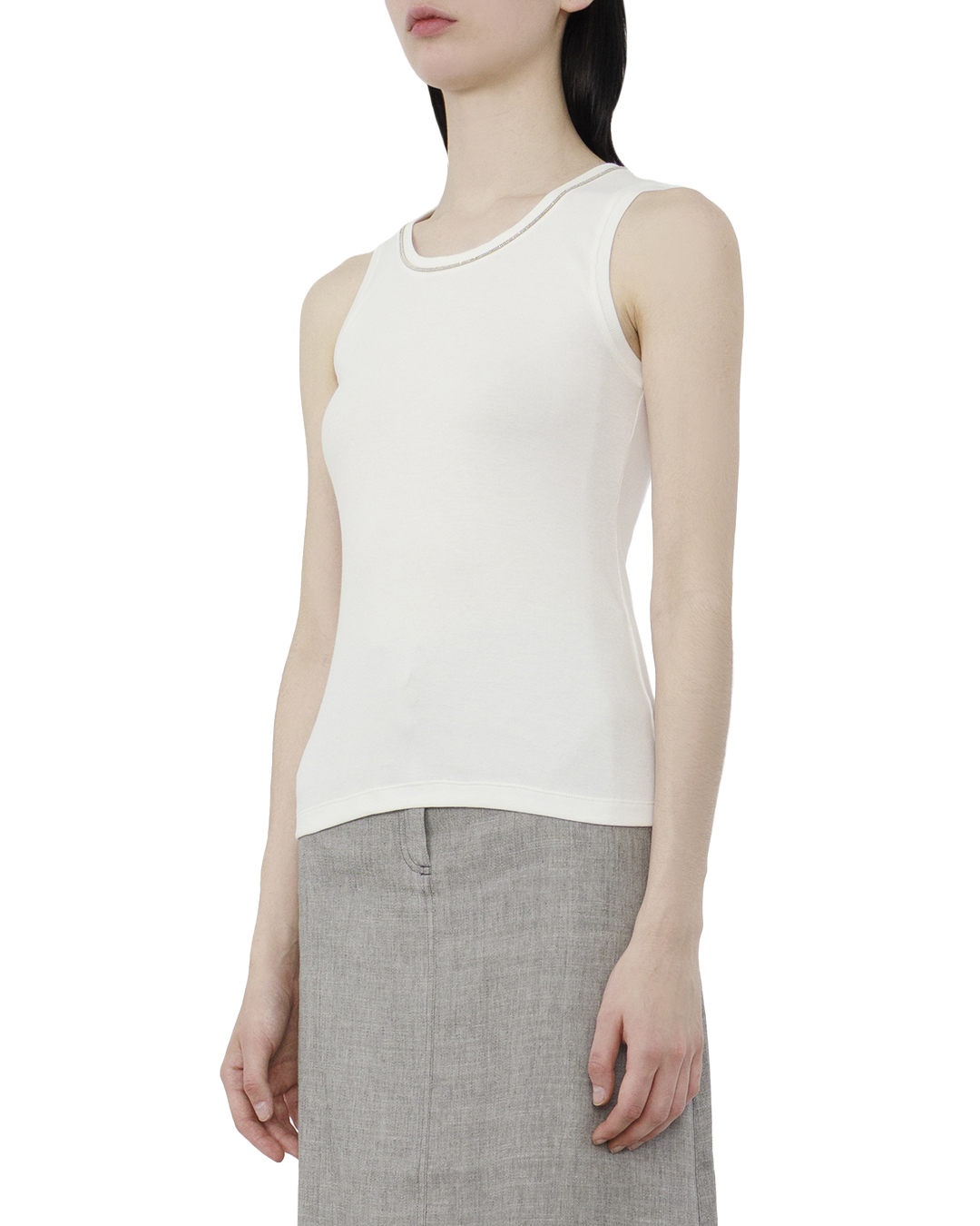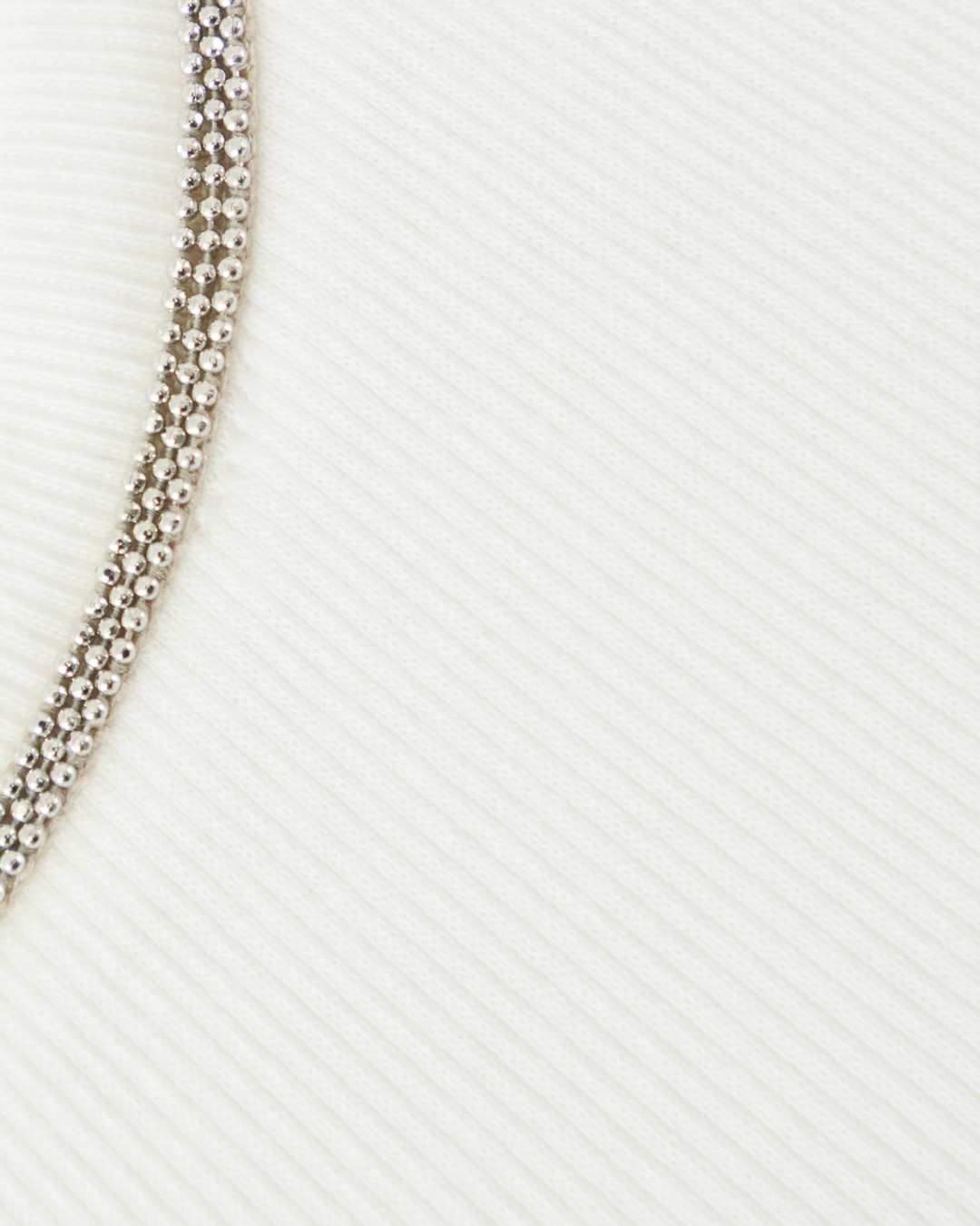 Этот топ — настоящая ода минималистичному совершенству, сочетающий в себе элегантность и утонченность. Изготовленный из мягкого, облегающего трикотажа белоснежного цвета, он элегантно подчеркивает силуэт, создавая ощущение чистоты и свежести. Круглый вырез горловины украшен изящной цепочкой, добавляющей нотку роскоши и служащей стильным акцентом. Этот элемент декора подчеркивает шею и декольте, создавая возможность для интересных стилистических решений с аксессуарами. Бесшовные края пройм и подола обеспечивают чистые линии и гладкий финиш, подчеркивая общий минималистичный характер дизайна. Плотная посадка и точный крой делают этот топ универсальной основой для множества сетов, будь то под пиджак или в комплекте с кардиганом. Этот топ идеально комбинируется с различными стилями, от делового до повседневного, становясь центральным элементом гардероба, который легко адаптировать под любое настроение и повод.