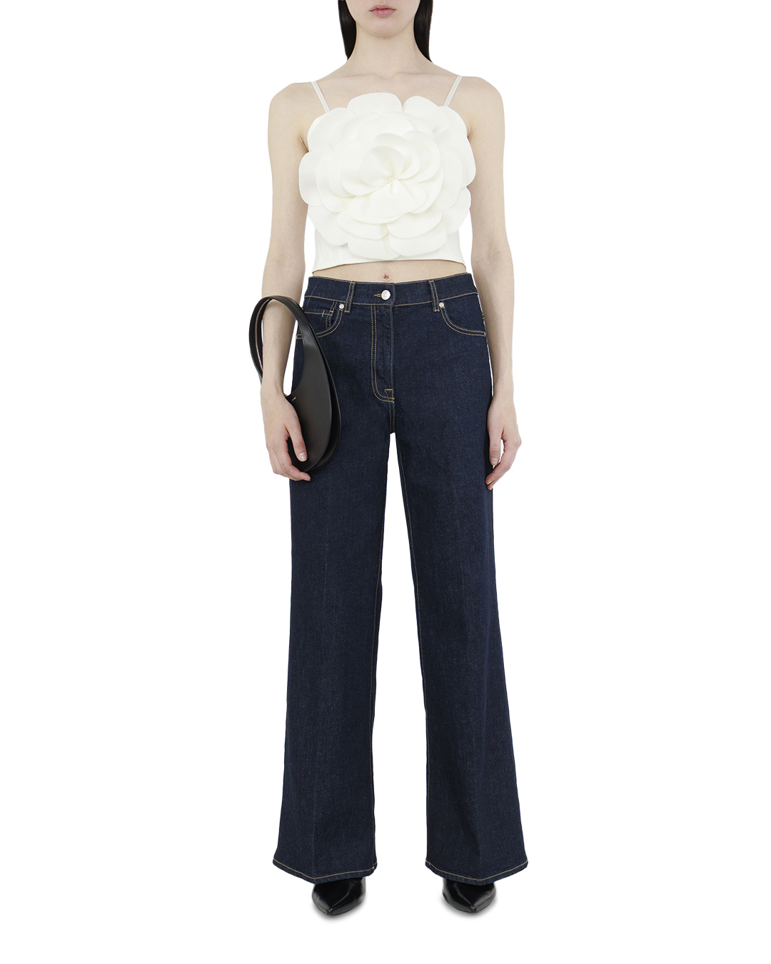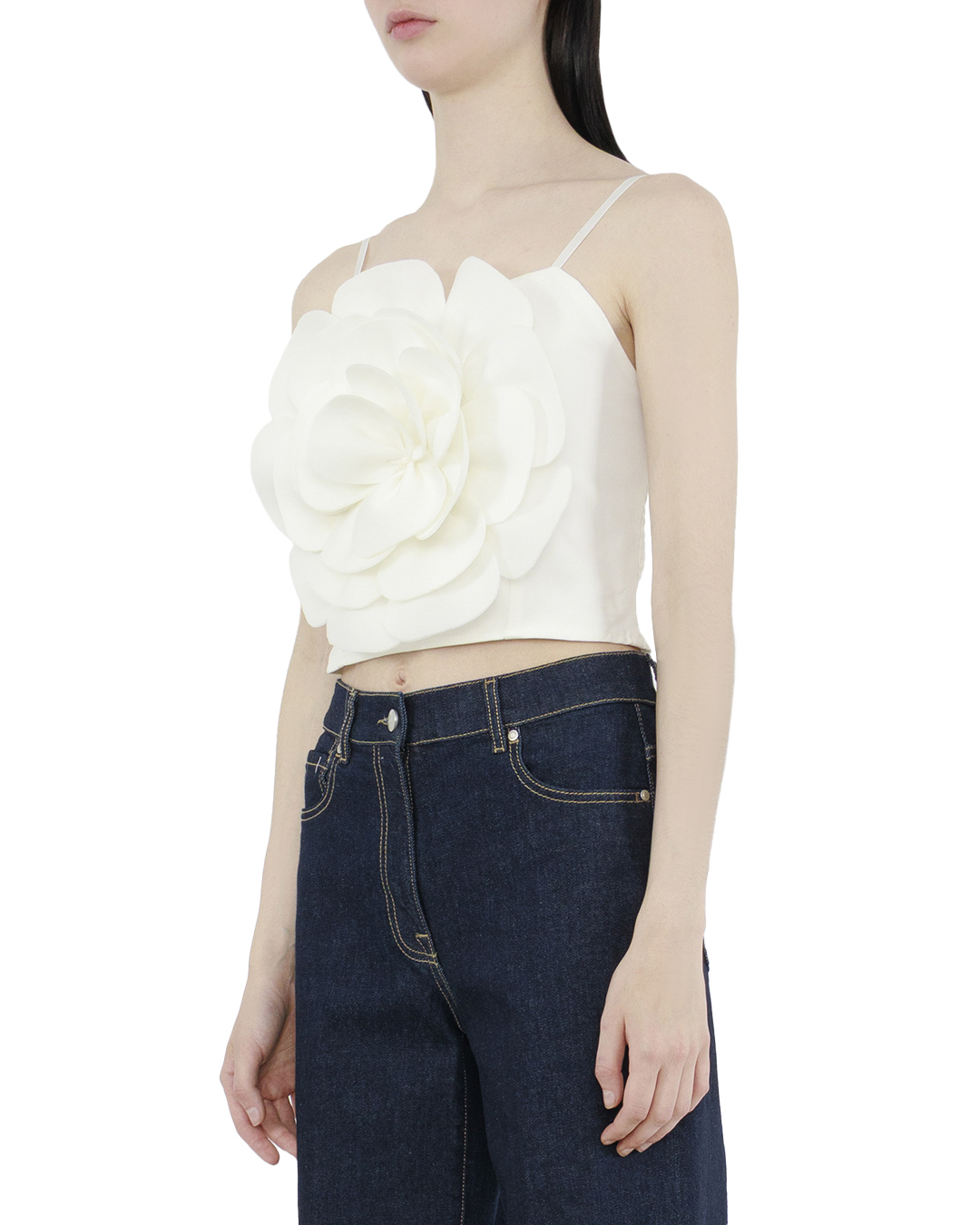 Этот топ представляет собой истинное произведение дизайнерского искусства, добавляющее в образ утонченную роскошь и элегантность. Основное внимание привлекает уникальная отделка в виде объемного цветка, который создает эффект трехмерности и придаёт модели скульптурный вид. Тонкие бретели добавляют изящество и аккуратность, обеспечивая легкую посадку и элегантный акцент на плечах. Насыщенный белый оттенок подчеркивает чистоту и свежесть, делая топ универсальным компаньоном для создания самых разнообразных образов. Благодаря гладкой фактуре ткани, этот топ визуально придает образу лёгкость и изысканность. Объемный цветочный элемент изготовлен из тщательно обработанных лепестков, которые создают иллюзию живого цветка и акцентируют внимание на груди. Этот топ можно сочетать с юбками, брюками или джинсами, создавая как повседневные, так и вечерние образы. Он идеально подходит для тех, кто хочет подчеркнуть свою индивидуальность и вкус, оставаясь в центре внимания.