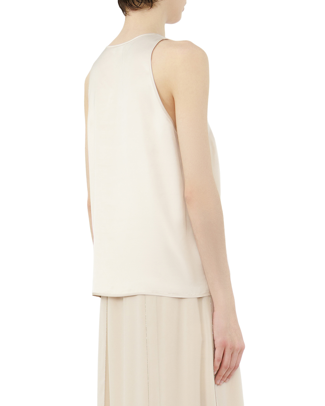 Этот лаконичный топ без рукавов — воплощение сдержанной элегантности. Свободный, слегка удлинённый силуэт мягко облегает фигуру, создавая ощущение лёгкости и непринуждённости. Округлый вырез горловины оформлен тонкой аккуратной окантовкой, которая придаёт модели изысканность, не перегружая дизайн. Отсутствие рукавов подчёркивает изящество плеч, а плавные линии кроя делают топ универсальным элементом гардероба. Естественный рельеф по бокам мягко подчёркивает талию, сохраняя при этом свободу движений. Лёгкий асимметричный низ добавляет модели современный характер, сохраняя элегантность. Светлый нейтральный оттенок делает этот топ идеальной базой для многослойных образов — он легко сочетается как с классическими брюками, так и с воздушными юбками. Чистота линий и минимализм отделки позволяют использовать его в самых разных стилистических решениях: от делового до расслабленного кэжуал. Этот топ не просто одежда — он создаёт настроение, подчёркивает индивидуальность и добавляет облику утончённую простоту.