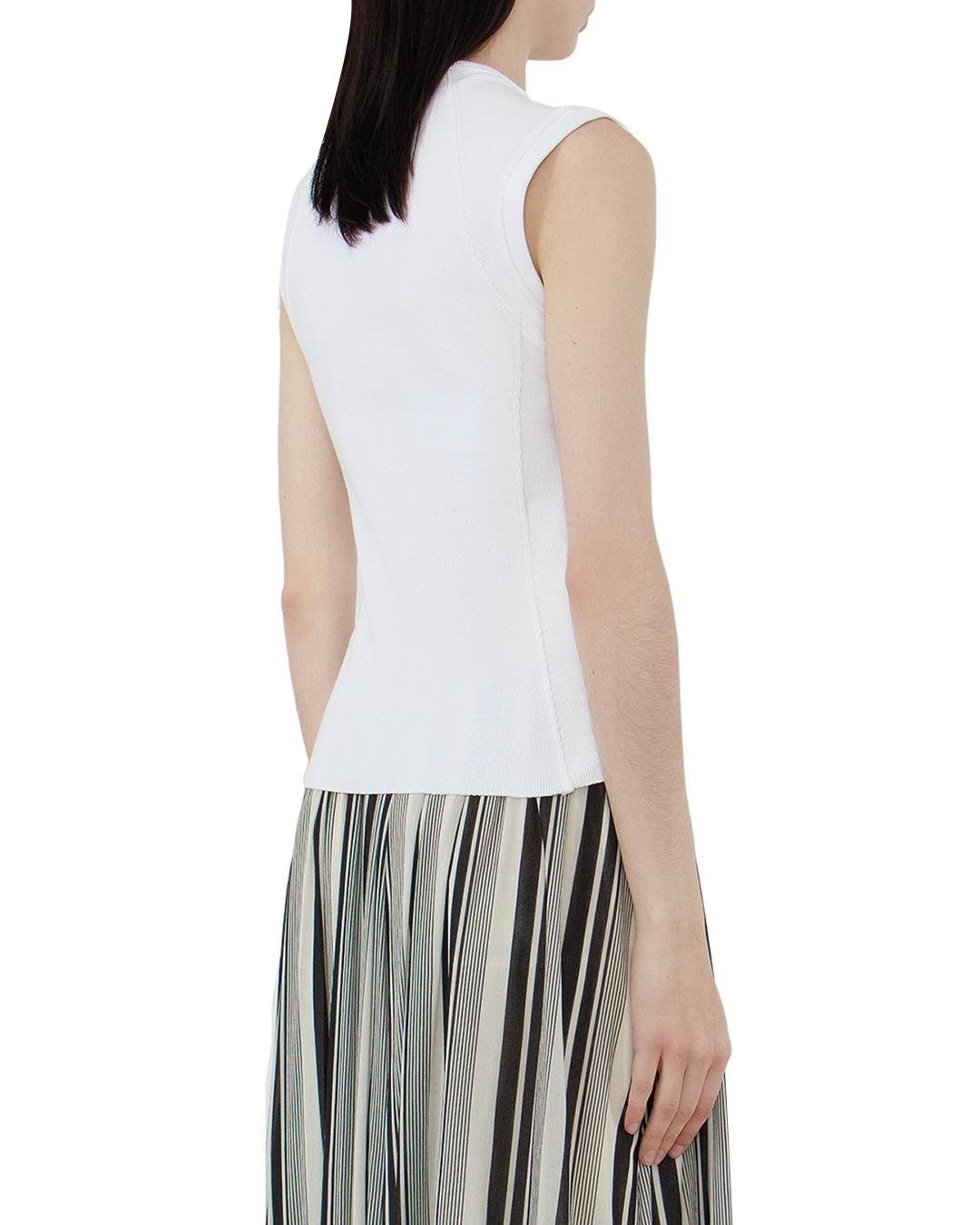 Этот топ представляет собой гармонию минимализма и утончённой конструкции, идеально подходящей для современного гардероба. Выполненный из мягкого, облегающего трикотажа ослепительно белого цвета, он станет универсальной основой стильного аутфита. Круглый вырез горловины и безрукавной силуэт подчёркивают изящество плеч, создавая чистую и чёткую линию. Топ плотно облегает фигуру, акцентируя внимание на естественных контурах тела. Задняя часть изделия открывает неожиданный дизайнерский элемент — изящные завязки. Они придают образу нотку игривости и обеспечивают индивидуальную посадку, добавляя динамичности и элегантности. Акцентная деталь — брендовая нашивка в нижней части топа, которая добавляет утончённый штрих и завершает образ с современным характером. Этот топ легко сочетается с любыми элементами гардероба, будь то строгие брюки или воздушная юбка, становясь ключевым элементом для создания стильных и запоминающихся образов.
