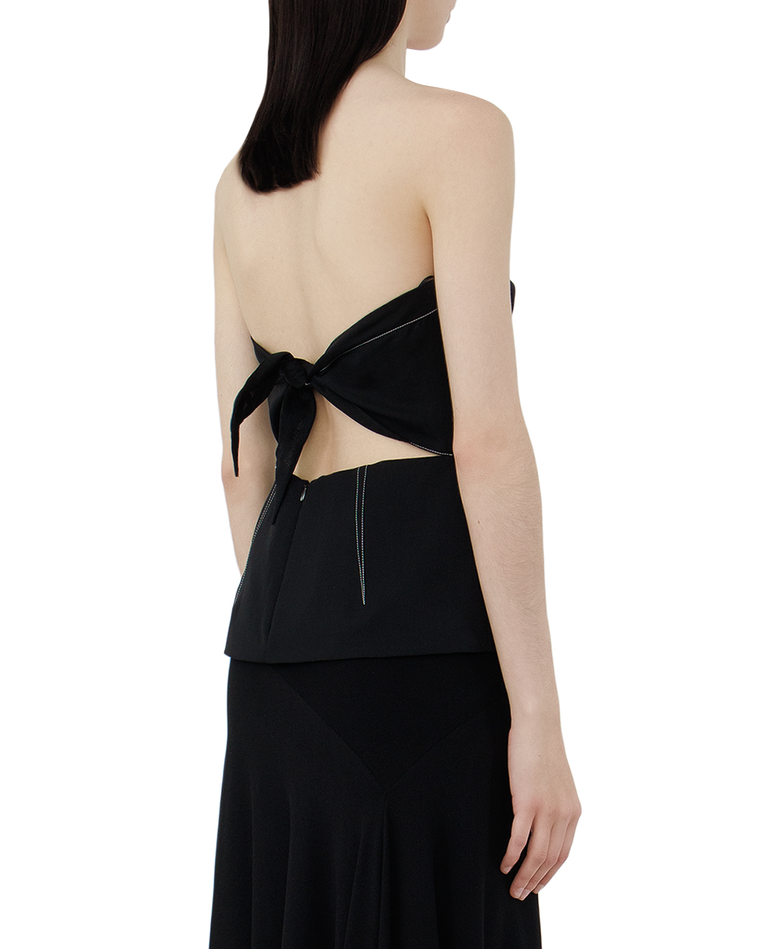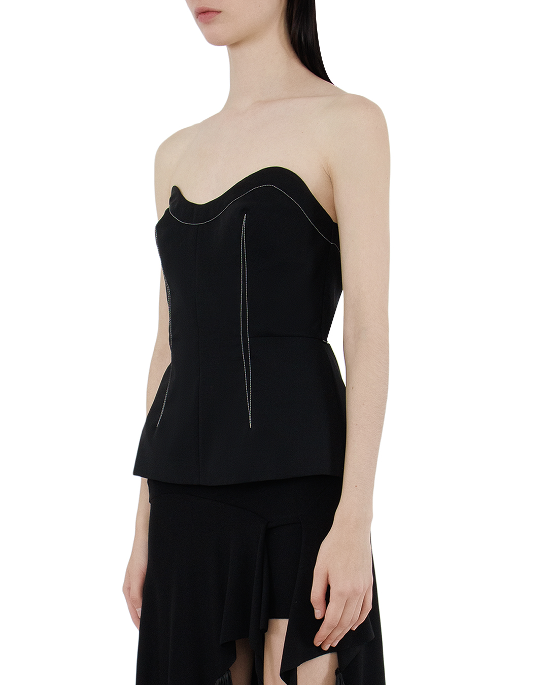 Этот топ — воплощение изысканности и утончённого стиля, идеально сочетающее классические и современные элементы. Выполненный из качественного материала глубокого чёрного цвета, он станет ярким акцентом в гардеробе. Корсажный крой с подчёркнутой линией талии создаёт скульптурный силуэт, выгодно подчёркивающий фигуру. Гладкий, сердцеобразный вырез декольте добавляет нотку романтичности и элегантности, точно играя на линии плеч и ключиц. Особого внимания заслуживает дизайн спинки с изысканной завязкой, которая добавляет декоративности и позволяет индивидуально регулировать посадку изделия. Это решение не только функционально, но и несёт визуальную уникальность. Чёткие акцентные швы, выполненные контрастной нитью, создают графический эффект и подчёркивают линию конструкции. Это добавляет изделию современности и визуальной глубины. Этот топ прекрасно дополнит как вечерний, так и изысканный повседневный образ, оставаясь в центре внимания благодаря своему утончённому стилю и эксцентричному дизайну.