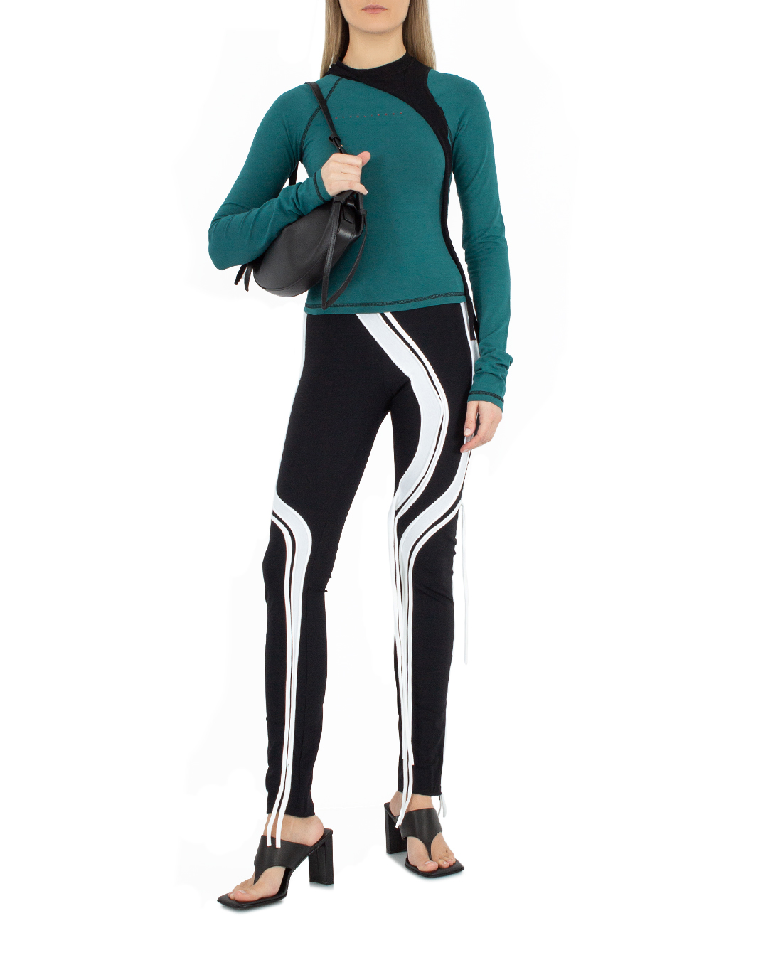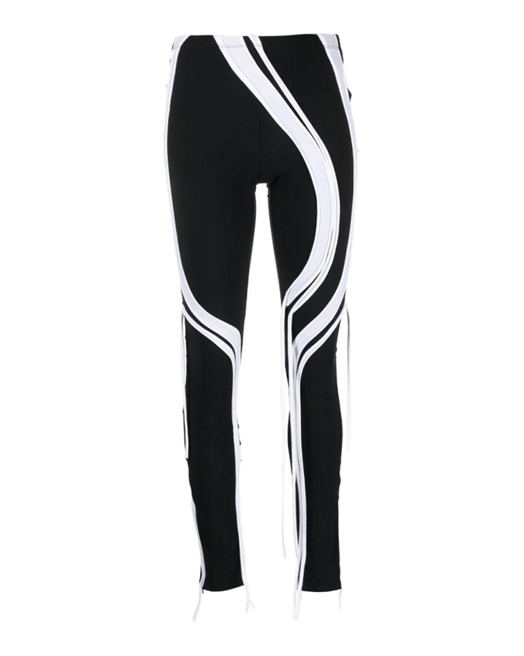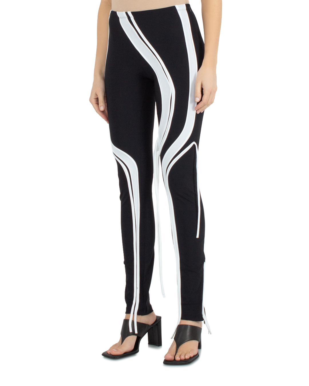 Леггинсы OTTOLINGER сшиты из эластичного материала черного цвета и оформлены белыми завязками разной длины. Нестандартное изделие облегающего силуэта с высокой посадкой на талии.
