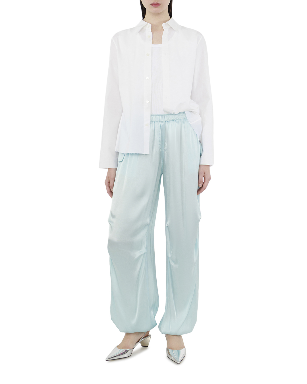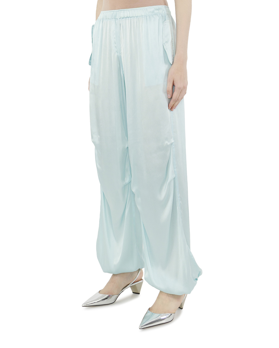 Эти брюки поражают своей элегантной минималистичностью и утончённой текстурой. Изготовленные из струящейся атласной ткани, они создают впечатление лёгкости и подвижности при каждом шаге, обеспечивая ниспадающий силуэт, который аккуратно подчеркивает изящество фигуры. Эластичный пояс мягко облегает талию, обеспечивая комфортную посадку и универсальность в ношении. Свободный крой и слегка зауженные книзу штанины заканчиваются собранными манжетами, что добавляет образу современную динамику и игривость. Боковые накладные карманы выполняют не только практическую, но и декоративную функцию, аккуратно сочетаясь с мягким переливом материала. Пастельный мятный оттенок материала добавляет изысканную свежесть, создавая атмосферу безмятежности и утончённости. Эти брюки идеально впишутся в гардероб для создания как повседневных, так и вечерних образов, придавая образу легкость и шарм.