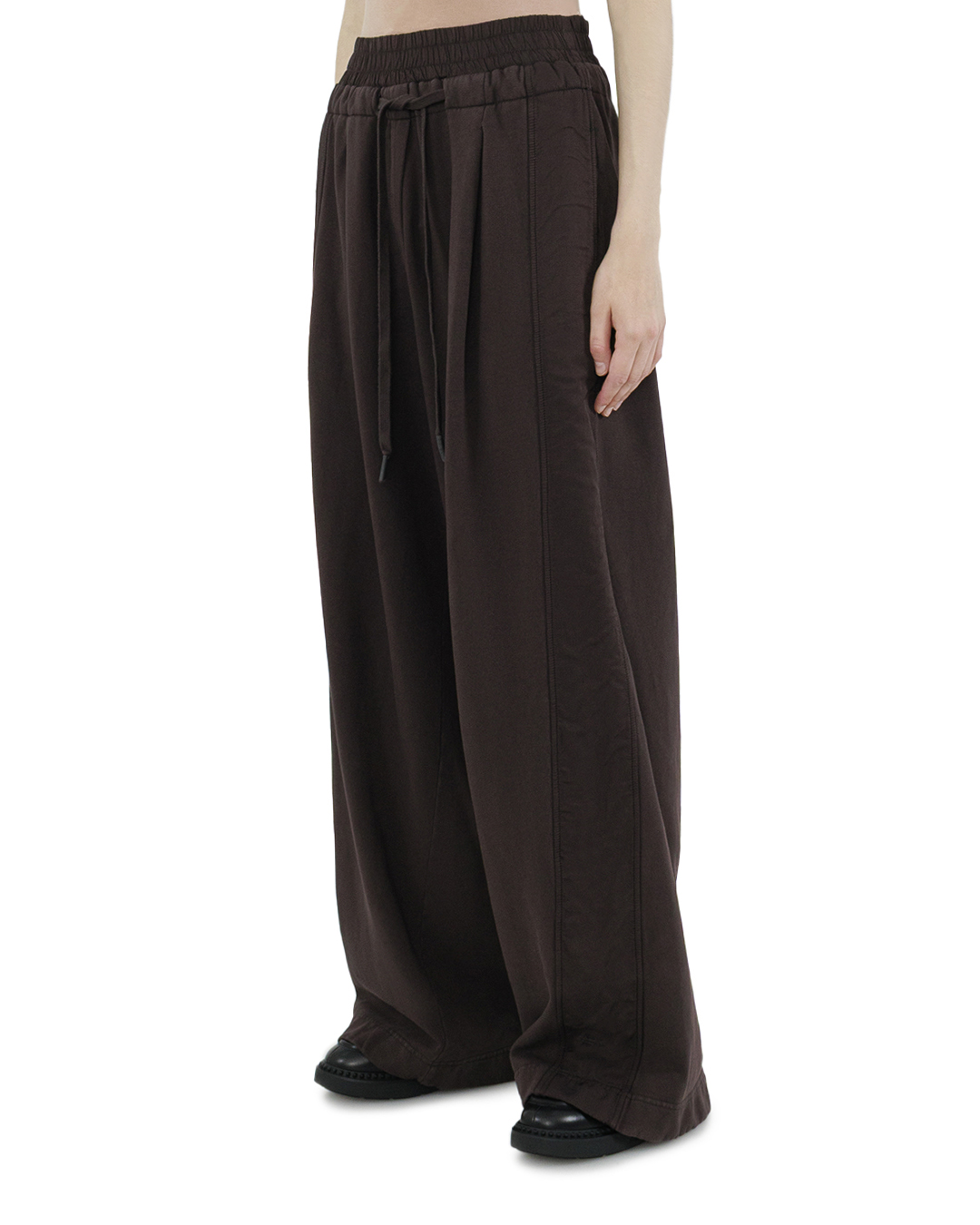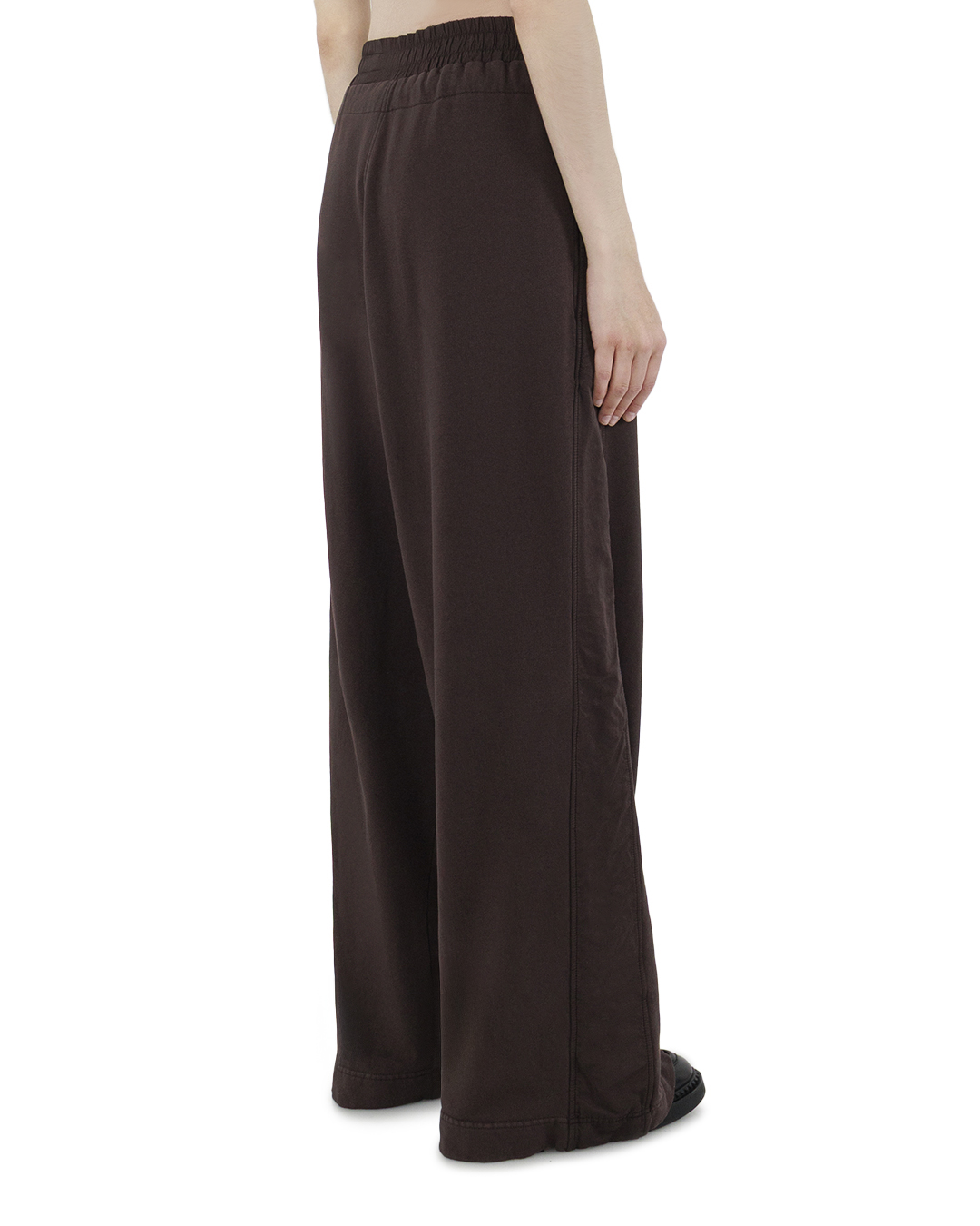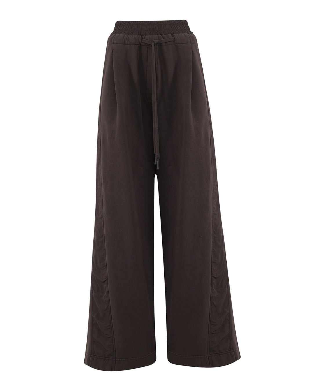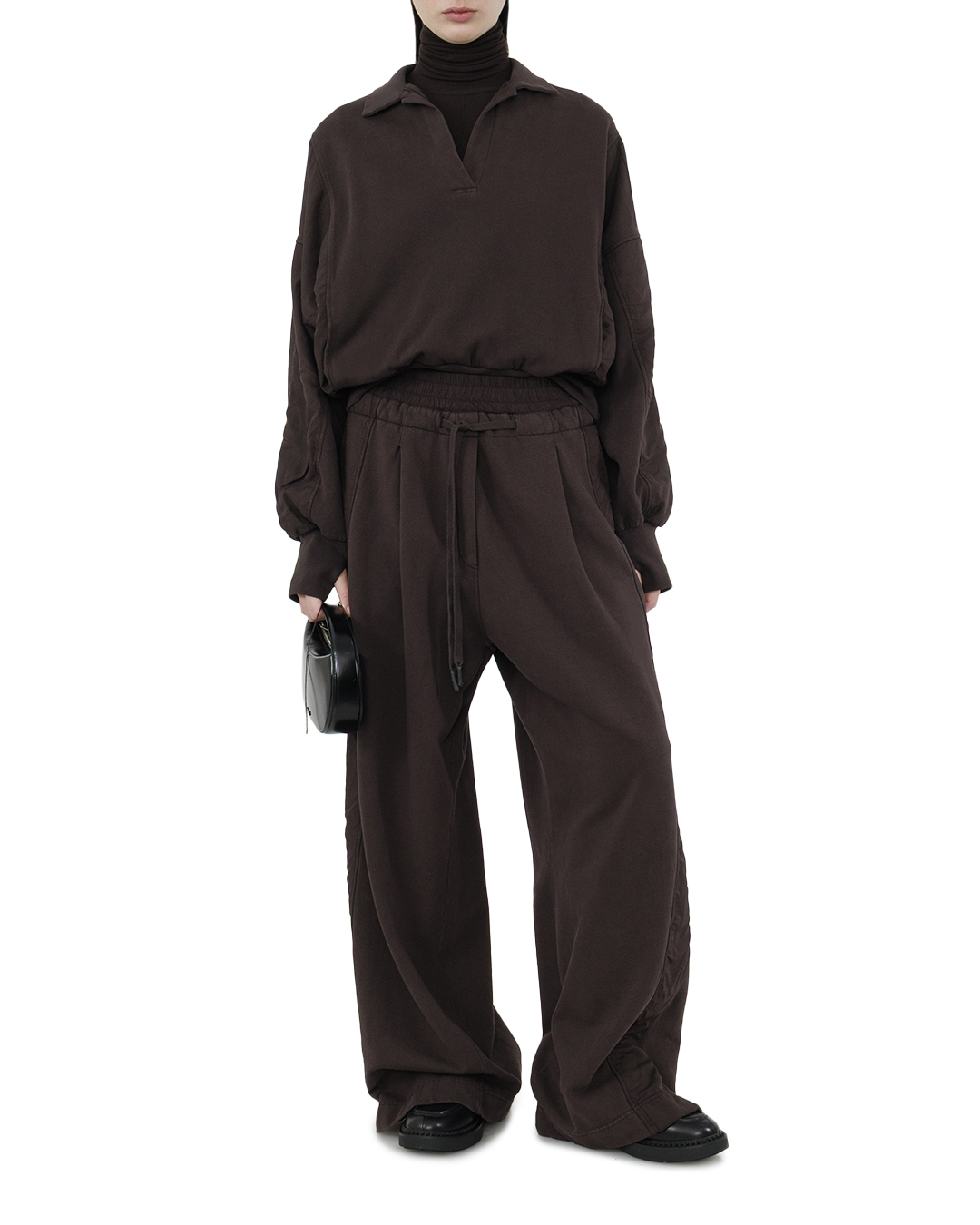 Эти брюки представляют собой прекрасный пример утончённой сдержанности и современного дизайна, идеально подходящие для создания гармоничного и стильного образа. Выполненные из мягкой ткани глубокого коричневого оттенка, они обеспечивают комфорт и свободу движений. Широкий фасон создает элегантный и немного драматичный силуэт, который визуально вытягивает ноги и добавляет лёгкости всему образу. Высокая посадка с эластичным поясом и удобной завязкой регулирует комфорт и позволяет подчеркнуть линию талии, придавая фигуре совершенные пропорции. Плавные линии брючин обеспечивают непринуждённую посадку и свободу движения, идеально сочетаются с обувью на плоском ходу для создания расслабленного стиля или с каблуками для более утончённого образа. Тщательно проработанные швы и качественная отделка подчёркивают внимание к деталям, гарантируя долговечность и стойкость ткани к ежедневному износу. Эти брюки — воплощение универсальности и стиля, идеально интегрируется в любом гардеробе, позволяя создавать выразительные и модные образы в различных стилевых направлениях.
