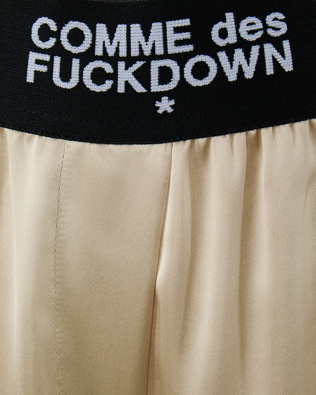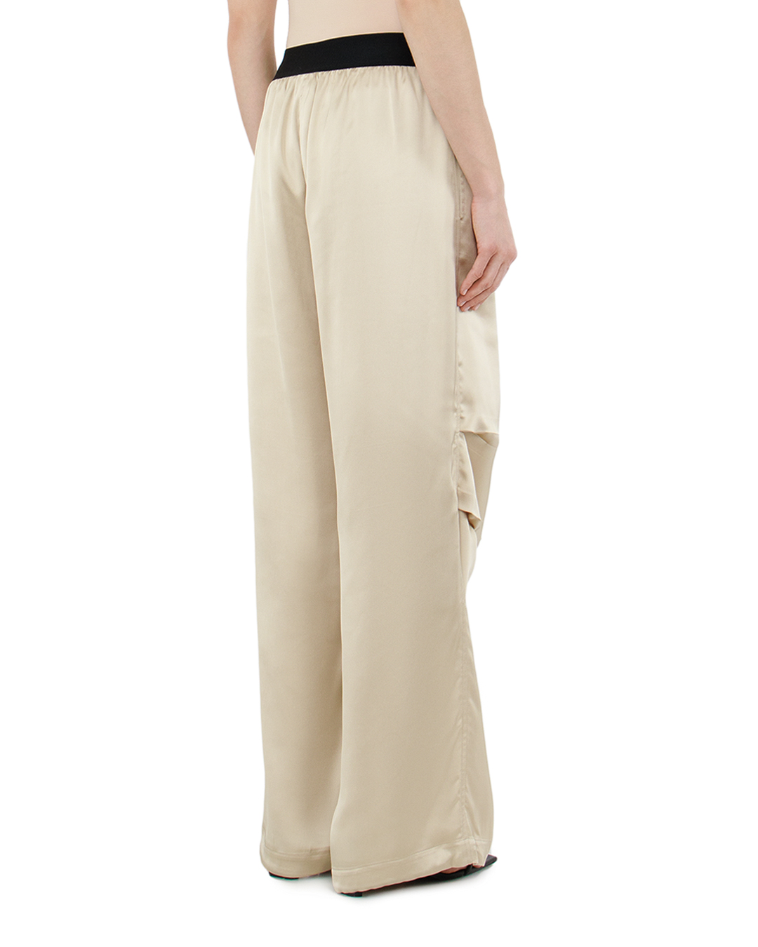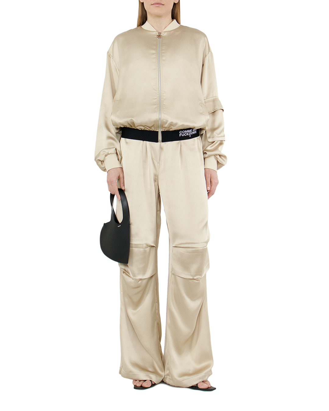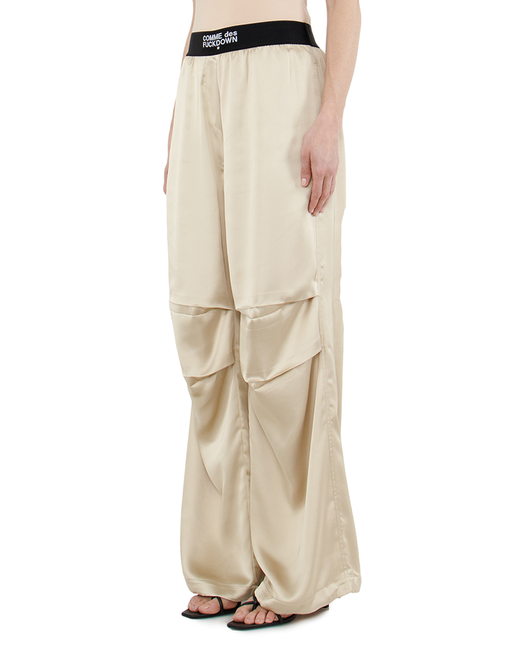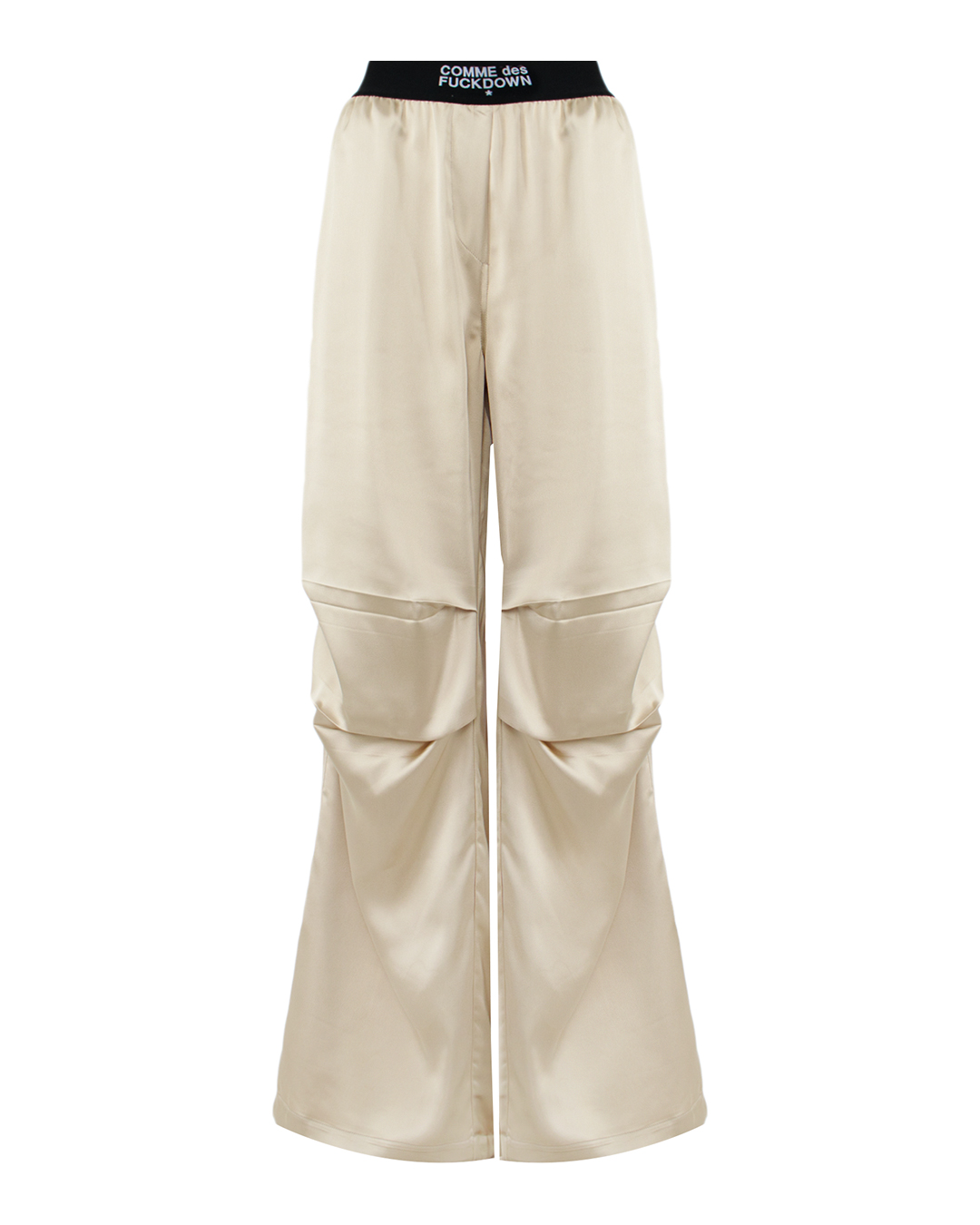 Атласные брюки макси золотистого цвета — идеальный элемент для создания элегантного и стильного образа. Прямой крой обеспечивает комфорт и свободу движений, а блестящая текстура ткани добавляет изысканности. Брюки оснащены контрастной резинкой черного цвета на талии, украшенной логотипом бренда, что придает им современный и модный вид. Сборки на коленях добавляют интересный акцент к дизайну, подчеркивая индивидуальность и создавая эффектный силуэт. Эти брюки отлично сочетаются с блузами, топами или жакетами, позволяя создавать как повседневные, так и вечерние образы. Добавьте их в свой гардероб для создания стильных комплектов, которые будут притягивать взгляды!