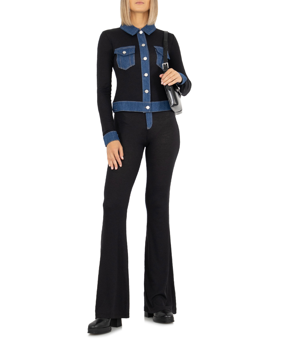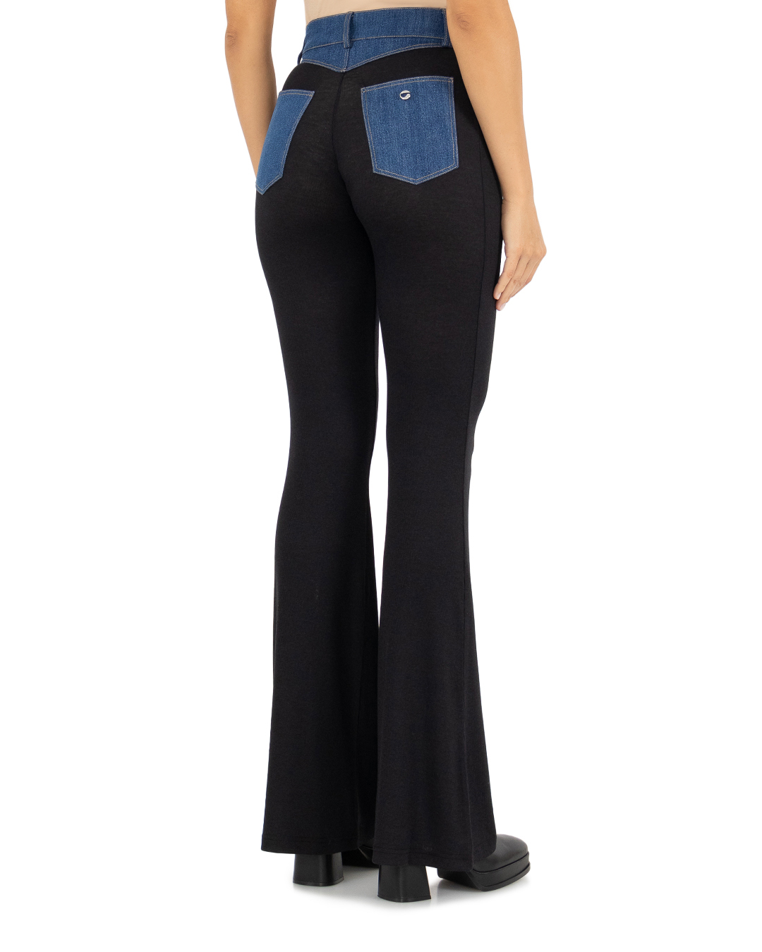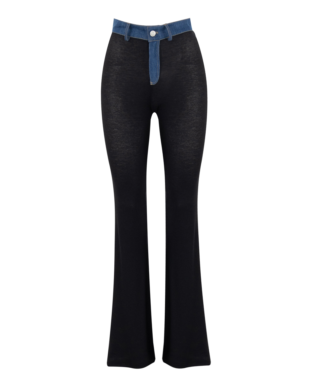 Сочетание спортивной и уличной одежды, эти тонкие, эластичные, черные брюки включают джинсовый пояс и скрытую молнию. Они имеют расклешенные штанины и высокую посадку на талии для привлекательного стиля, который удлиняет силуэт.